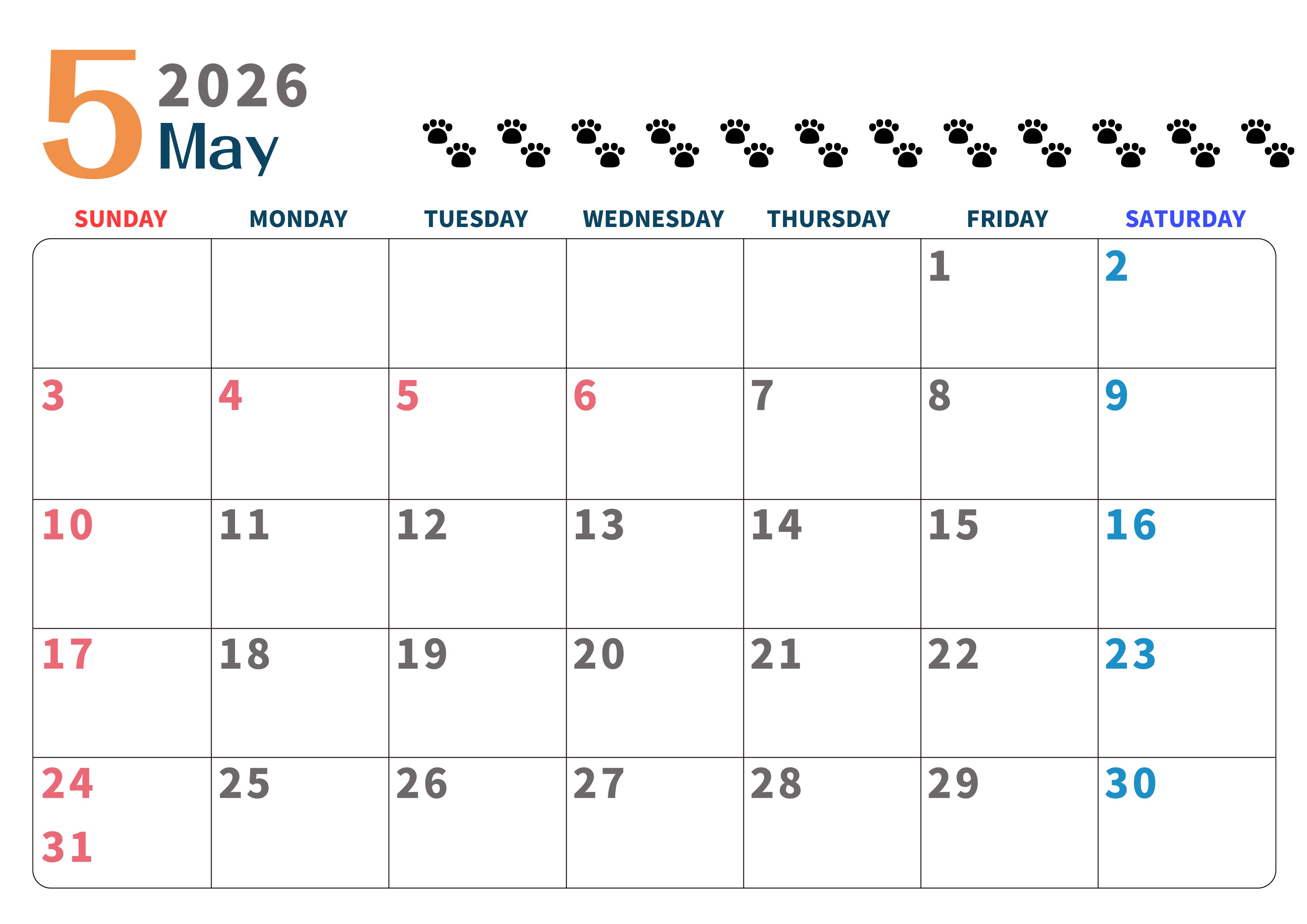 2026年・無料のカレンダーテンプレート 2026年5月カレンダーは横型日曜始まりで猫の黒い肉球がゆるかわいいほっこりするイラストつき無料素材♪(2026-01220500) 素材状デザイン王 2025年4月9日 2026年5月カレンダーは横型日曜始まりで猫の黒い肉球がゆるかわいいほっこりするイラストつき無料素材です。ダウンロードして毎日の癒しアイテムとして壁に貼って使うのをおすすめします♪(2026-01220500) かわいい 5月 猫 横型のカレンダー 日曜始まり カレンダーデザイン-0122
