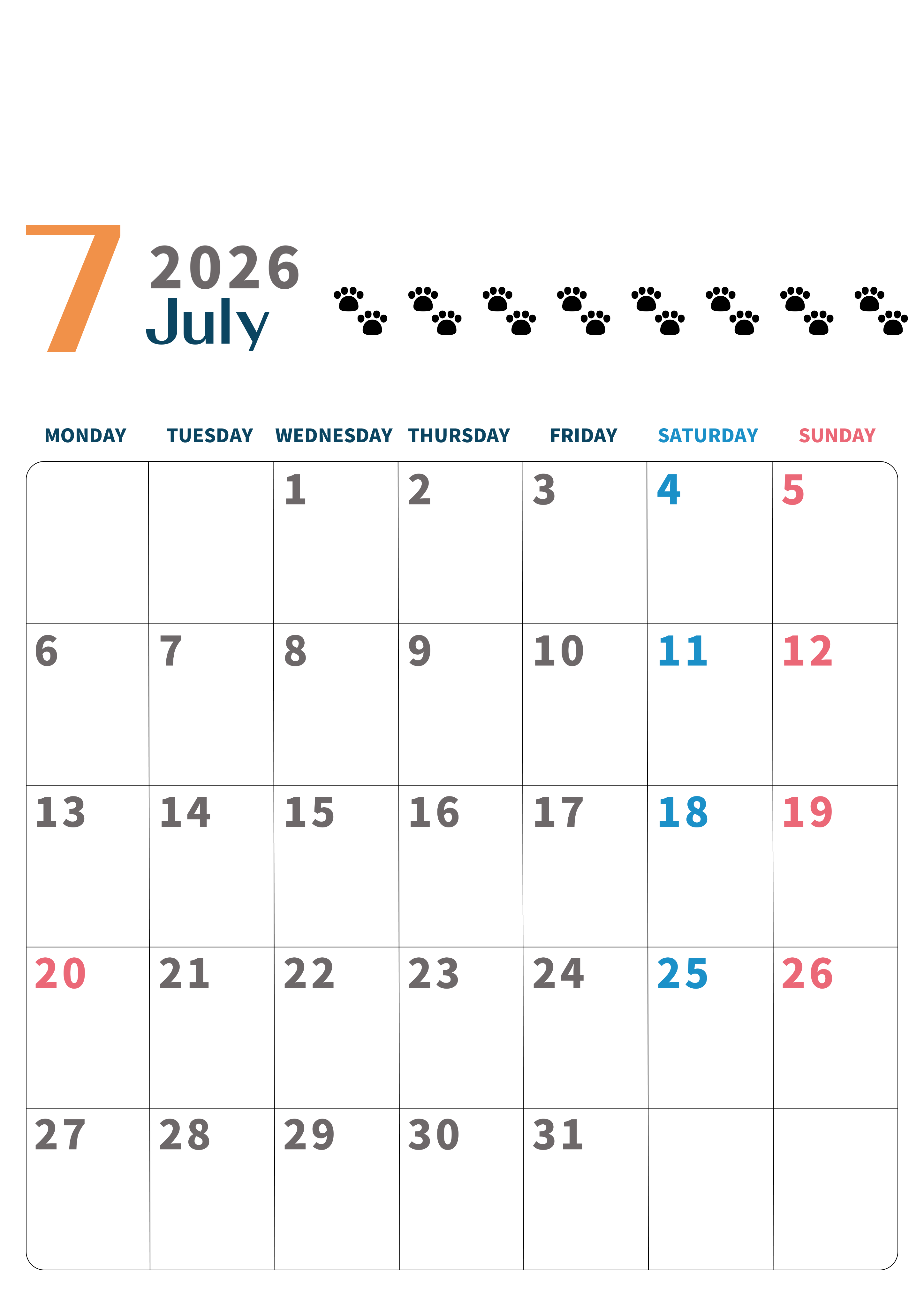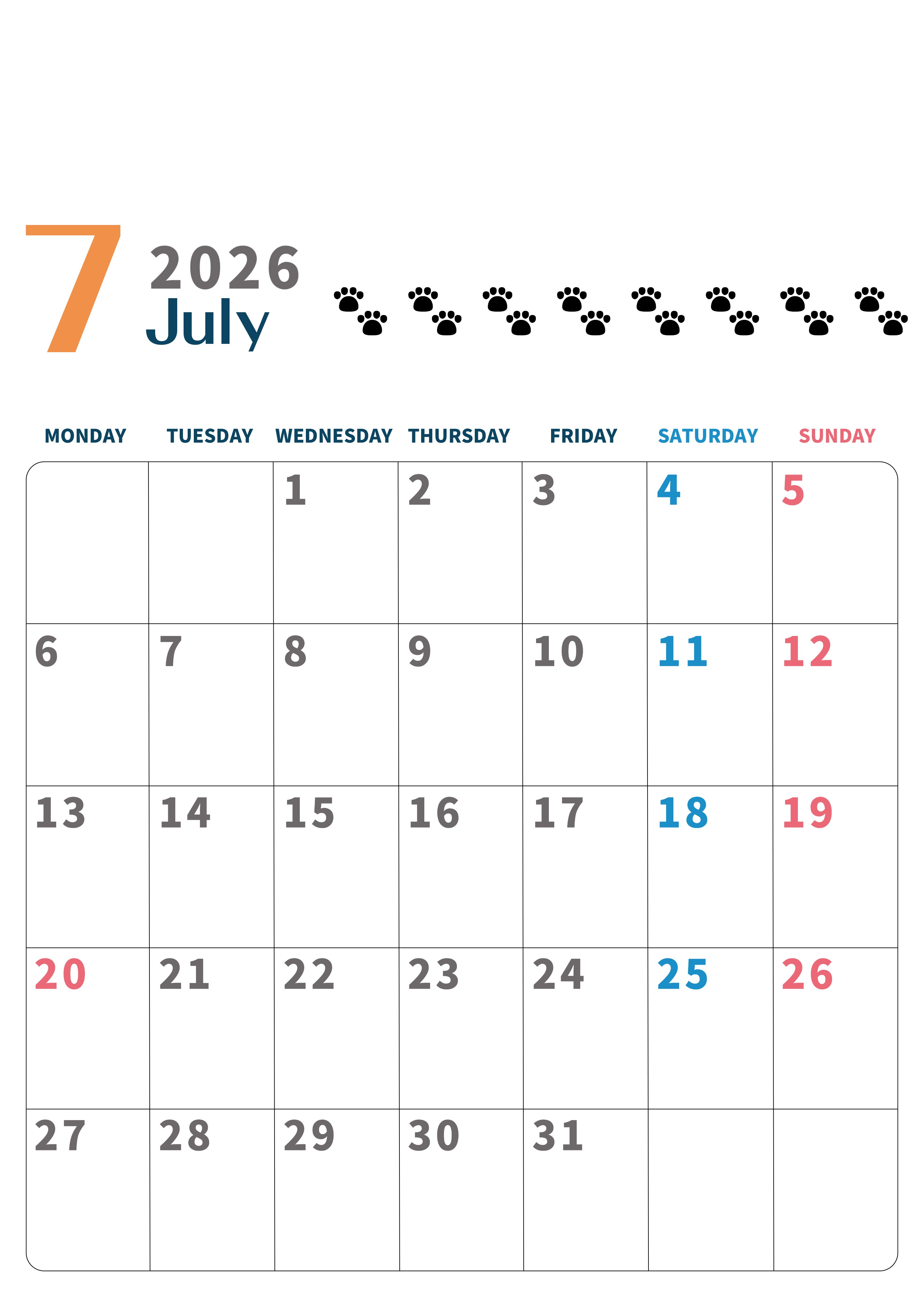 2026年7月カレンダーは縦型月曜始まり で猫の黒い肉球がゆるかわいいほっこりするイラストつき無料素材♪(2026-01220711)