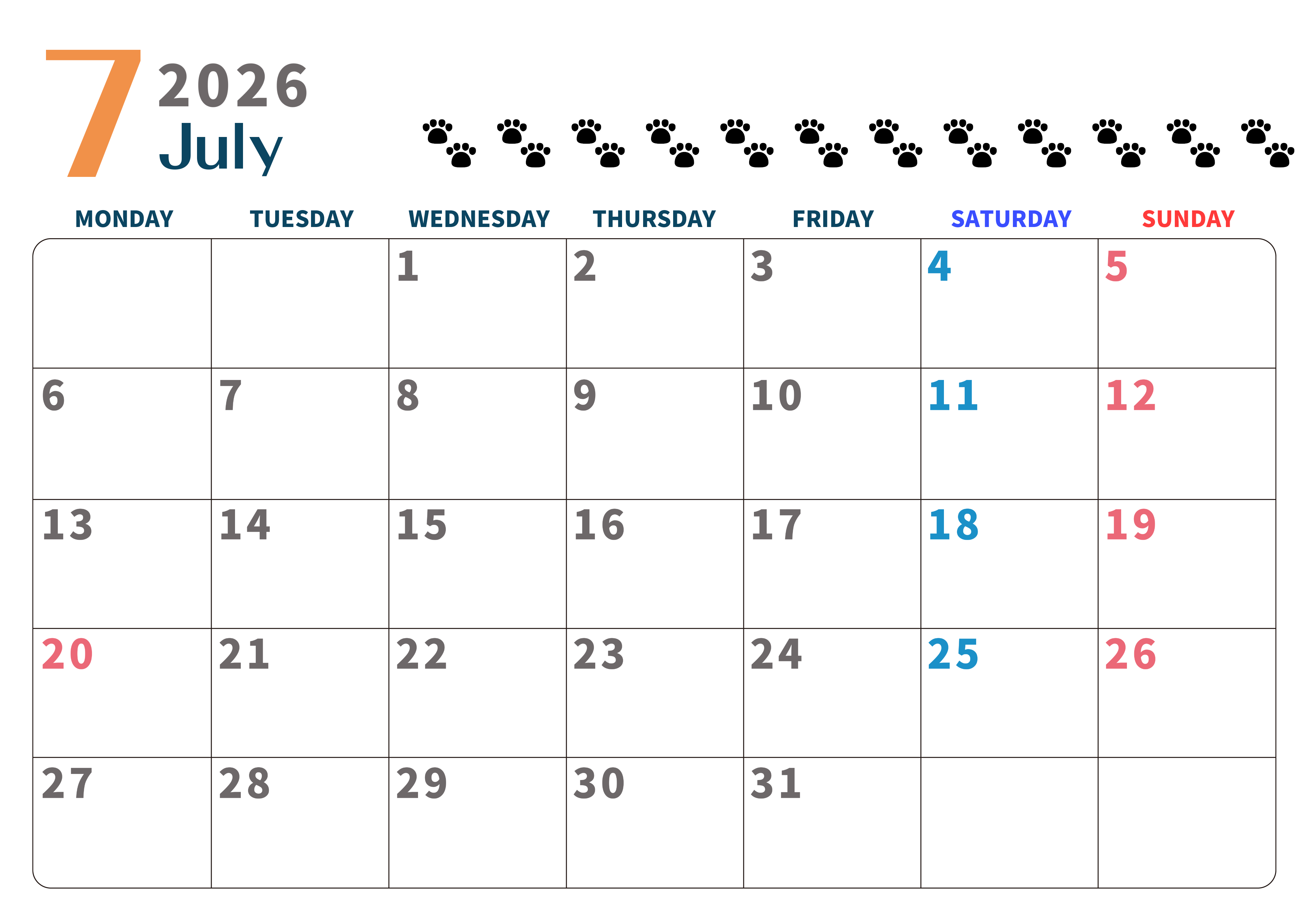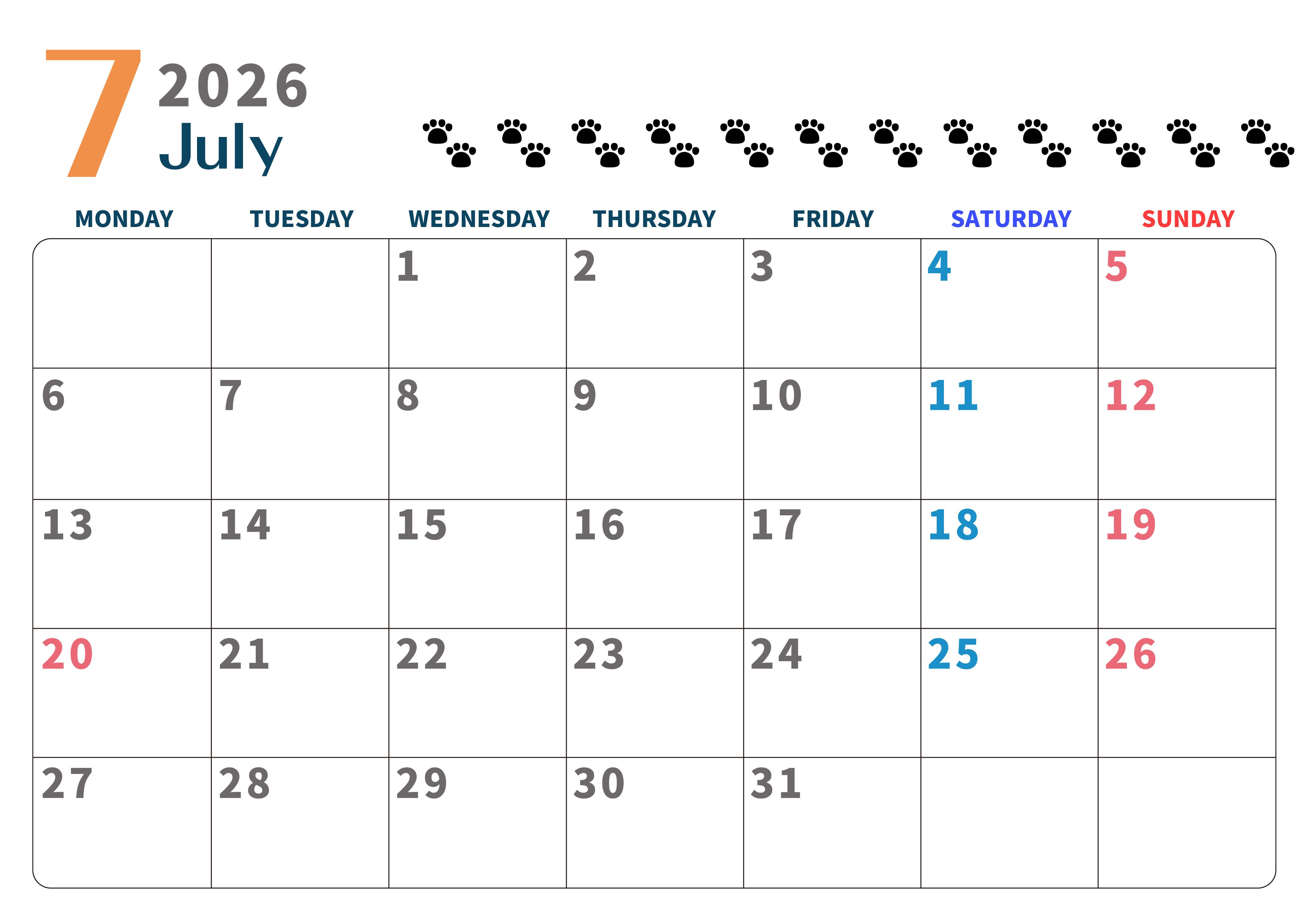 2026年7月カレンダーは横型月曜始まりで猫の黒い肉球がゆるかわいいほっこりするイラストつき無料素材です。ダウンロードして毎日の癒しアイテムとして壁に貼って使うのをおすすめします♪(2026-01220701)