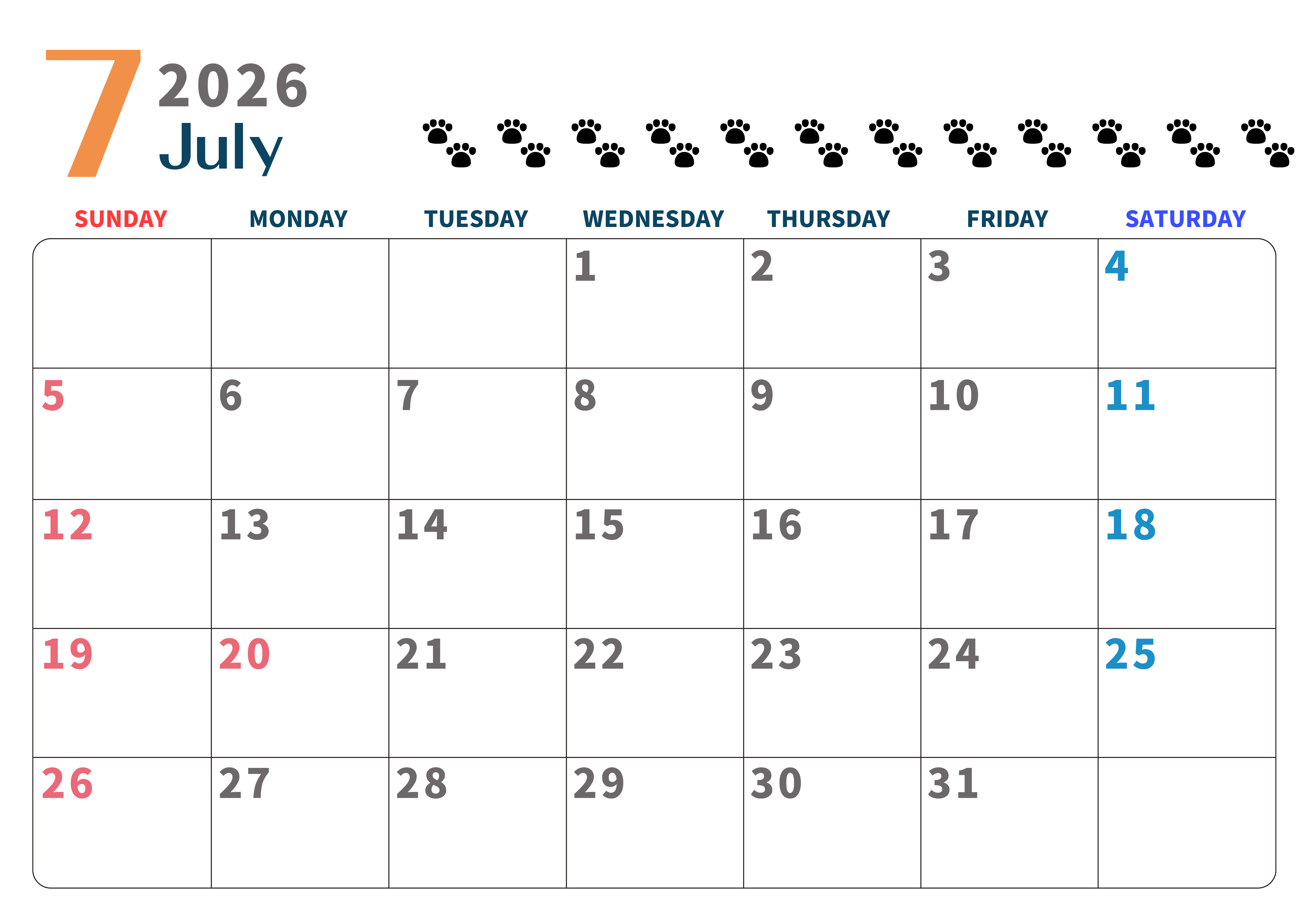 2026年・無料のカレンダーテンプレート 2026年7月カレンダーは横型日曜始まりで猫の黒い肉球がゆるかわいいほっこりするイラストつき無料素材♪(2026-01220700) 素材状デザイン王 2025年4月9日 2026年7月カレンダーは横型日曜始まりで猫の黒い肉球がゆるかわいいほっこりするイラストつき無料素材です。ダウンロードして毎日の癒しアイテムとして壁に貼って使うのをおすすめします♪(2026-01220700) かわいい 7月 猫 横型のカレンダー 日曜始まり カレンダーデザイン-0122