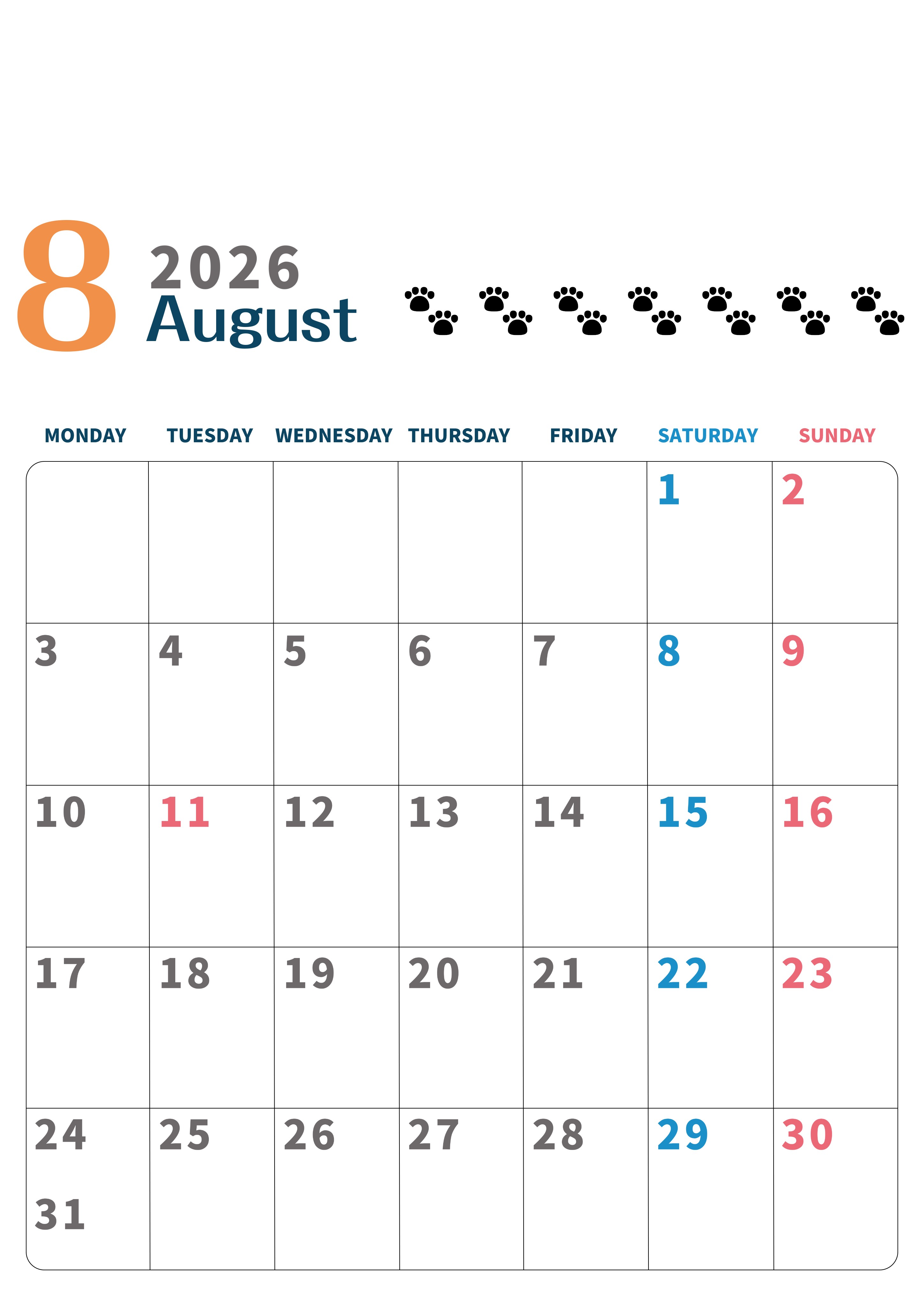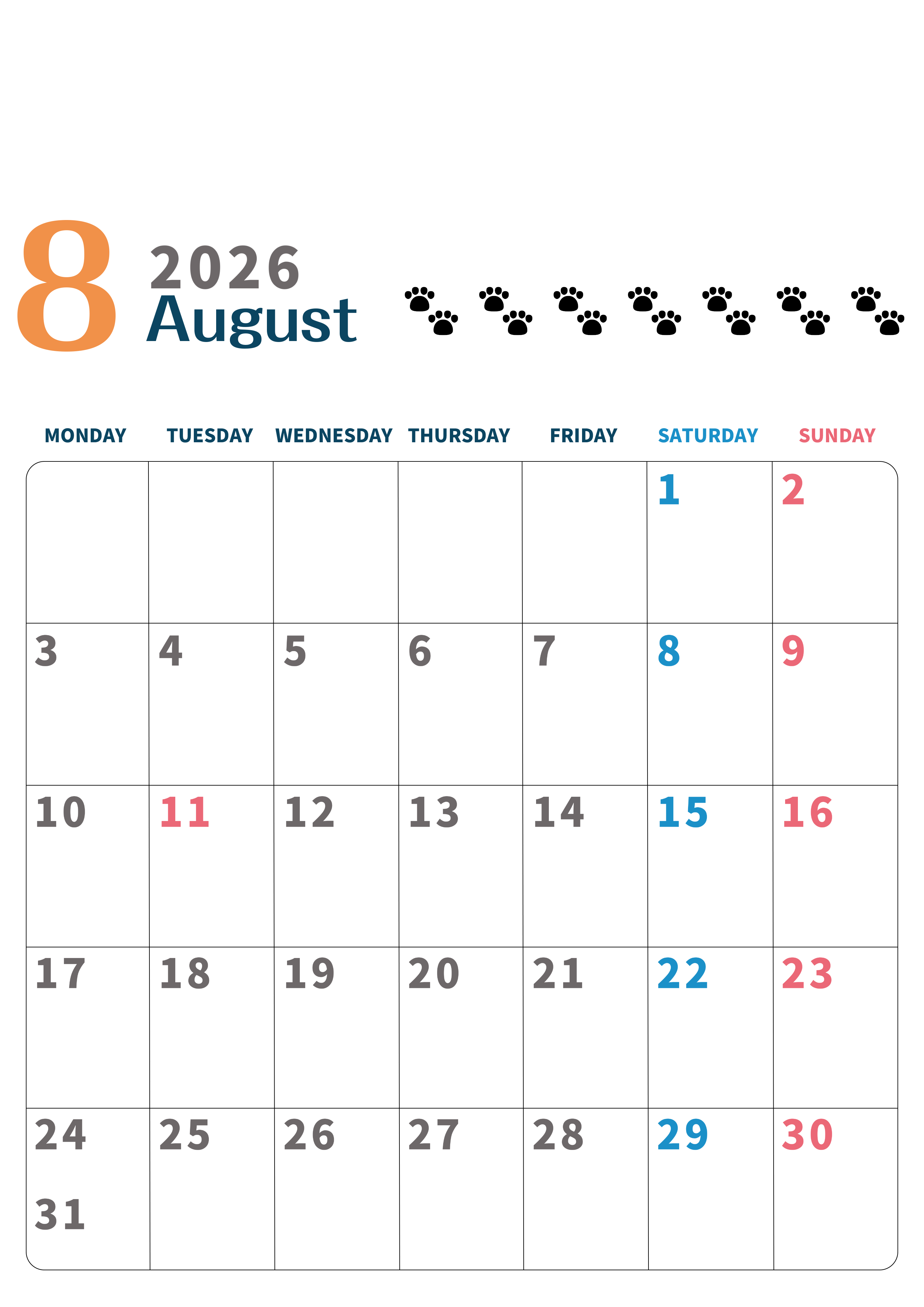 2026年・無料のカレンダーテンプレート 2026年8月カレンダーは縦型月曜始まりで猫の黒い肉球がゆるかわいいほっこりするイラストつき無料素材♪(2026-01220811) 素材状デザイン王 2025年4月9日 2026年8月カレンダーは縦型月曜始まりで猫の黒い肉球がゆるかわいいほっこりするイラストつき無料素材です。ダウンロードして毎日の癒しアイテムとして壁に貼って使うのをおすすめします♪(2026-01220811) かわいい 8月 猫 縦型のカレンダー 月曜始まり カレンダーデザイン-0122