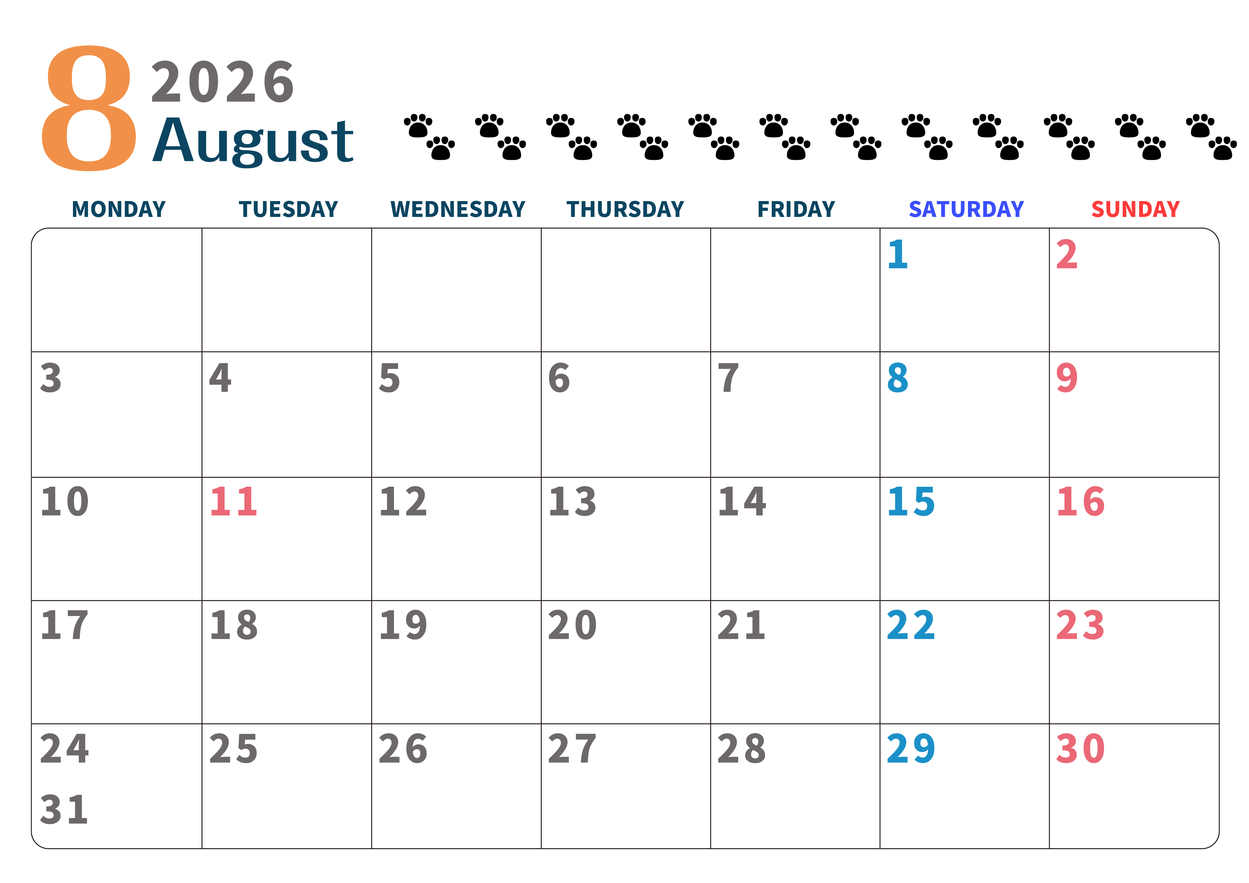2026年・無料のカレンダーテンプレート 2026年8月カレンダーは横型月曜始まりで猫の黒い肉球がゆるかわいいほっこりするイラストつき無料素材♪(2026-01220801) 素材状デザイン王 2025年4月9日 2026年8月カレンダーは横型月曜始まりで猫の黒い肉球がゆるかわいいほっこりするイラストつき無料素材です。ダウンロードして毎日の癒しアイテムとして壁に貼って使うのをおすすめします♪(2026-01220801) かわいい 8月 猫 横型のカレンダー 月曜始まり カレンダーデザイン-0122