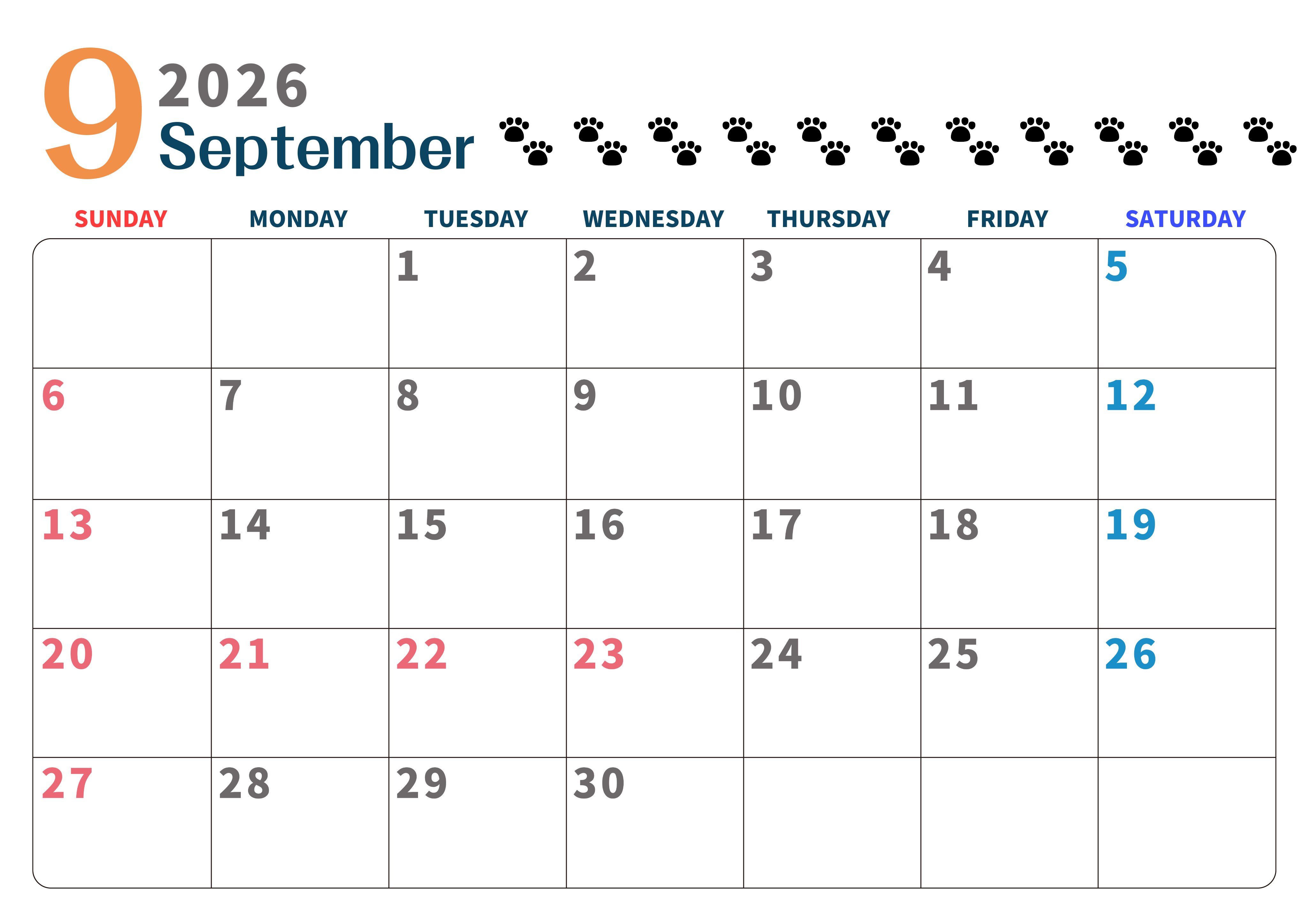2026年・無料のカレンダーテンプレート 2026年9月カレンダーは横型日曜始まりで猫の黒い肉球がゆるかわいいほっこりするイラストつき無料素材♪(2026-01220900) 素材状デザイン王 2025年4月9日 2026年9月カレンダーは横型日曜始まりで猫の黒い肉球がゆるかわいいほっこりするイラストつき無料素材です。ダウンロードして毎日の癒しアイテムとして壁に貼って使うのをおすすめします♪(2026-01220900) かわいい 9月 猫 横型のカレンダー 日曜始まり カレンダーデザイン-0122