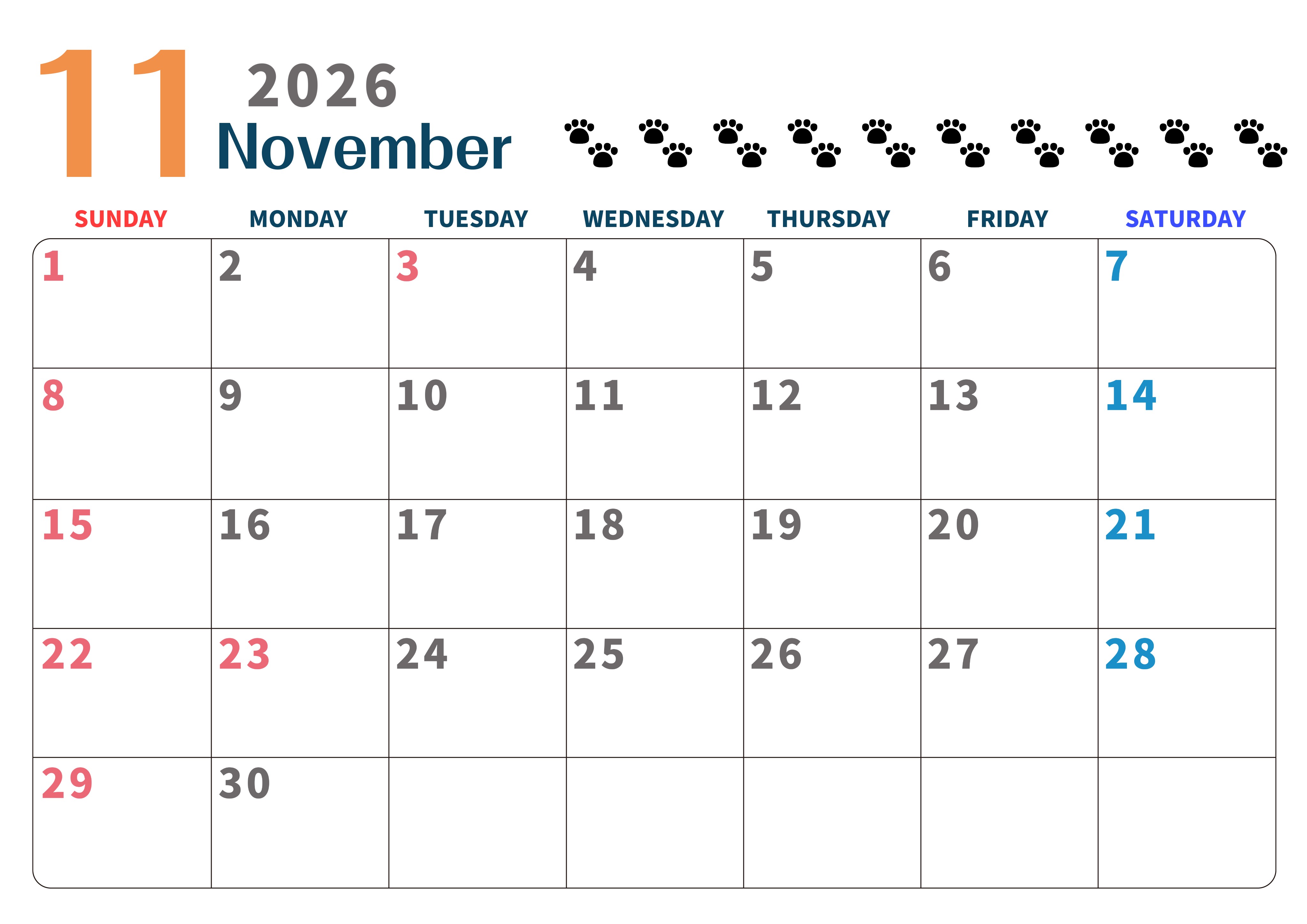 2026年・無料のカレンダーテンプレート 2026年11月カレンダーは横型日曜始まりで猫の黒い肉球がゆるかわいいほっこりするイラストつき無料素材♪(2026-01221100) 素材状デザイン王 2025年4月9日 2026年11月カレンダーは横型日曜始まりで猫の黒い肉球がゆるかわいいほっこりするイラストつき無料素材です。ダウンロードして毎日の癒しアイテムとして壁に貼って使うのをおすすめします♪(2026-01221100) かわいい 11月 猫 横型のカレンダー 日曜始まり カレンダーデザイン-0122