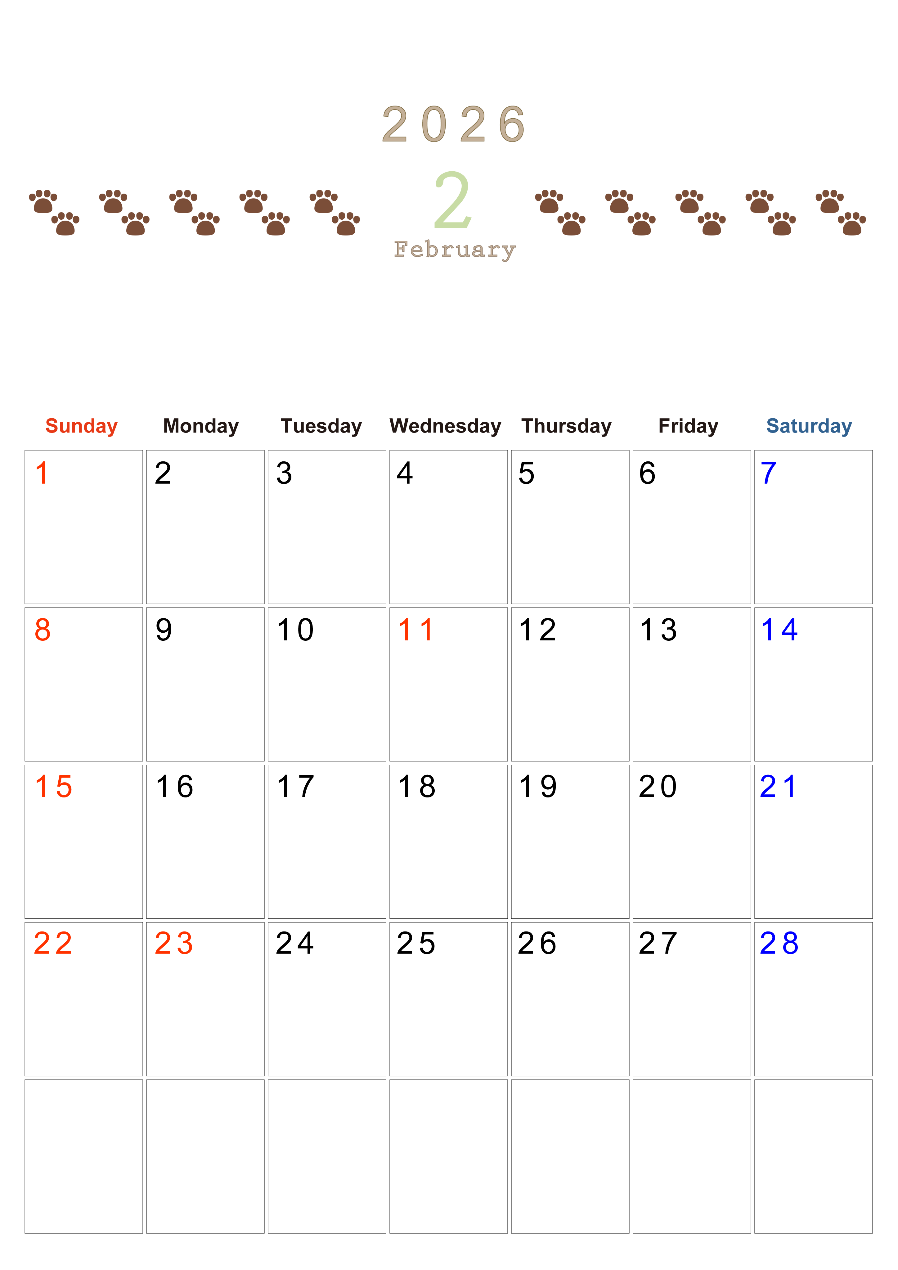 2026年・無料のカレンダーテンプレート 2026年2月カレンダーは縦型日曜始まりで猫の自由きままな足あとがおしゃれかわいいデザインなのでおすすめ:無料(2026-01230210) 素材状デザイン王 2025年4月9日 2026年2月カレンダーは縦型日曜始まりで猫の自由きままな足あとがおしゃれかわいいデザインかつ無料なのでダウンロードをおすすめします。自由に計画を記入しやすい使いやすいカレンダーを探している人にぴったりです。(2026-01230210) おしゃれ 2月 猫 縦型のカレンダー 日曜始まり カレンダーデザイン-0123