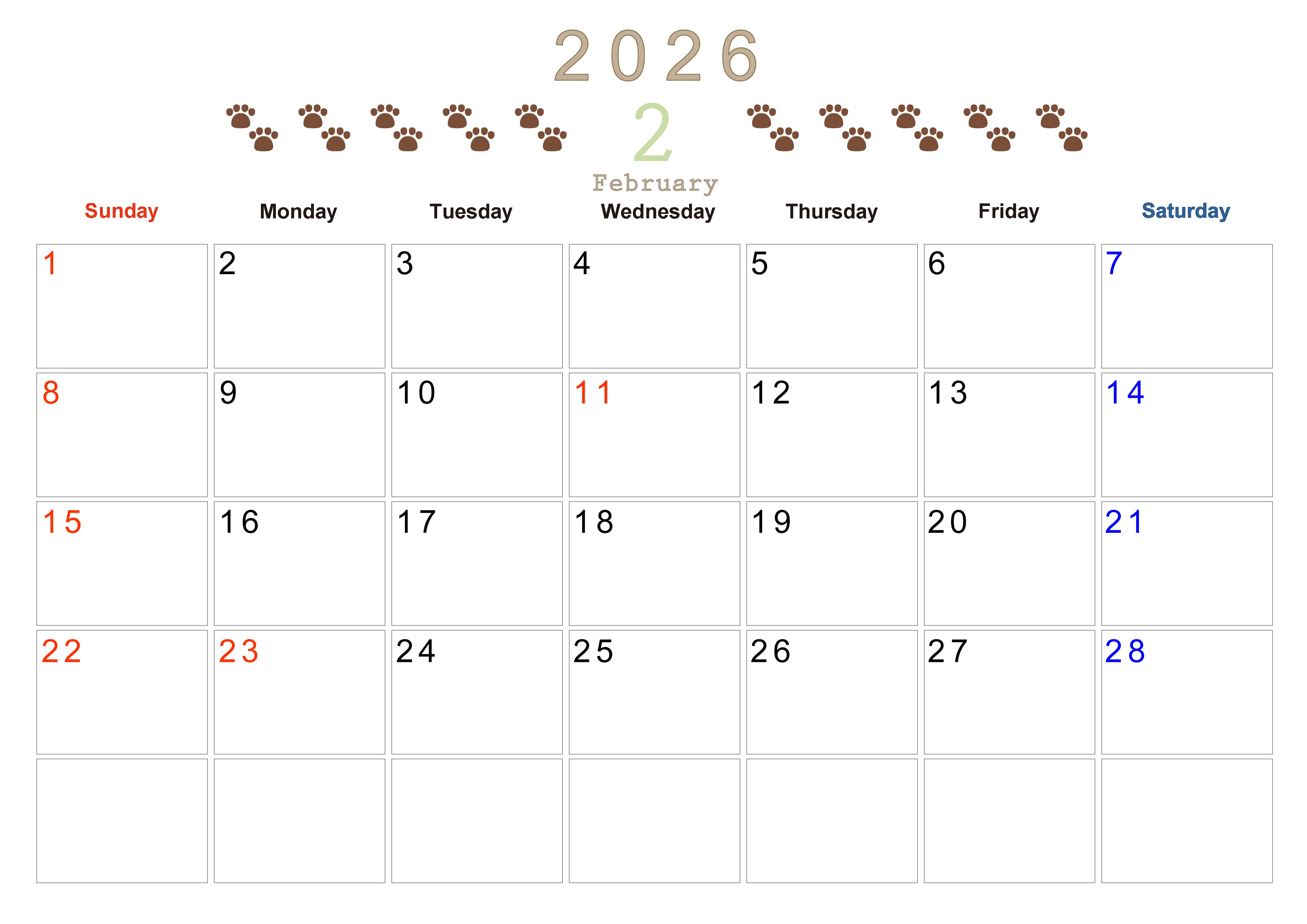 2026年2月カレンダーは横型日曜始まりで猫の自由きままな足あとがおしゃれかわいいデザインなのでおすすめ:無料(2026-01230200)
