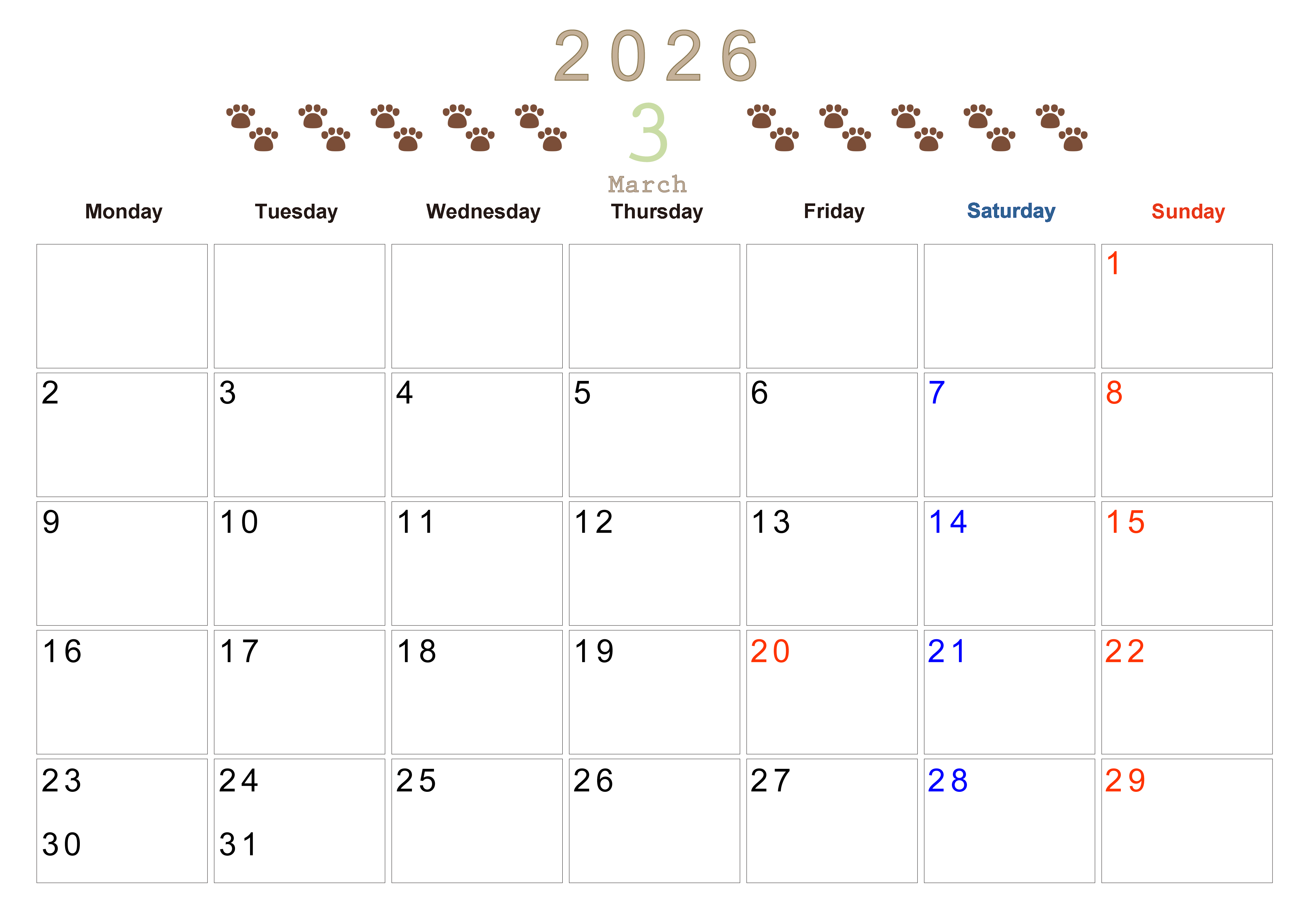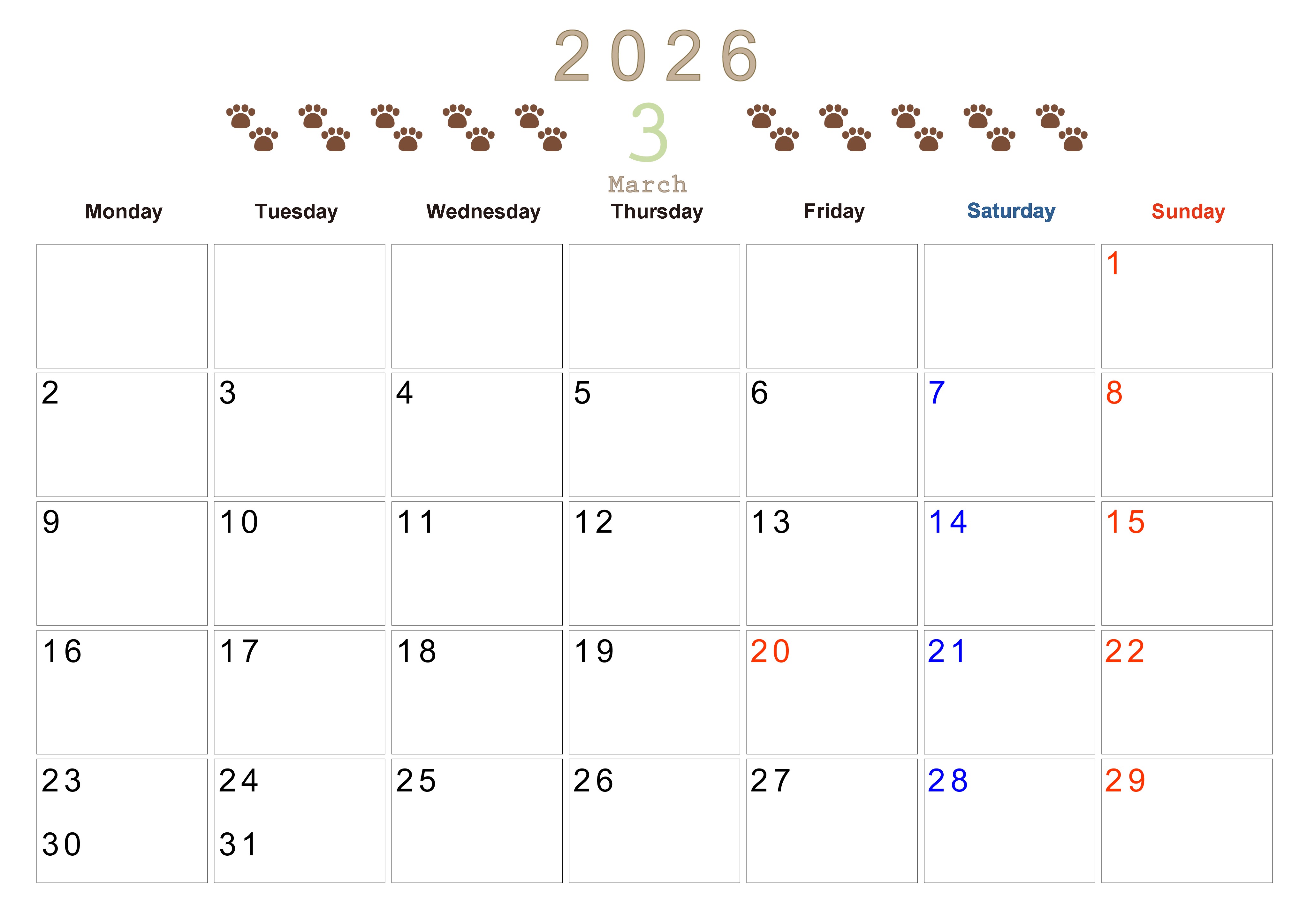 2026年・無料のカレンダーテンプレート 2026年3月カレンダーは横型月曜始まりで猫の自由きままな足あとがおしゃれかわいいデザインなのでおすすめ:無料(2026-01230301) 素材状デザイン王 2025年4月9日 2026年3月カレンダーは横型月曜始まりで猫の自由きままな足あとがおしゃれかわいいデザインかつ無料なのでダウンロードをおすすめします。自由に計画を記入しやすい使いやすいカレンダーを探している人にぴったりです。(2026-01230301) おしゃれ 3月 猫 横型のカレンダー 月曜始まり カレンダーデザイン-0123