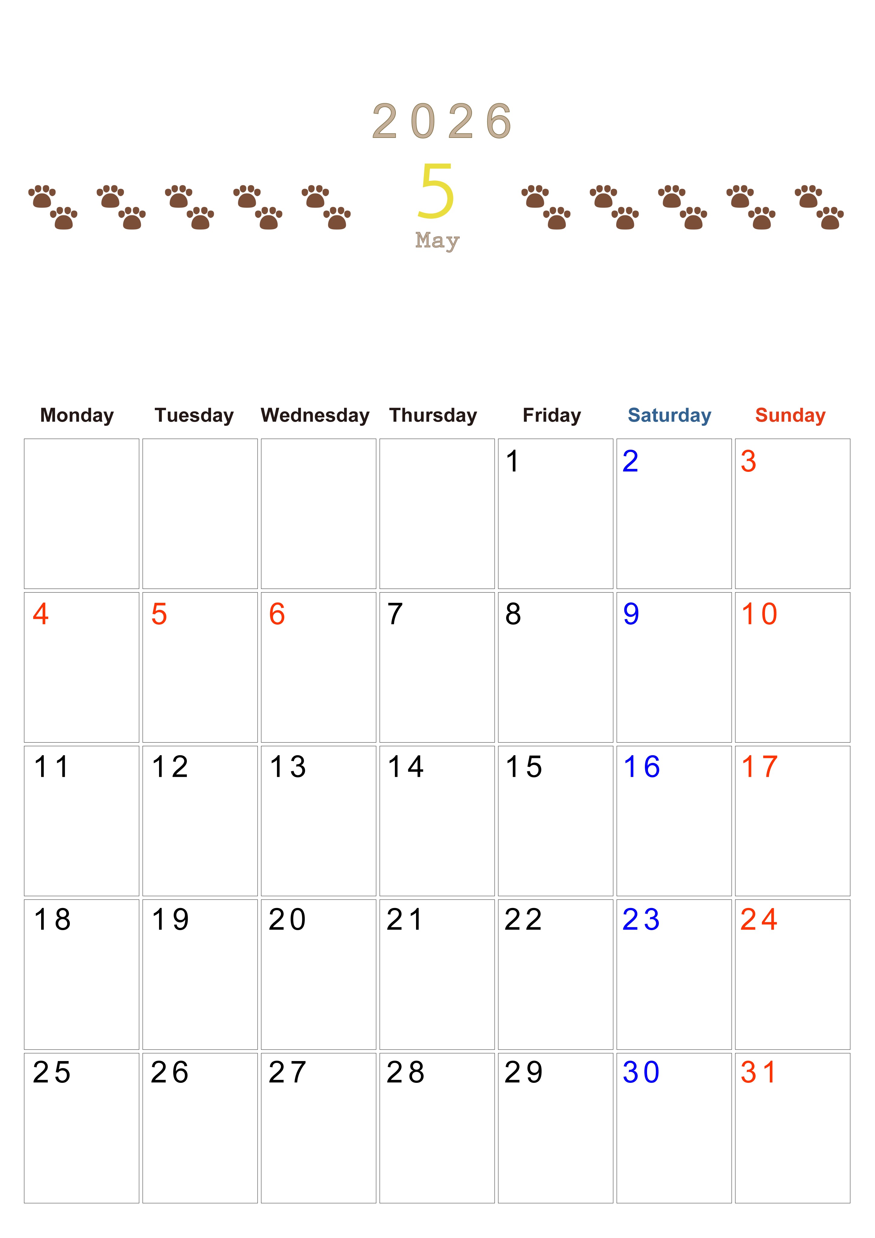 2026年・無料のカレンダーテンプレート 2026年5月カレンダーは縦型月曜始まりで猫の自由きままな足あとがおしゃれかわいいデザインなのでおすすめ:無料(2026-01230511) 素材状デザイン王 2025年4月9日 2026年5月カレンダーは縦型月曜始まりで猫の自由きままな足あとがおしゃれかわいいデザインかつ無料なのでダウンロードをおすすめします。自由に計画を記入しやすい使いやすいカレンダーを探している人にぴったりです。(2026-01230511) おしゃれ 5月 猫 縦型のカレンダー 月曜始まり カレンダーデザイン-0123