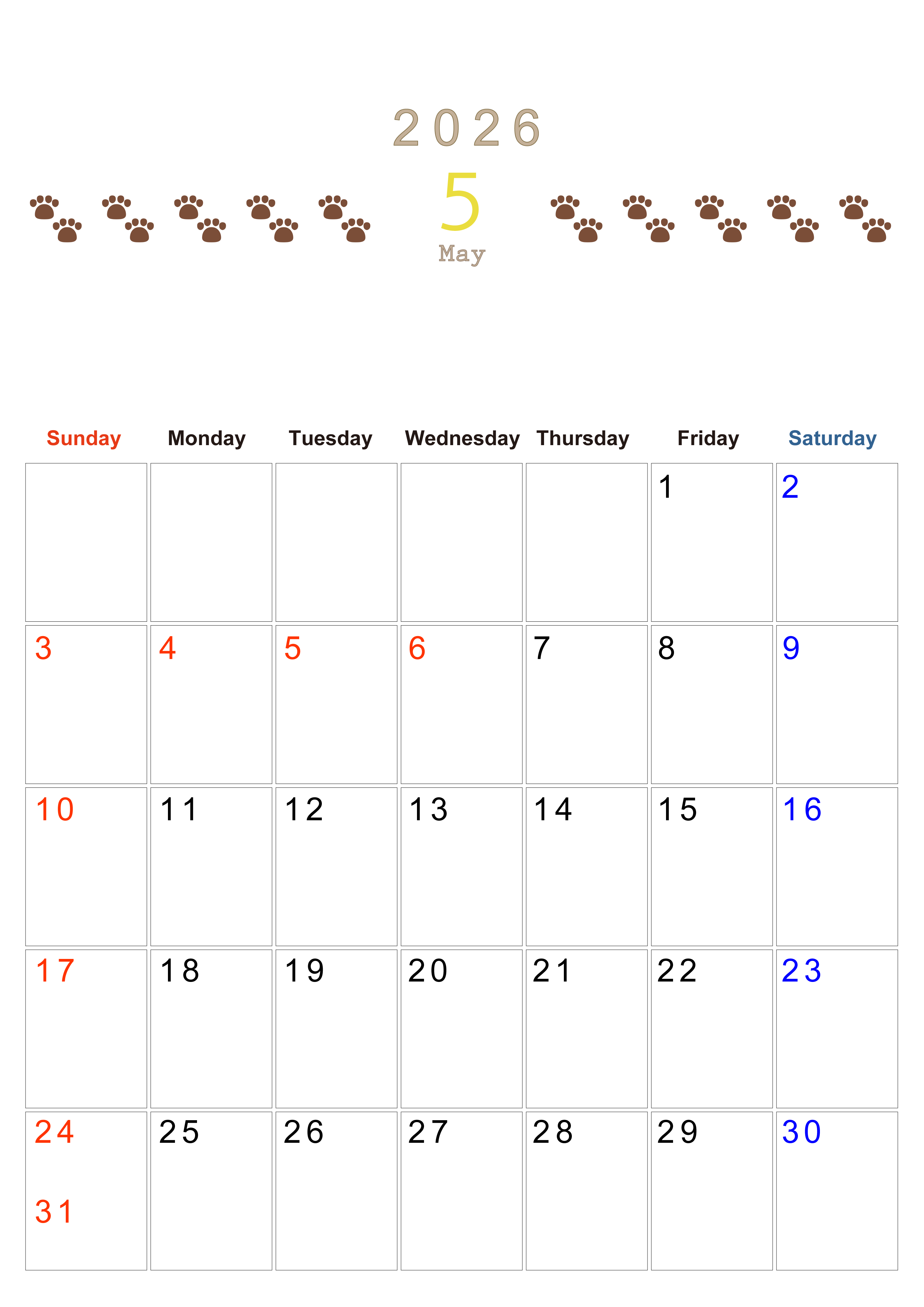 2026年・無料のカレンダーテンプレート 2026年5月カレンダーは縦型日曜始まりで猫の自由きままな足あとがおしゃれかわいいデザインなのでおすすめ:無料(2026-01230510) 素材状デザイン王 2025年4月9日 2026年5月カレンダーは縦型日曜始まりで猫の自由きままな足あとがおしゃれかわいいデザインかつ無料なのでダウンロードをおすすめします。自由に計画を記入しやすい使いやすいカレンダーを探している人にぴったりです。(2026-01230510) おしゃれ 5月 猫 縦型のカレンダー 日曜始まり カレンダーデザイン-0123