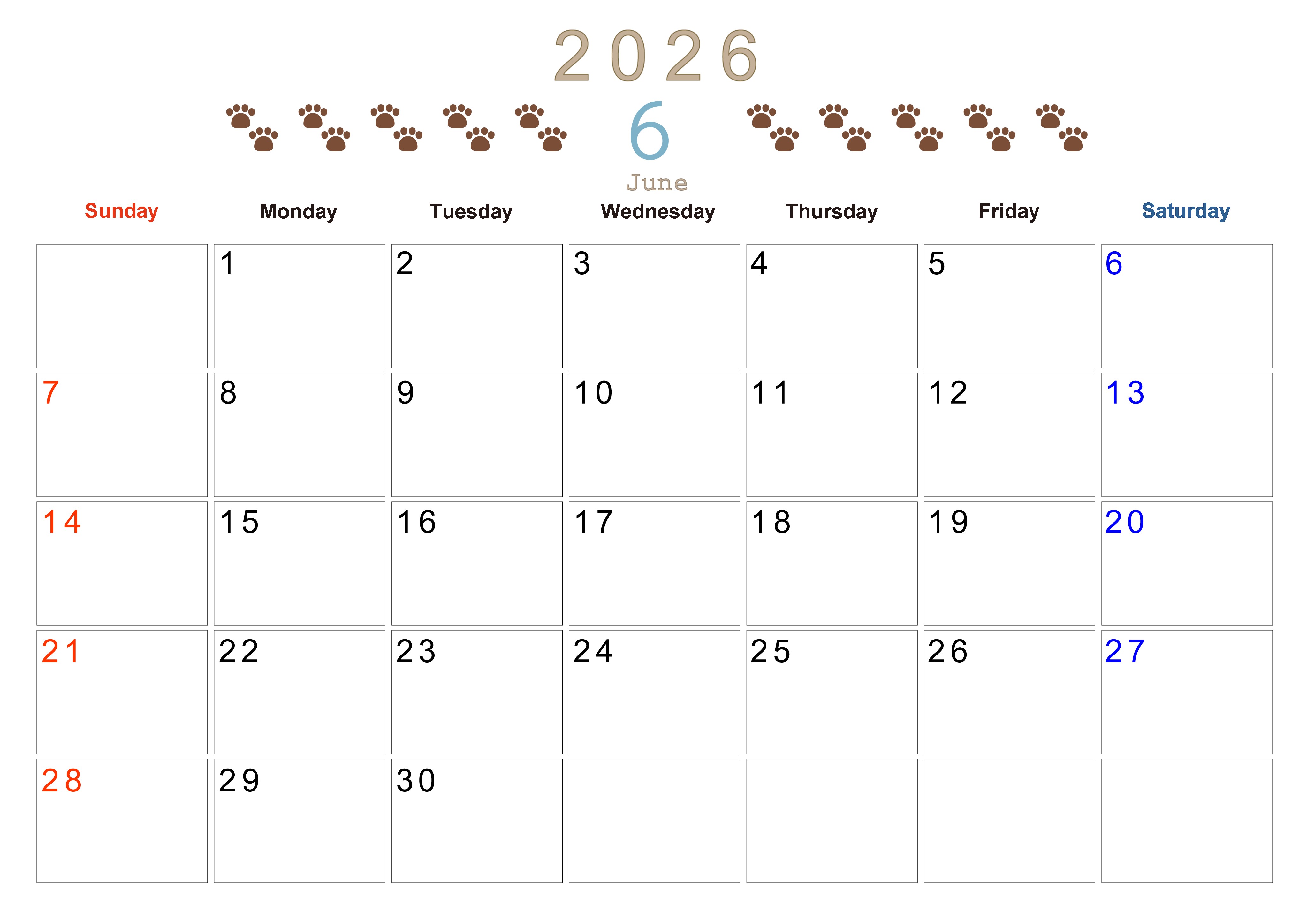 2026年6月カレンダーは横型日曜始まりで猫の自由きままな足あとがおしゃれかわいいデザインかつ無料なのでダウンロードをおすすめします。自由に計画を記入しやすい使いやすいカレンダーを探している人にぴったりです。(2026-01230600)