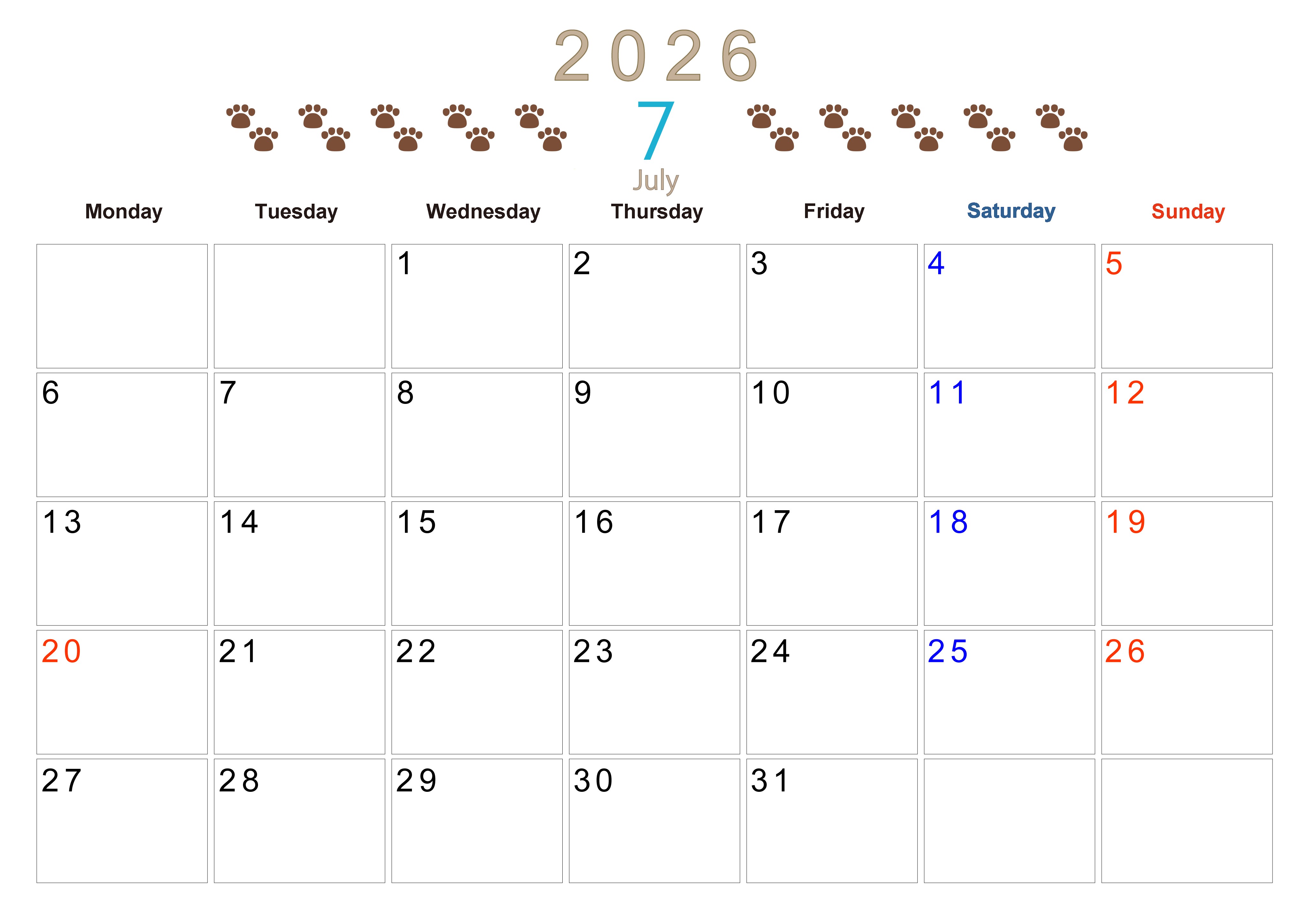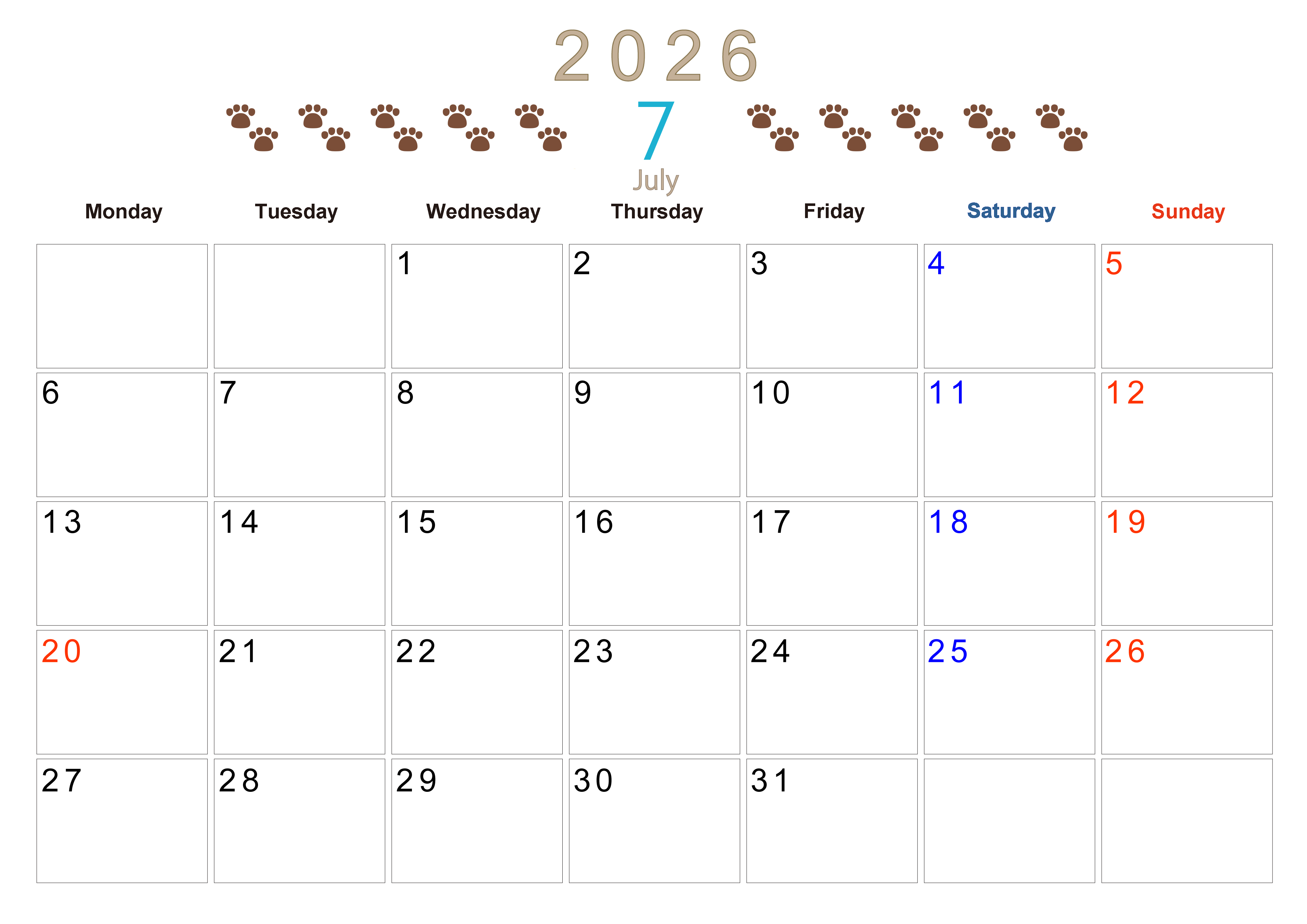 2026年・無料のカレンダーテンプレート 2026年7月カレンダーは横型月曜始まり で猫の自由きままな足あとがおしゃれかわいいデザインなのでおすすめ:無料(2026-01230701) 素材状デザイン王 2025年4月9日 2026年7月カレンダーは横型月曜始まりで猫の自由きままな足あとがおしゃれかわいいデザインかつ無料なのでダウンロードをおすすめします。自由に計画を記入しやすい使いやすいカレンダーを探している人にぴったりです。(2026-01230701) おしゃれ 7月 猫 横型のカレンダー 月曜始まり カレンダーデザイン-0123