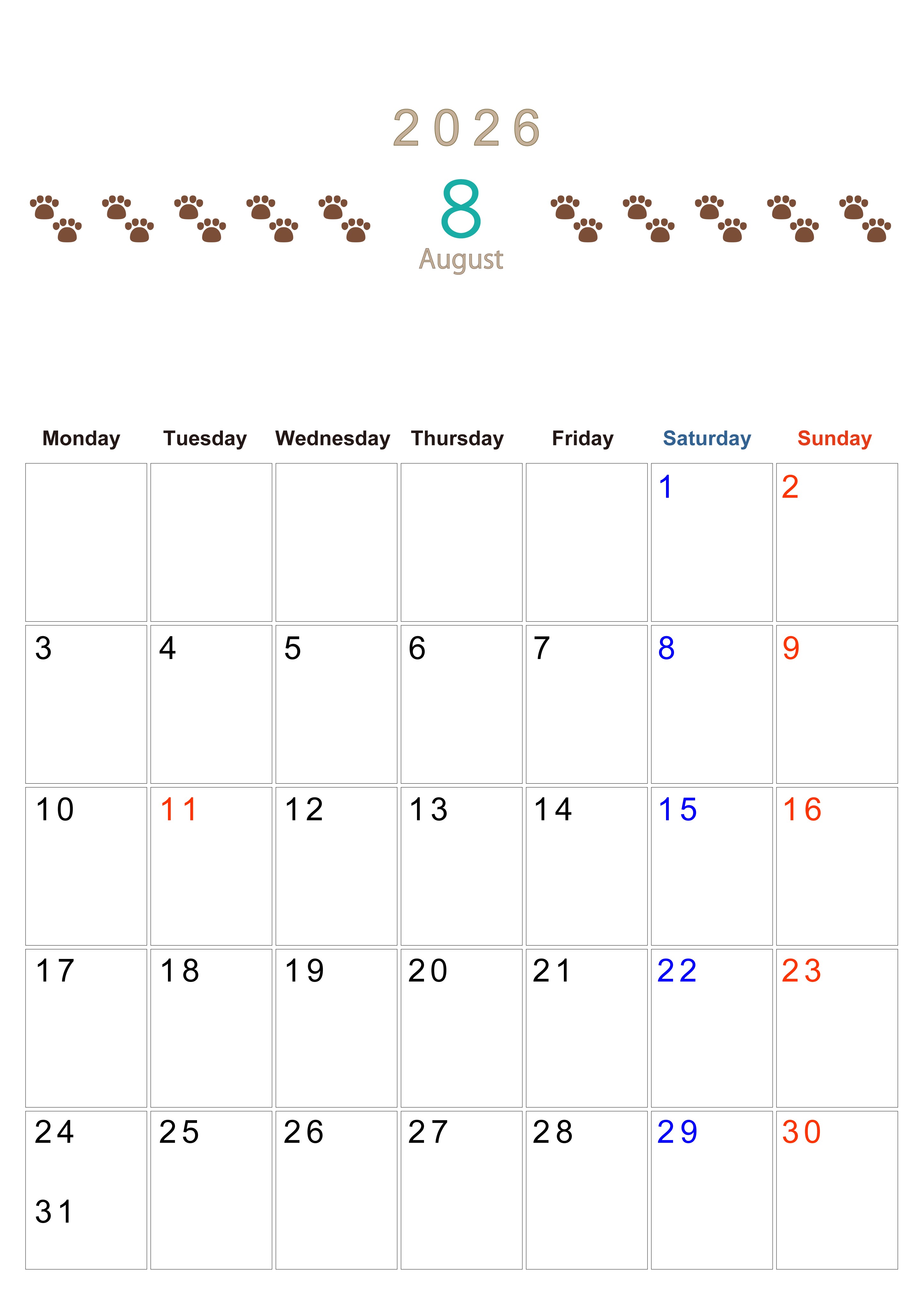 2026年8月カレンダーは縦型月曜始まりで猫の自由きままな足あとがおしゃれかわいいデザインなのでおすすめ:無料(2026-01230811)