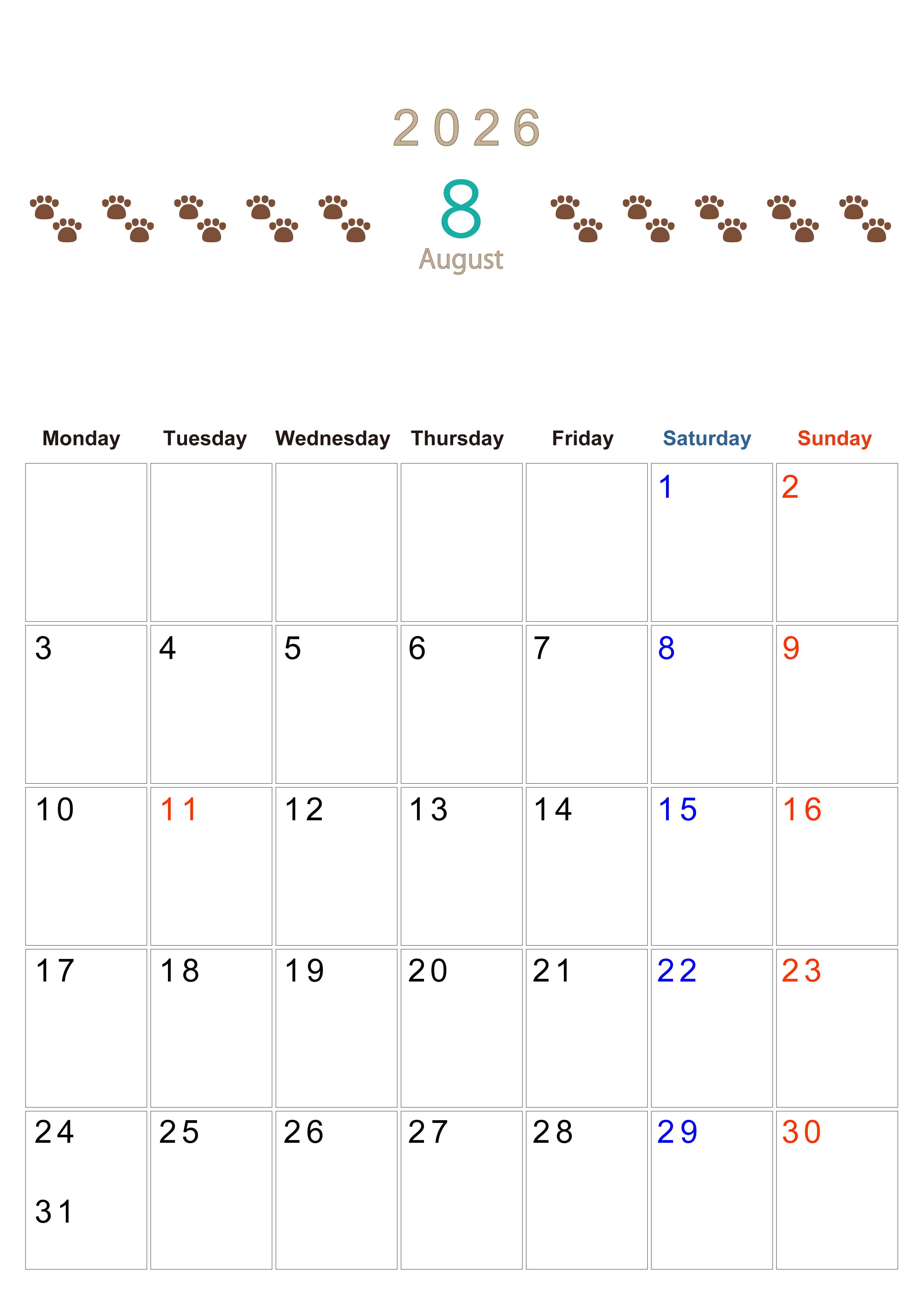 2026年8月カレンダーは縦型月曜始まりで猫の自由きままな足あとがおしゃれかわいいデザインかつ無料なのでダウンロードをおすすめします。自由に計画を記入しやすい使いやすいカレンダーを探している人にぴったりです。(2026-01230811)