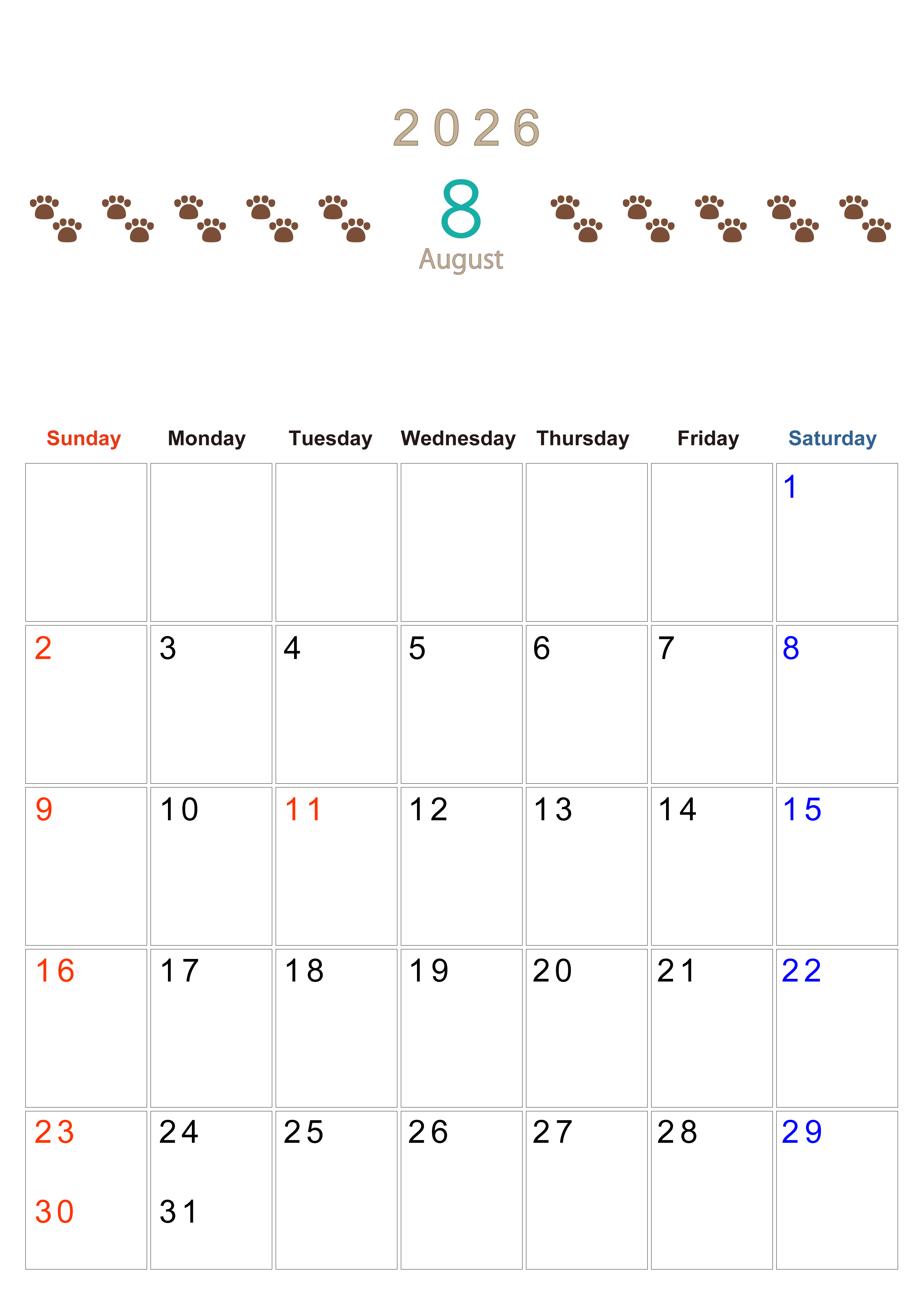 2026年8月カレンダーは縦型日曜始まりで猫の自由きままな足あとがおしゃれかわいいデザインなのでおすすめ:無料(2026-01230810)