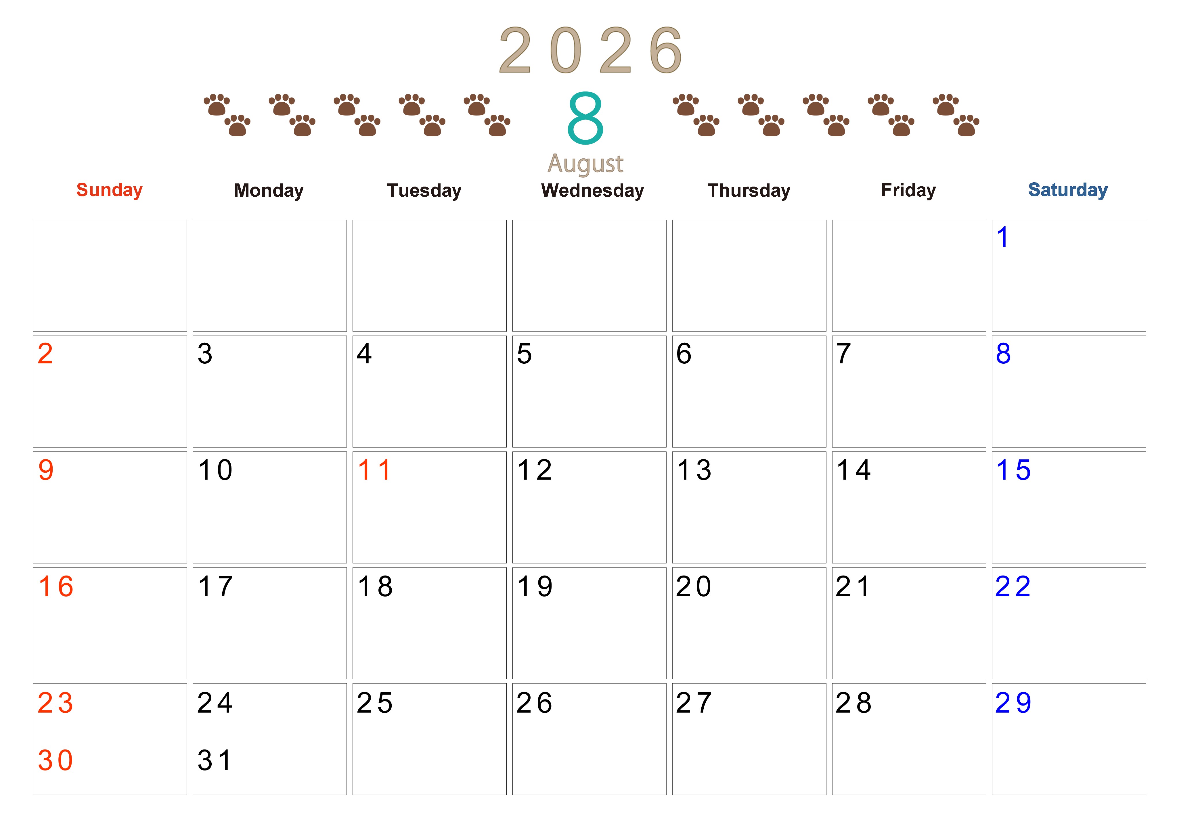 2026年・無料のカレンダーテンプレート 2026年8月カレンダーは横型日曜始まりで猫の自由きままな足あとがおしゃれかわいいデザインなのでおすすめ:無料(2026-01230800) 素材状デザイン王 2025年4月9日 2026年8月カレンダーは横型日曜始まりで猫の自由きままな足あとがおしゃれかわいいデザインかつ無料なのでダウンロードをおすすめします。自由に計画を記入しやすい使いやすいカレンダーを探している人にぴったりです。(2026-01230800) おしゃれ 8月 猫 横型のカレンダー 日曜始まり カレンダーデザイン-0123
