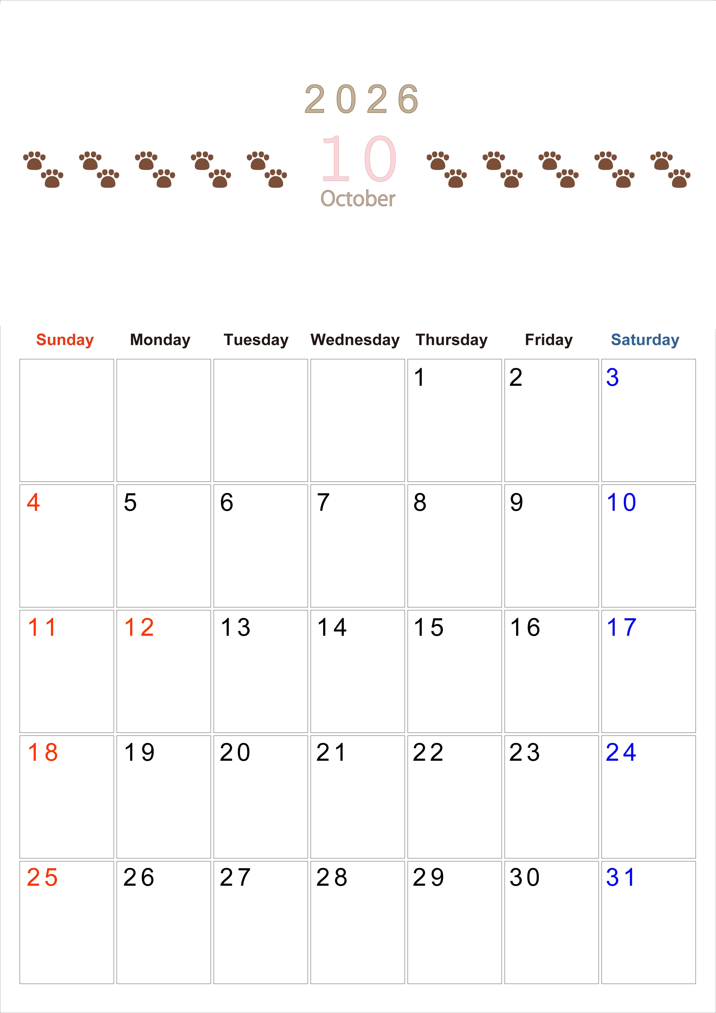 2026年10月カレンダーは縦型日曜始まりで猫の自由きままな足あとがおしゃれかわいいデザインなのでおすすめ:無料(2026-01231010)
