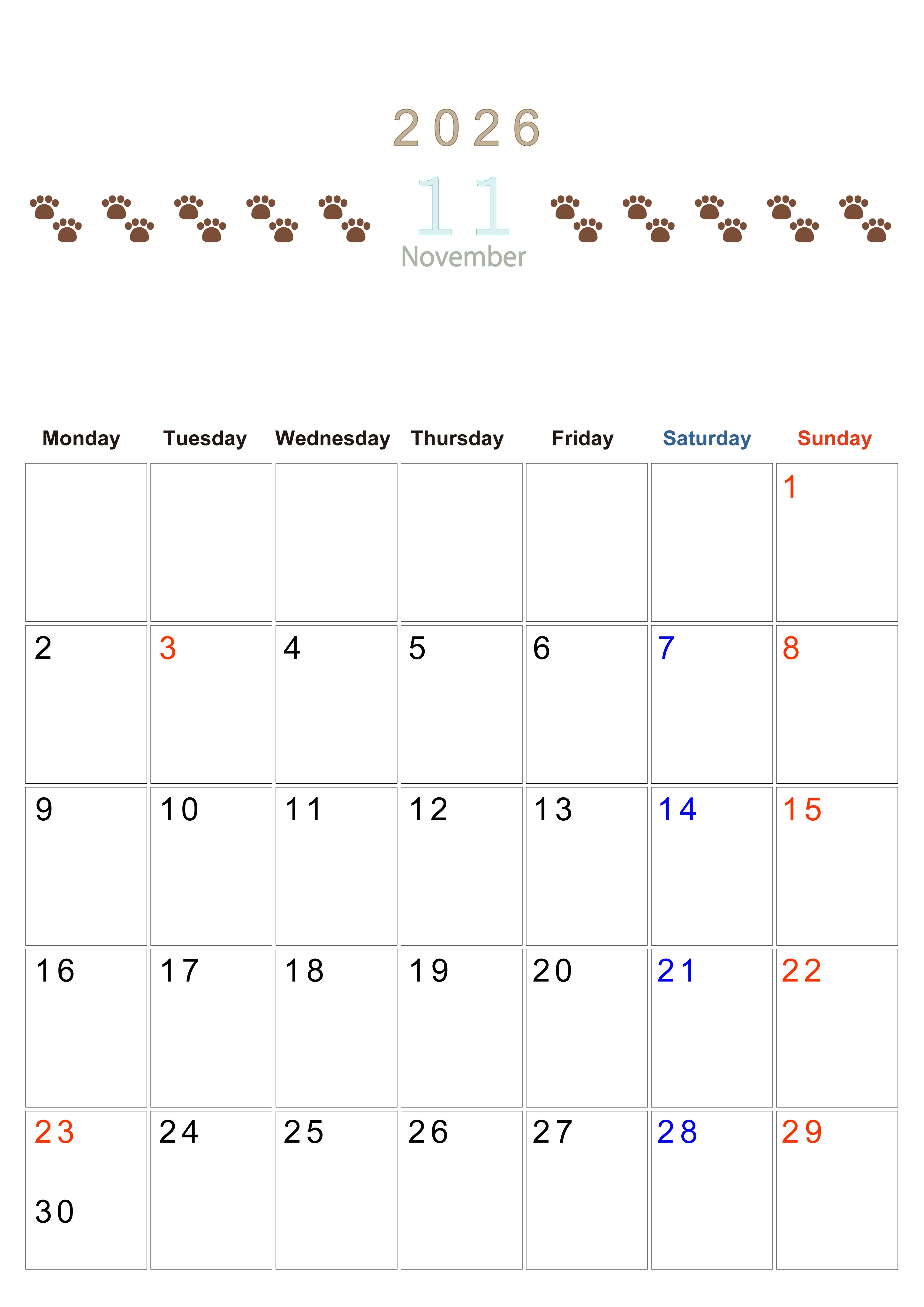 2026年・無料のカレンダーテンプレート 2026年11月カレンダーは縦型月曜始まりで猫の自由きままな足あとがおしゃれかわいいデザインなのでおすすめ:無料(2026-01231111) 素材状デザイン王 2025年4月9日 2026年11月カレンダーは縦型月曜始まりで猫の自由きままな足あとがおしゃれかわいいデザインかつ無料なのでダウンロードをおすすめします。自由に計画を記入しやすい使いやすいカレンダーを探している人にぴったりです。(2026-01231111) おしゃれ 11月 猫 縦型のカレンダー 月曜始まり カレンダーデザイン-0123