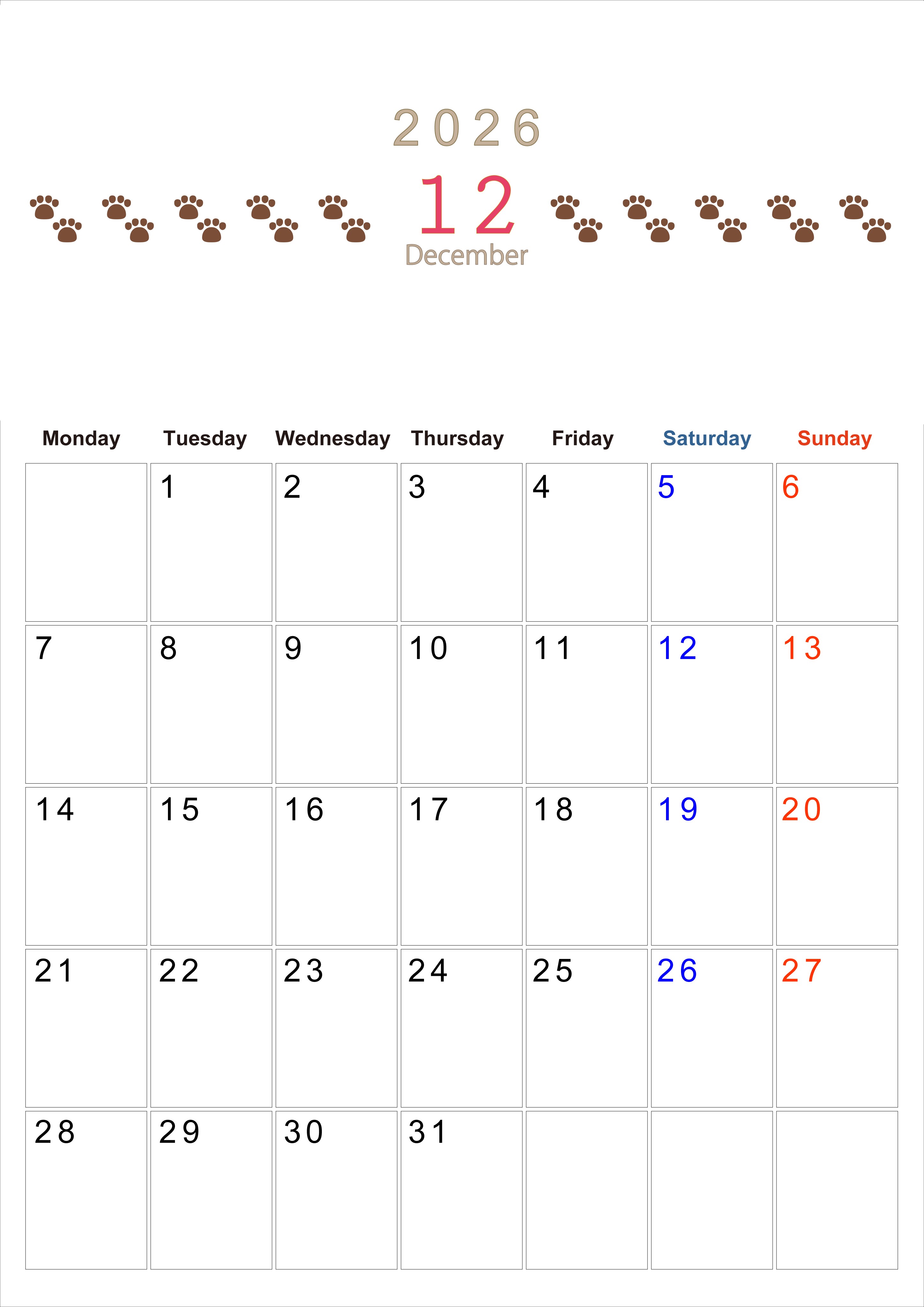 2026年12月カレンダーは縦型月曜始まりで猫の自由きままな足あとがおしゃれかわいいデザインかつ無料なのでダウンロードをおすすめします。自由に計画を記入しやすい使いやすいカレンダーを探している人にぴったりです。(2026-01231211)