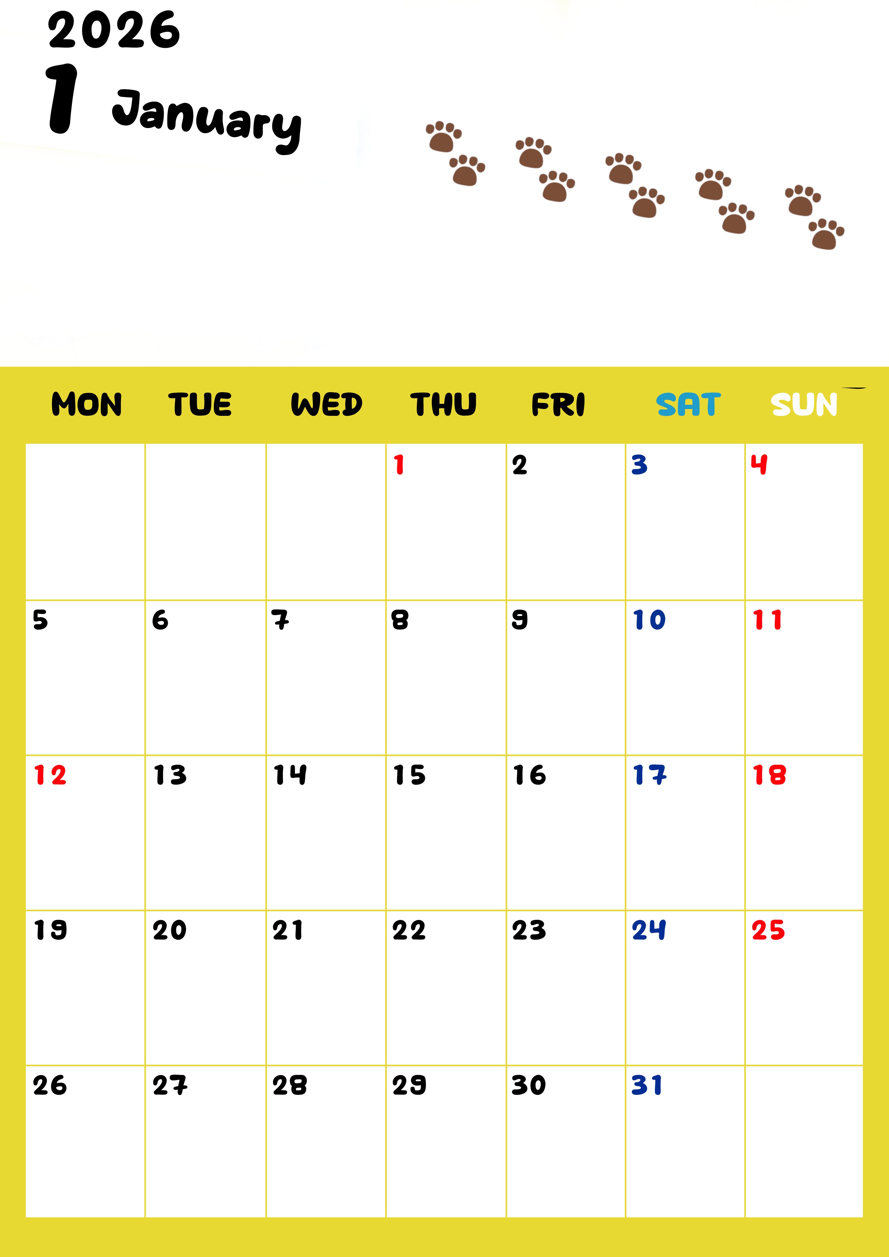 2026年・無料のカレンダーテンプレート 2026年1月カレンダーは縦型月曜始まりで無料!ねこのベージュぷにぷに肉球イラストがほっこりかわいい!(2026-01240111) 素材状デザイン王 2025年4月9日 2026年1月カレンダーは縦型月曜始まり始まりで無料です。ねこのベージュぷにぷに肉球イラストがほっこりかわいいので無料ダウンロードしてカラー印刷しませんか?イエローとベージュの組み合わせがおしゃれかわいいデザインです。(2026-01240111) かわいい 1月 猫 縦型のカレンダー 月曜始まり カレンダーデザイン-0124
