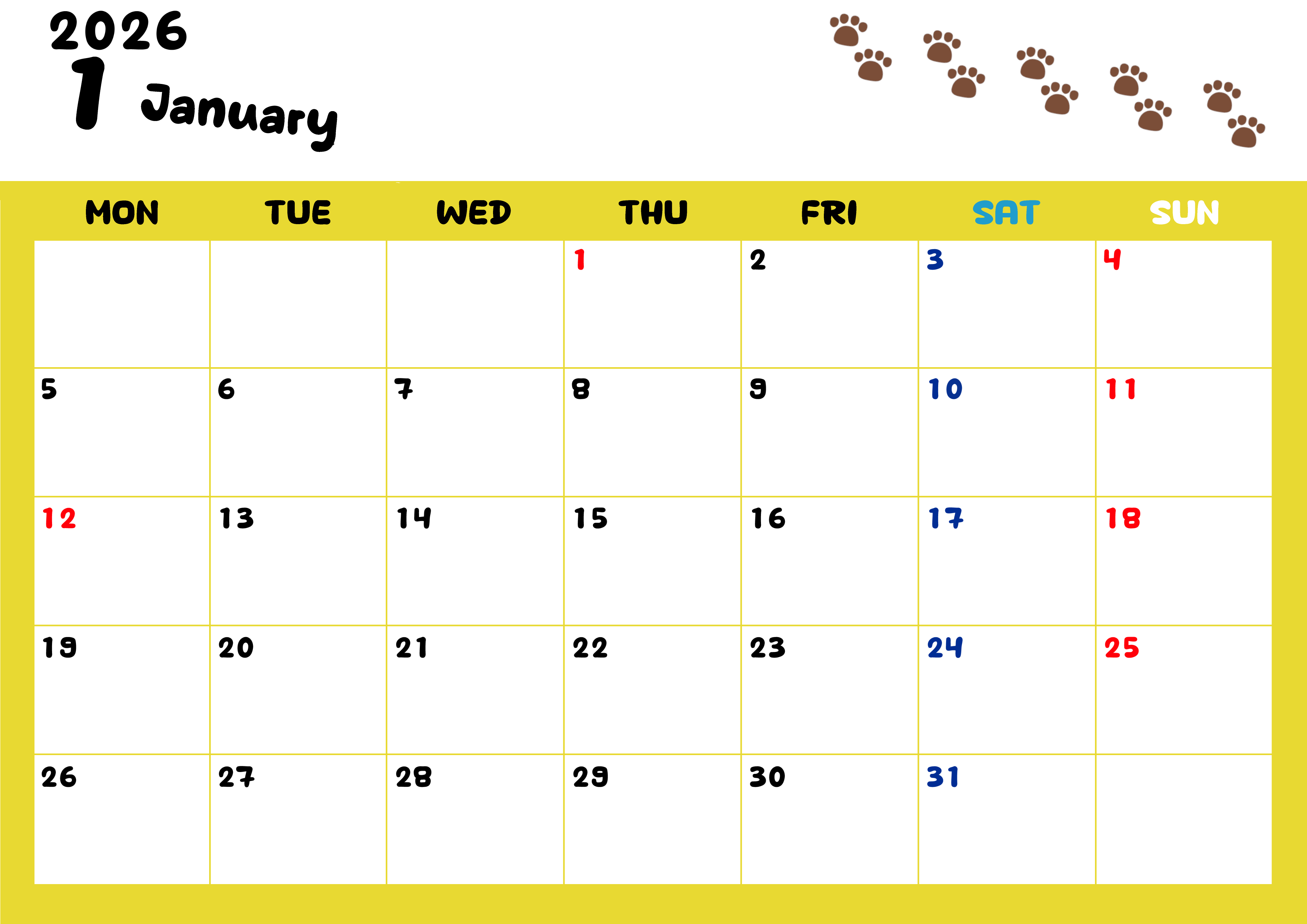 2026年・無料のカレンダーテンプレート 2026年1月カレンダーは横型月曜始まりで無料!ねこのベージュぷにぷに肉球イラストがほっこりかわいい!(2026-01240101) 素材状デザイン王 2025年4月9日 2026年1月カレンダーは横型月曜始まり始まりで無料です。ねこのベージュぷにぷに肉球イラストがほっこりかわいいので無料ダウンロードしてカラー印刷しませんか?イエローとベージュの組み合わせがおしゃれかわいいデザインです。(2026-01240101) かわいい 1月 猫 横型のカレンダー 月曜始まり カレンダーデザイン-0124