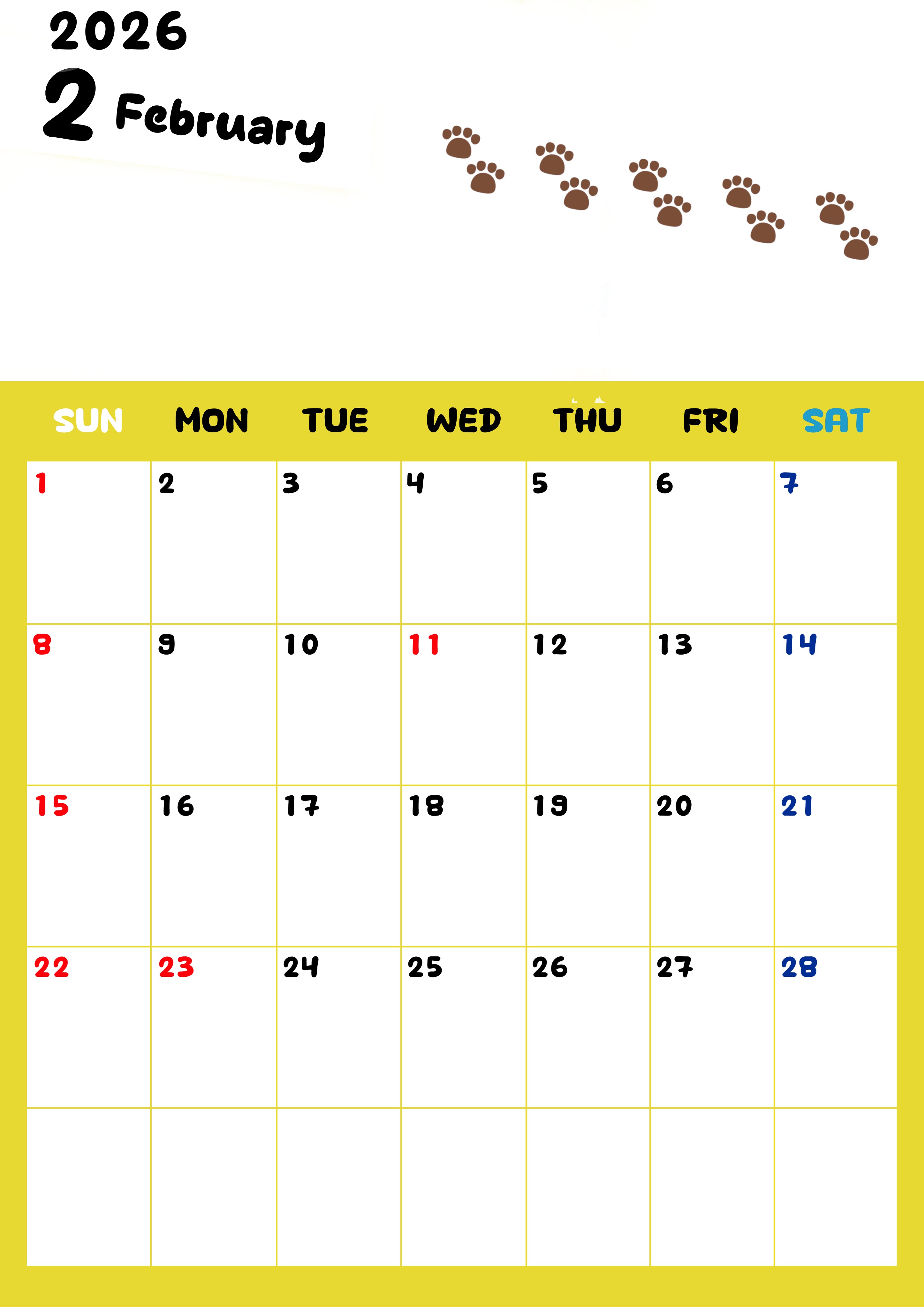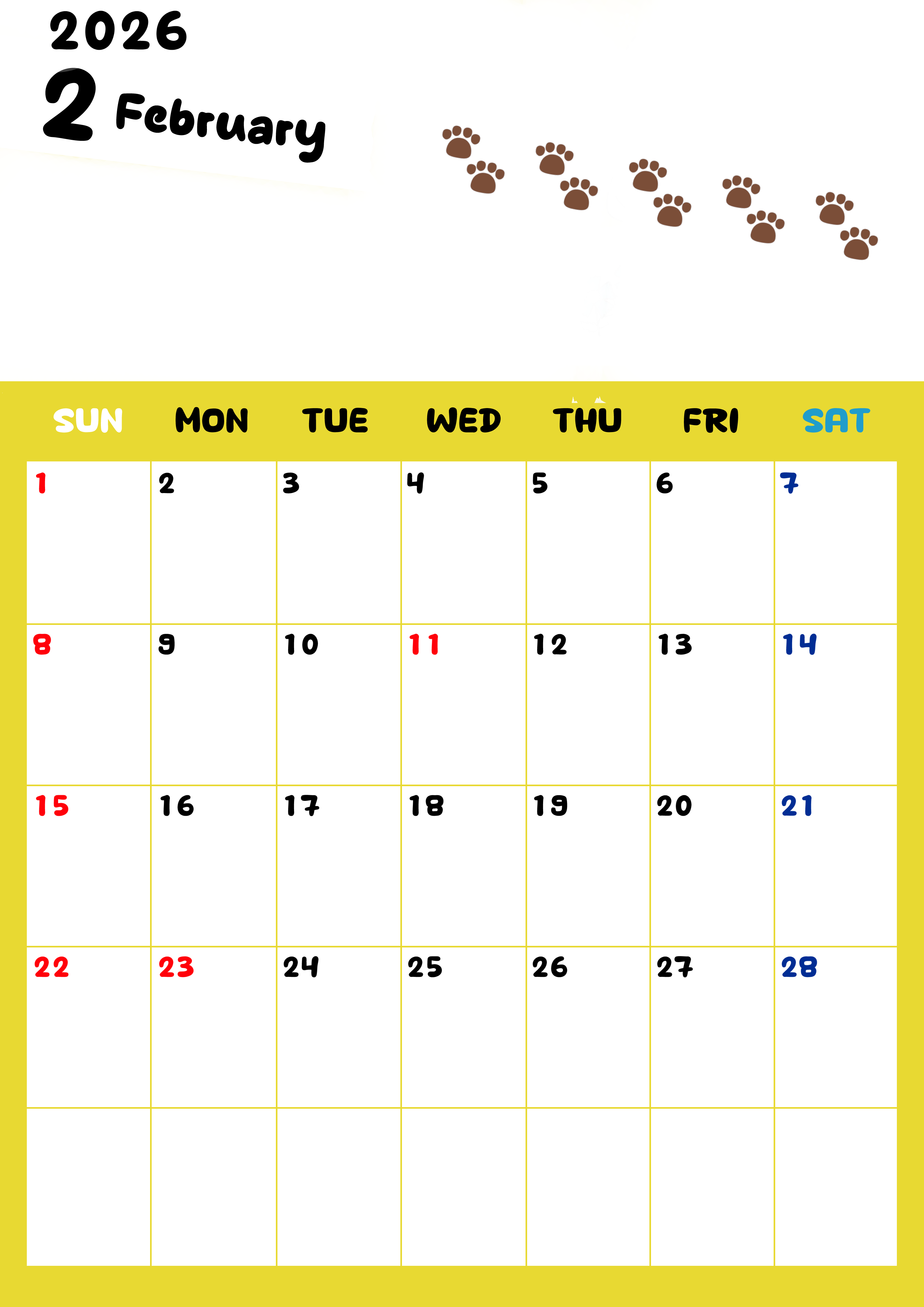 2026年・無料のカレンダーテンプレート 2026年2月カレンダーは縦型日曜始まりで無料!ねこのベージュぷにぷに肉球イラストがほっこりかわいい!(2026-01240210) 素材状デザイン王 2025年4月9日 2026年2月カレンダーは縦型日曜始まり始まりで無料です。ねこのベージュぷにぷに肉球イラストがほっこりかわいいので無料ダウンロードしてカラー印刷しませんか?イエローとベージュの組み合わせがおしゃれかわいいデザインです。(2026-01240210) かわいい 2月 猫 縦型のカレンダー 日曜始まり カレンダーデザイン-0124