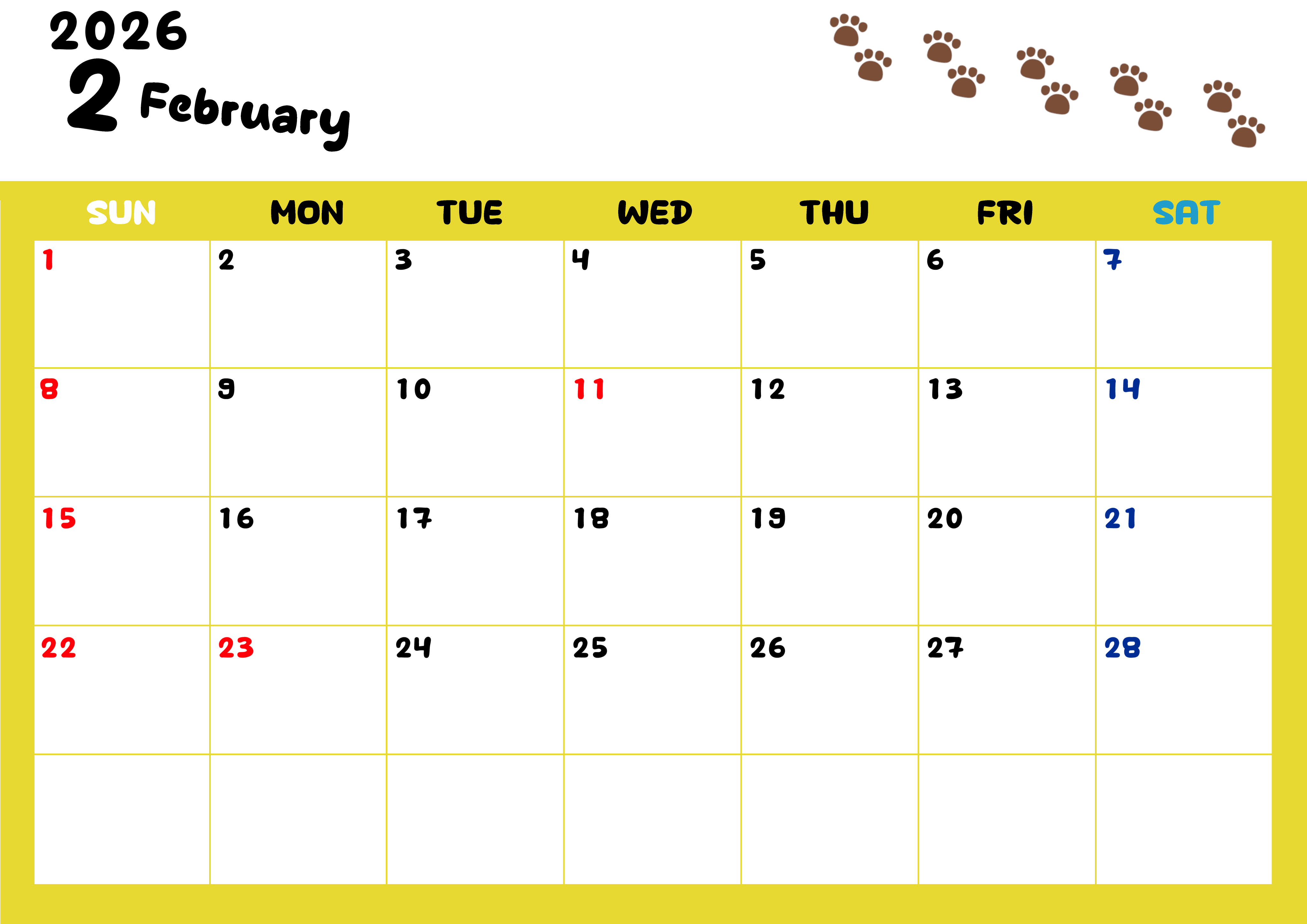 2026年・無料のカレンダーテンプレート 2026年2月カレンダーは横型日曜始まりで無料!ねこのベージュぷにぷに肉球イラストがほっこりかわいい!(2026-01240200) 素材状デザイン王 2025年4月9日 2026年2月カレンダーは横型日曜始まり始まりで無料です。ねこのベージュぷにぷに肉球イラストがほっこりかわいいので無料ダウンロードしてカラー印刷しませんか?イエローとベージュの組み合わせがおしゃれかわいいデザインです。(2026-01240200) かわいい 2月 猫 横型のカレンダー 日曜始まり カレンダーデザイン-0124