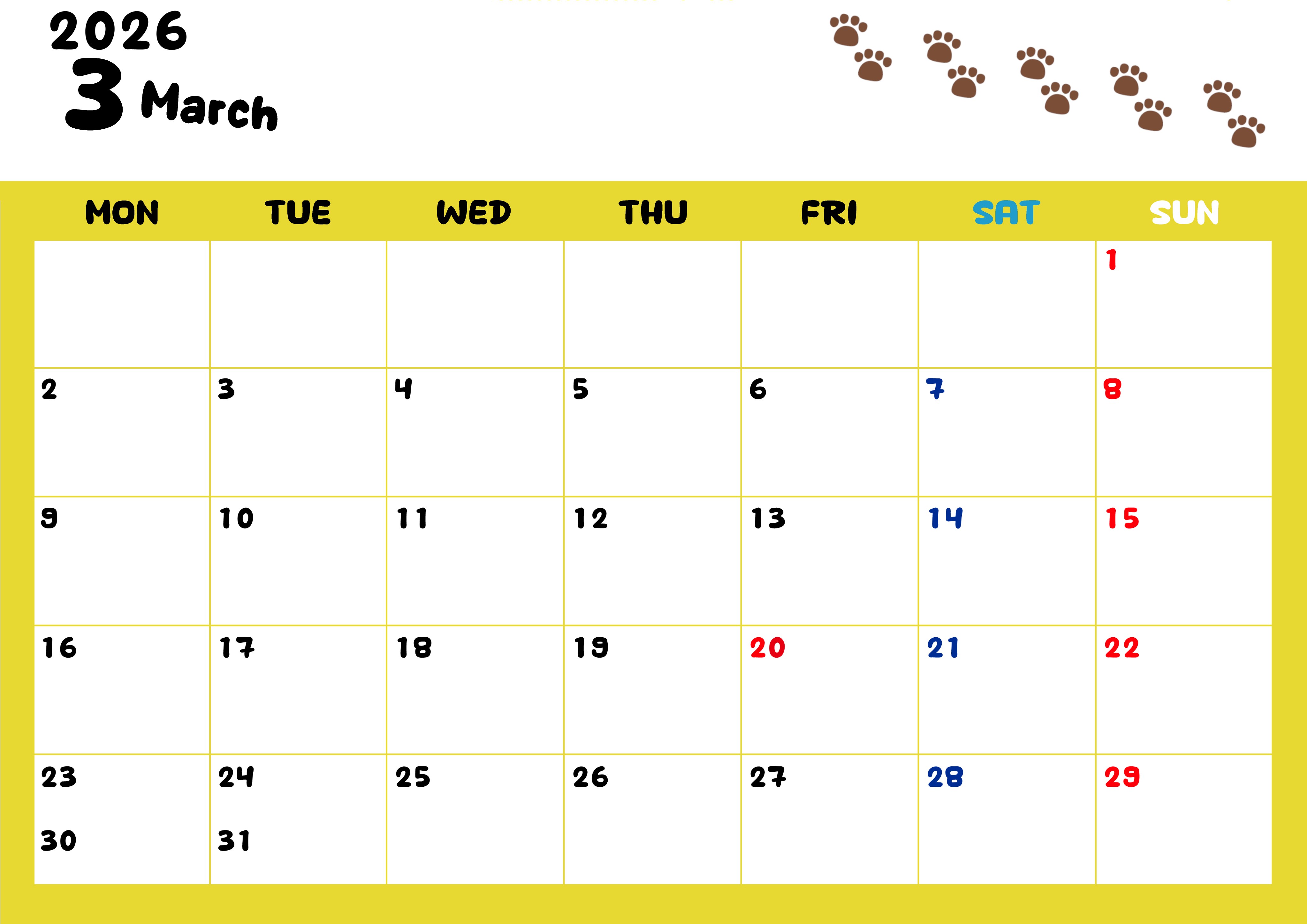 2026年3月カレンダーは横型月曜始まり始まりで無料です。ねこのベージュぷにぷに肉球イラストがほっこりかわいいので無料ダウンロードしてカラー印刷しませんか?イエローとベージュの組み合わせがおしゃれかわいいデザインです。(2026-01240301)
