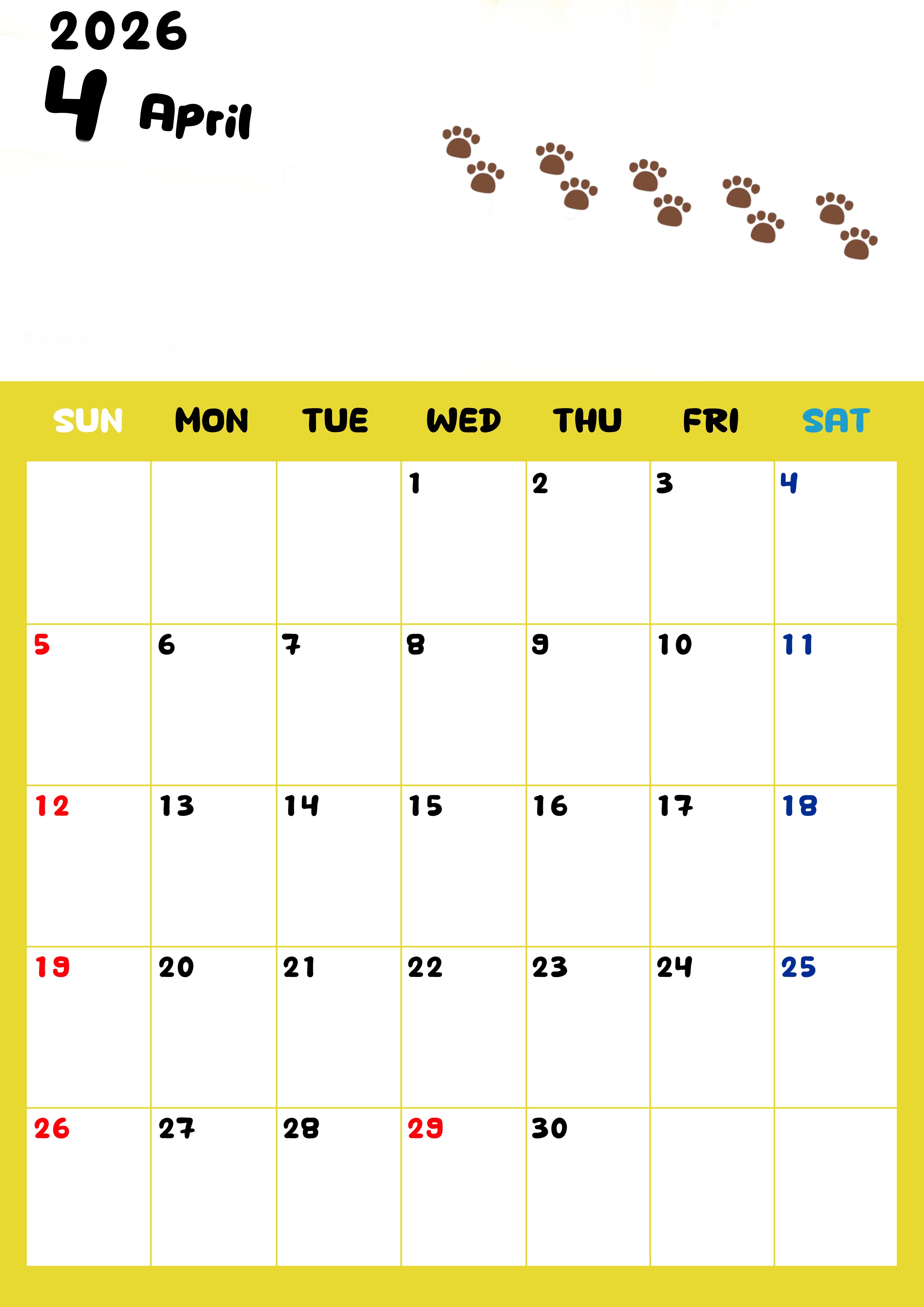 2026年4月カレンダーは縦型日曜始まり始まりで無料です。ねこのベージュぷにぷに肉球イラストがほっこりかわいいので無料ダウンロードしてカラー印刷しませんか?イエローとベージュの組み合わせがおしゃれかわいいデザインです。(2026-01240410)