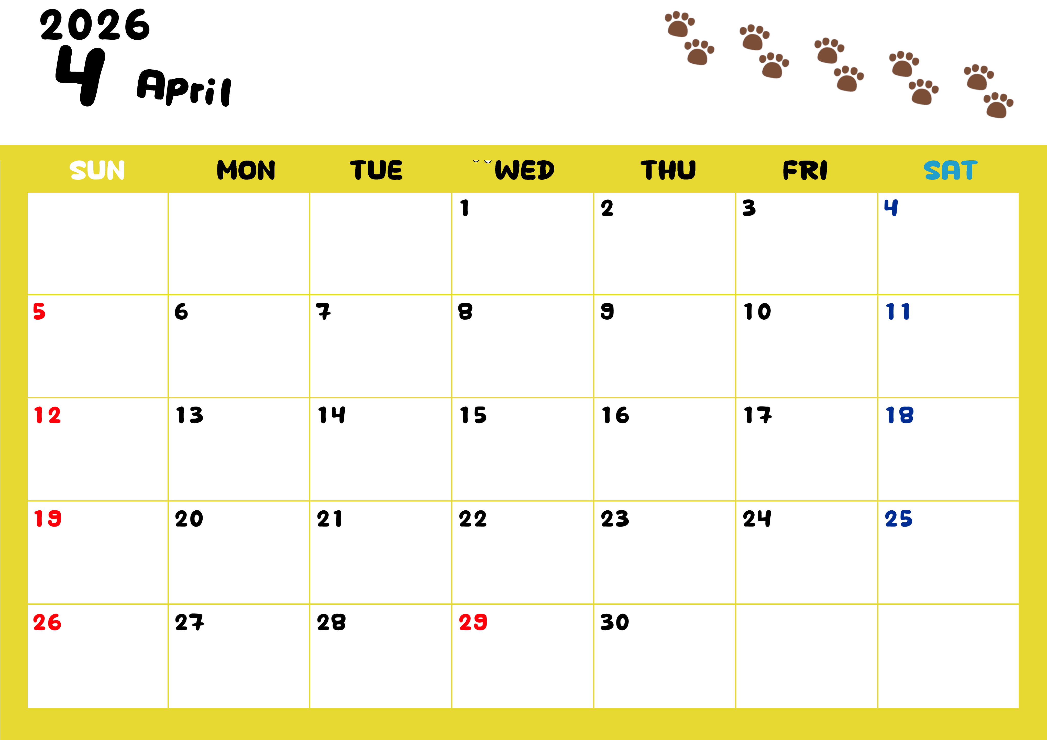 2026年・無料のカレンダーテンプレート 2026年4月カレンダーは横型日曜始まりで無料!ねこのベージュぷにぷに肉球イラストがほっこりかわいい!(2026-01240400) 素材状デザイン王 2025年4月9日 2026年4月カレンダーは横型日曜始まり始まりで無料です。ねこのベージュぷにぷに肉球イラストがほっこりかわいいので無料ダウンロードしてカラー印刷しませんか?イエローとベージュの組み合わせがおしゃれかわいいデザインです。(2026-01240400) かわいい 4月 猫 横型のカレンダー 日曜始まり カレンダーデザイン-0124