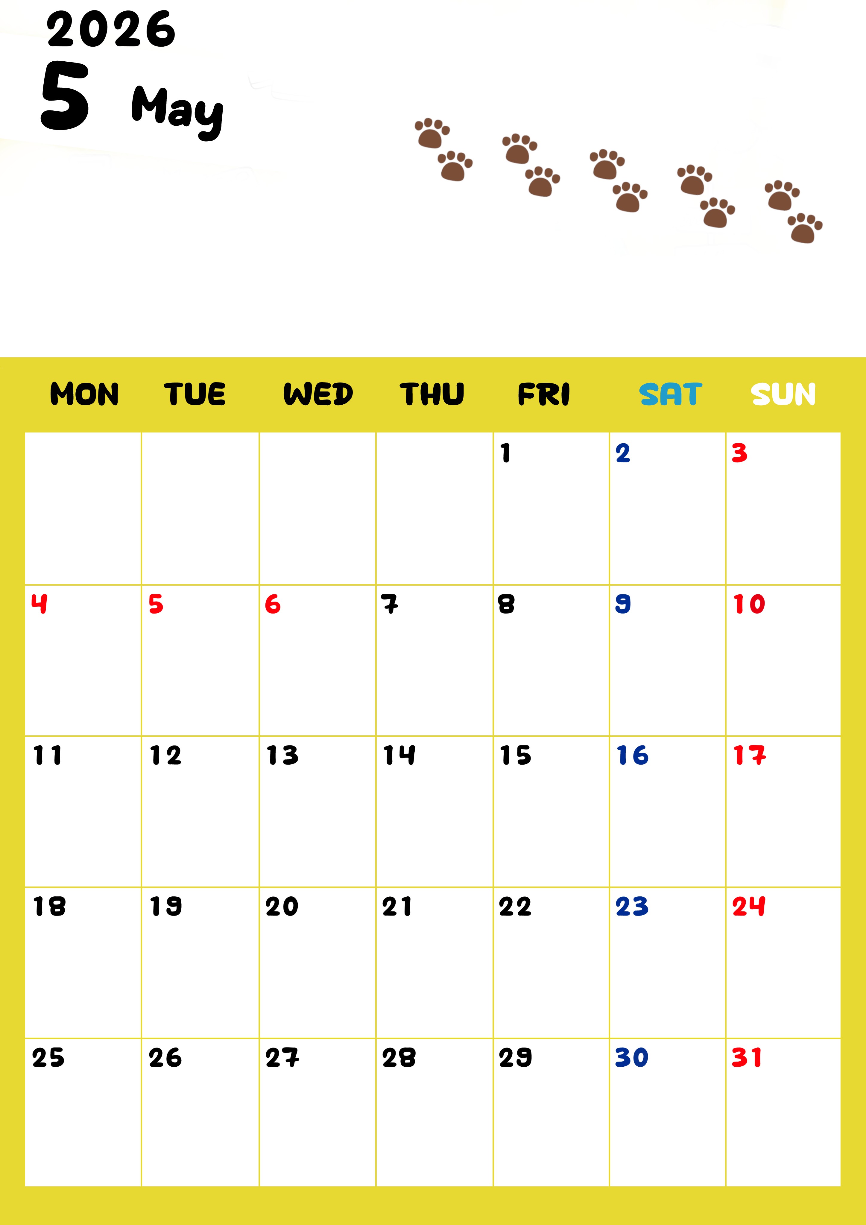 2026年・無料のカレンダーテンプレート 2026年5月カレンダーは縦型月曜始まりで無料!ねこのベージュぷにぷに肉球イラストがほっこりかわいい!(2026-01240511) 素材状デザイン王 2025年4月9日 2026年5月カレンダーは縦型月曜始まり始まりで無料です。ねこのベージュぷにぷに肉球イラストがほっこりかわいいので無料ダウンロードしてカラー印刷しませんか?イエローとベージュの組み合わせがおしゃれかわいいデザインです。(2026-01240511) かわいい 5月 猫 縦型のカレンダー 月曜始まり カレンダーデザイン-0124