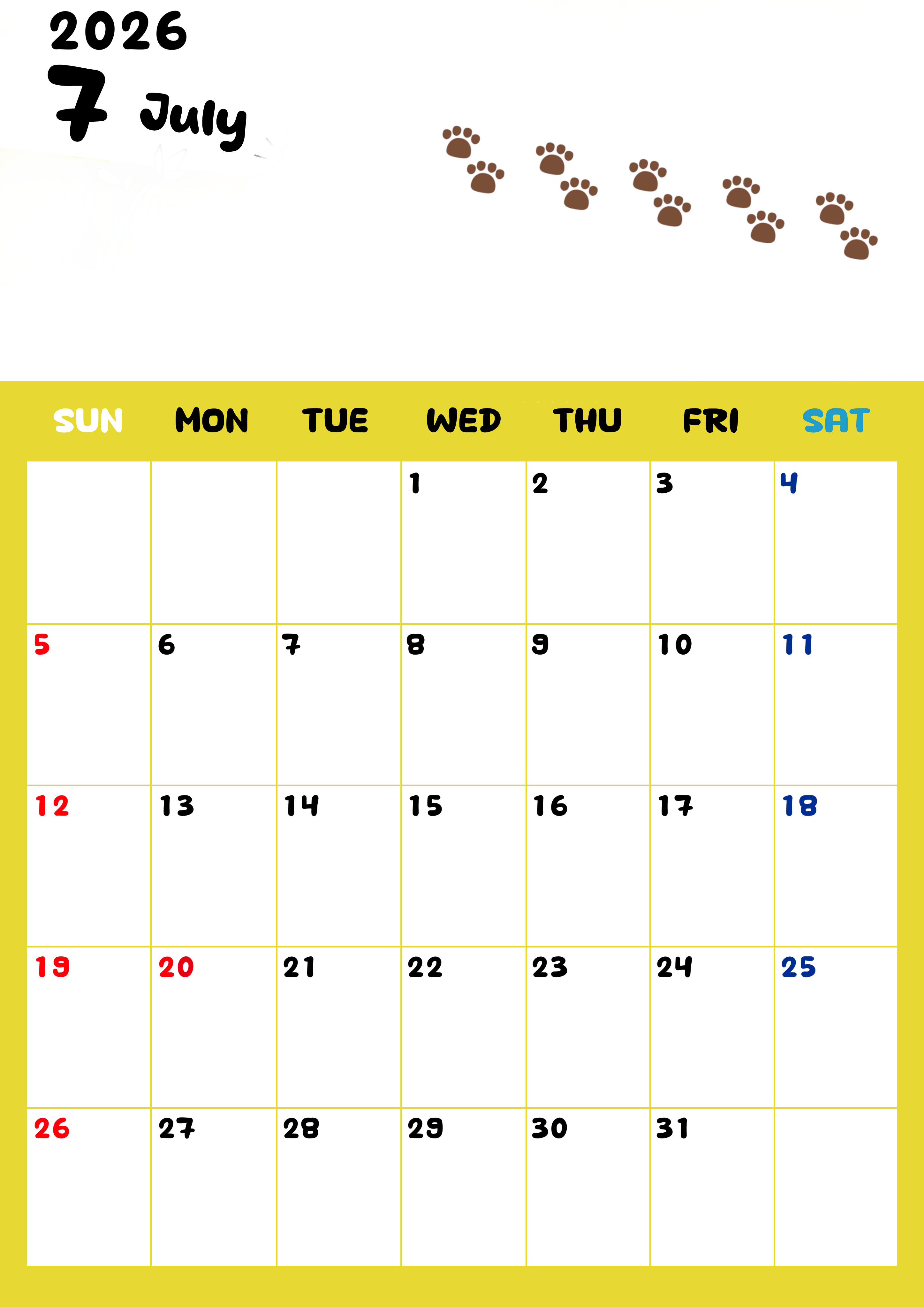 2026年7月カレンダーは縦型日曜始まり で猫の自由きままな足あとがおしゃれかわいいデザインなのでおすすめ:無料(2026-01240710)