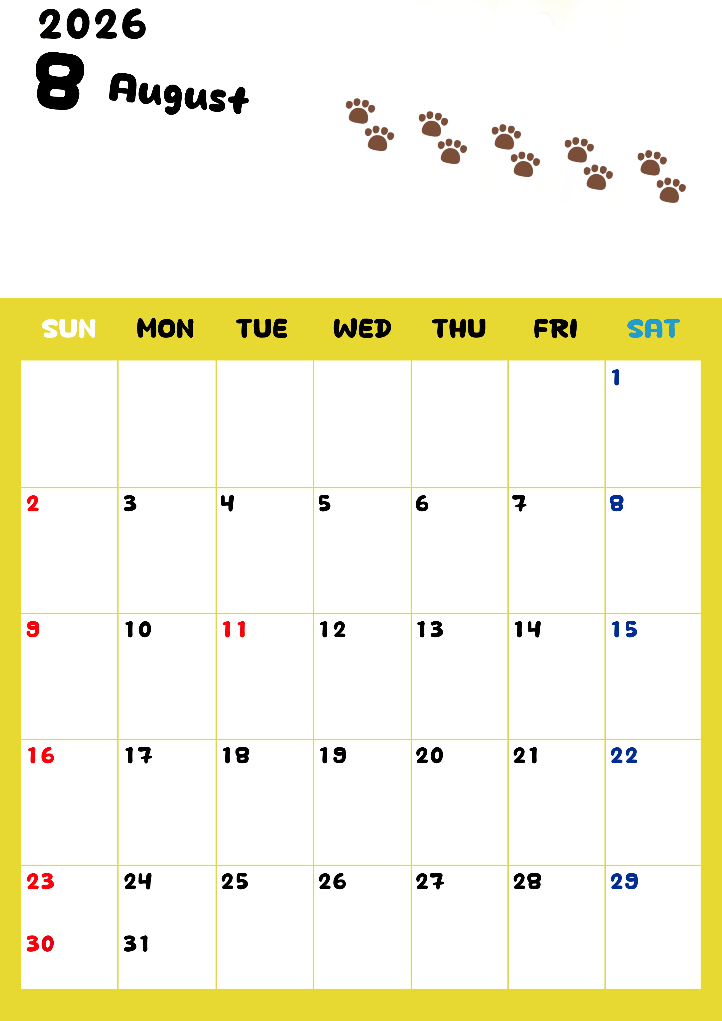 2026年・無料のカレンダーテンプレート 2026年8月カレンダーは縦型日曜始まりで無料!ねこのベージュぷにぷに肉球イラストがほっこりかわいい!(2026-01240810) 素材状デザイン王 2025年4月9日 2026年8月カレンダーは縦型日曜始まり始まりで無料です。ねこのベージュぷにぷに肉球イラストがほっこりかわいいので無料ダウンロードしてカラー印刷しませんか?イエローとベージュの組み合わせがおしゃれかわいいデザインです。(2026-01240810) かわいい 8月 猫 縦型のカレンダー 日曜始まり カレンダーデザイン-0124