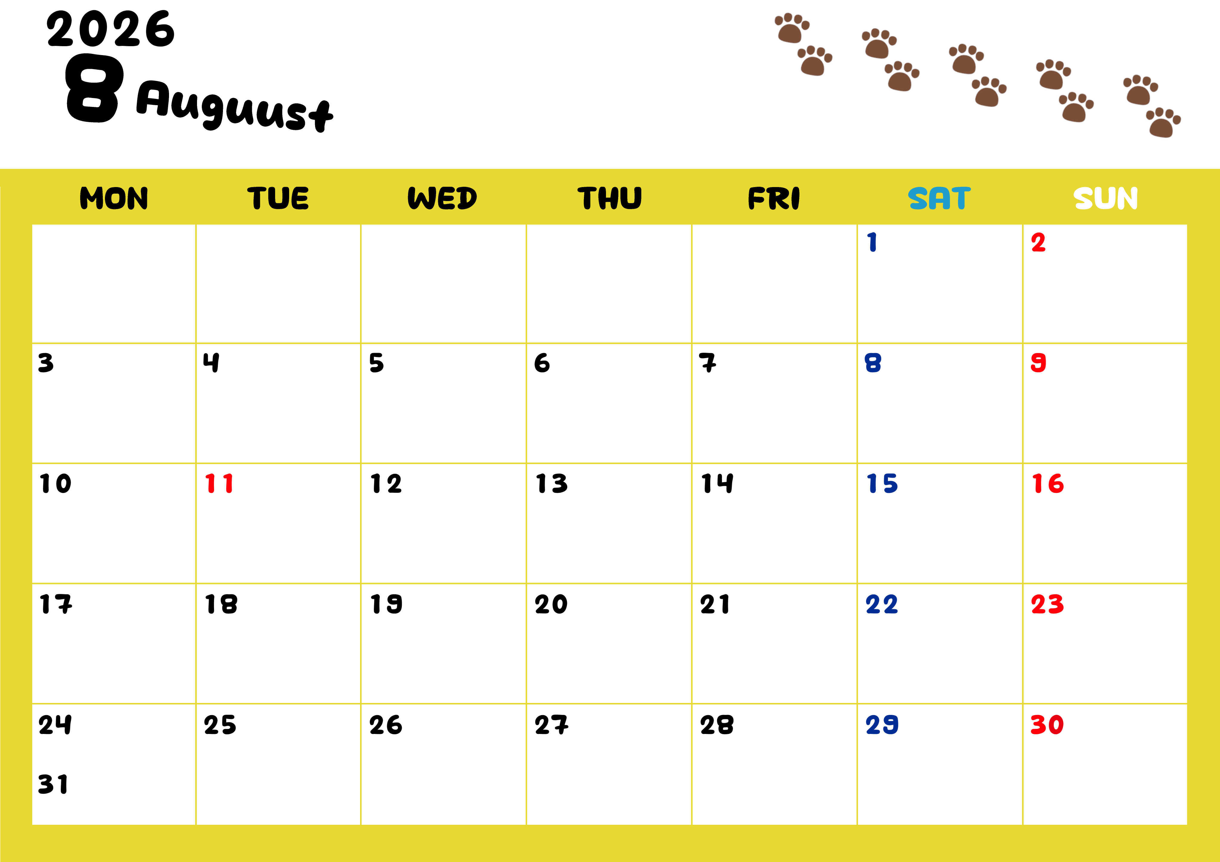2026年・無料のカレンダーテンプレート 2026年8月カレンダーは横型月曜始まりで無料!ねこのベージュぷにぷに肉球イラストがほっこりかわいい!(2026-01240801) 素材状デザイン王 2025年4月9日 2026年8月カレンダーは横型月曜始まり始まりで無料です。ねこのベージュぷにぷに肉球イラストがほっこりかわいいので無料ダウンロードしてカラー印刷しませんか?イエローとベージュの組み合わせがおしゃれかわいいデザインです。(2026-01240801) かわいい 8月 猫 横型のカレンダー 月曜始まり カレンダーデザイン-0124