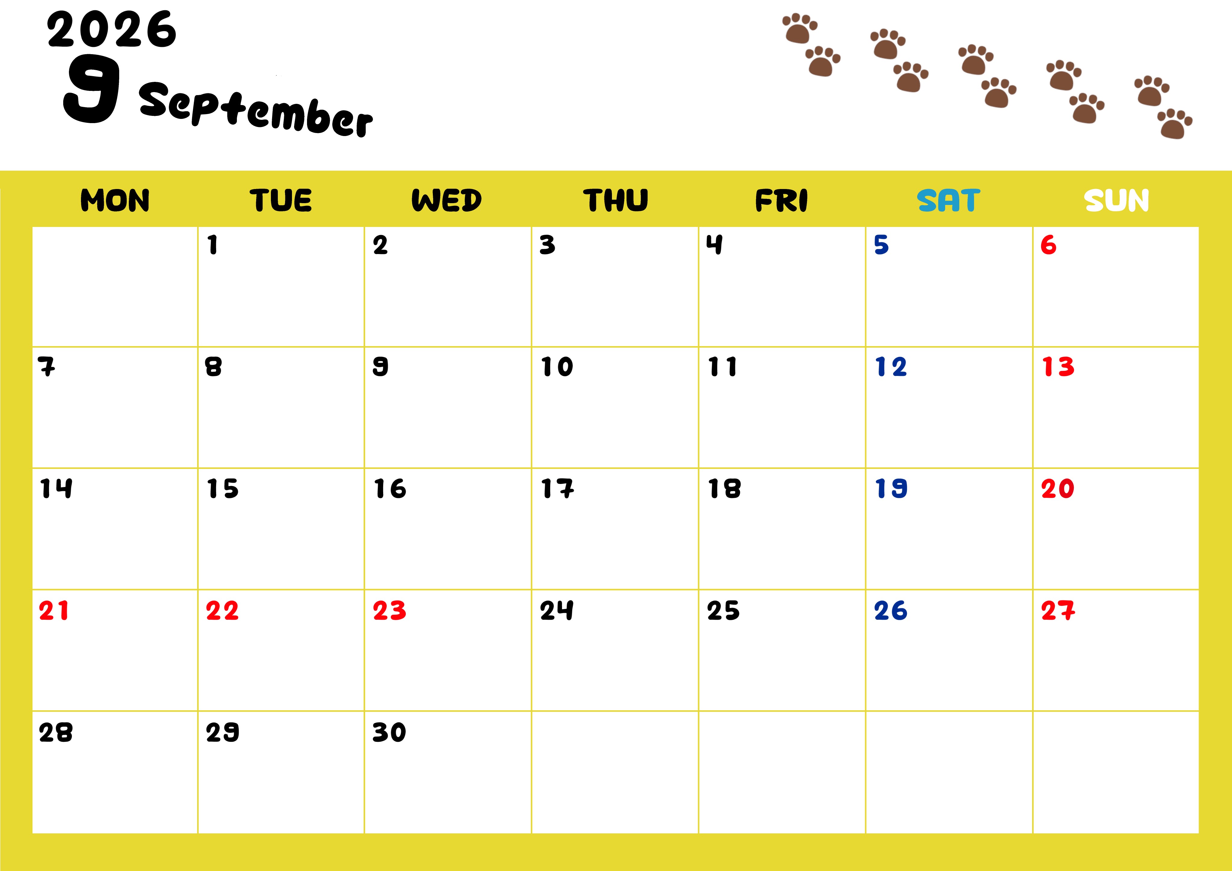 2026年・無料のカレンダーテンプレート 2026年9月カレンダーは横型月曜始まりで無料!ねこのベージュぷにぷに肉球イラストがほっこりかわいい!(2026-01240901) 素材状デザイン王 2025年4月9日 2026年9月カレンダーは横型月曜始まり始まりで無料です。ねこのベージュぷにぷに肉球イラストがほっこりかわいいので無料ダウンロードしてカラー印刷しませんか?イエローとベージュの組み合わせがおしゃれかわいいデザインです。(2026-01240901) かわいい 9月 猫 横型のカレンダー 月曜始まり カレンダーデザイン-0124