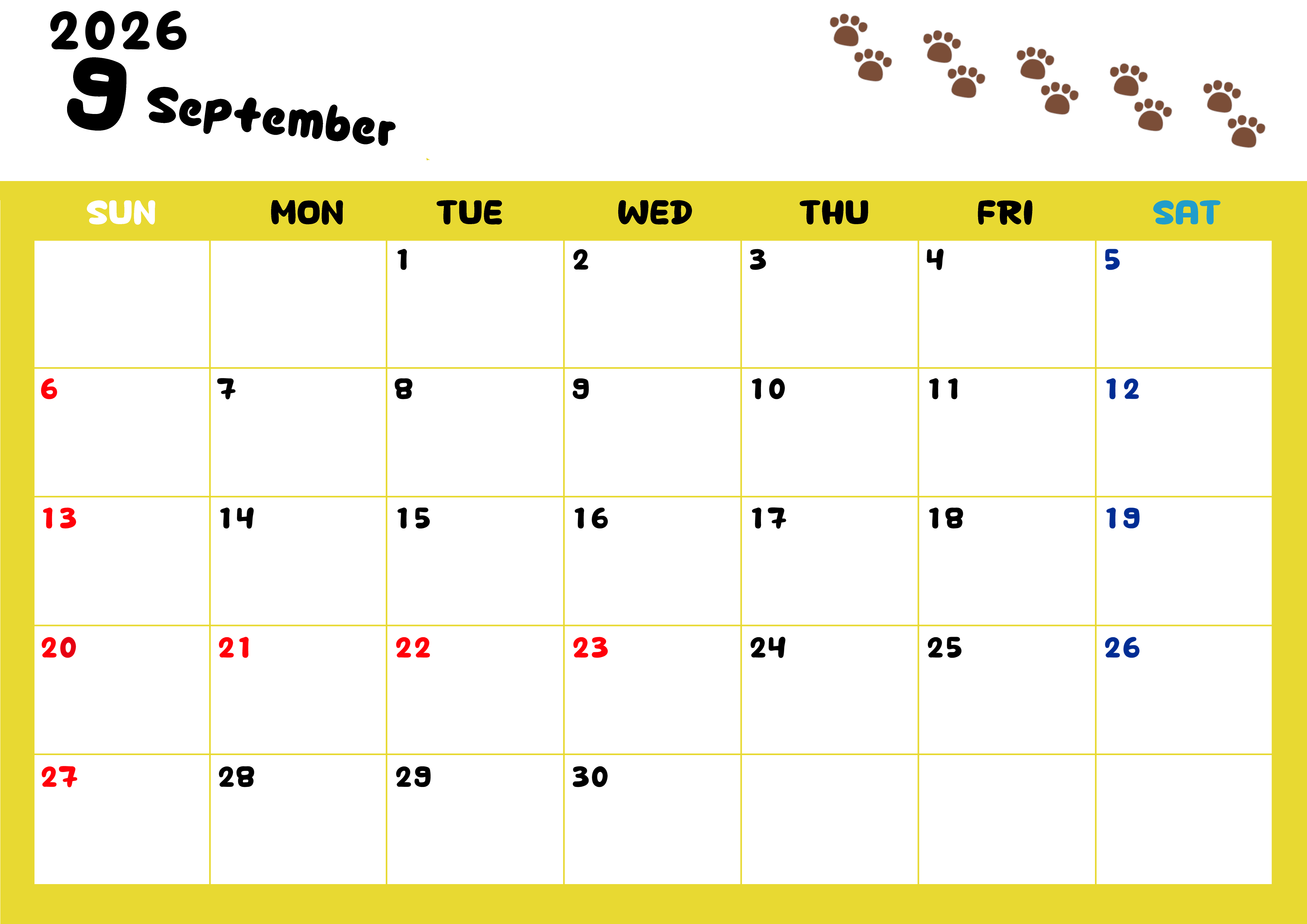 2026年9月カレンダーは横型日曜始まり始まりで無料です。ねこのベージュぷにぷに肉球イラストがほっこりかわいいので無料ダウンロードしてカラー印刷しませんか?イエローとベージュの組み合わせがおしゃれかわいいデザインです。(2026-01240900)