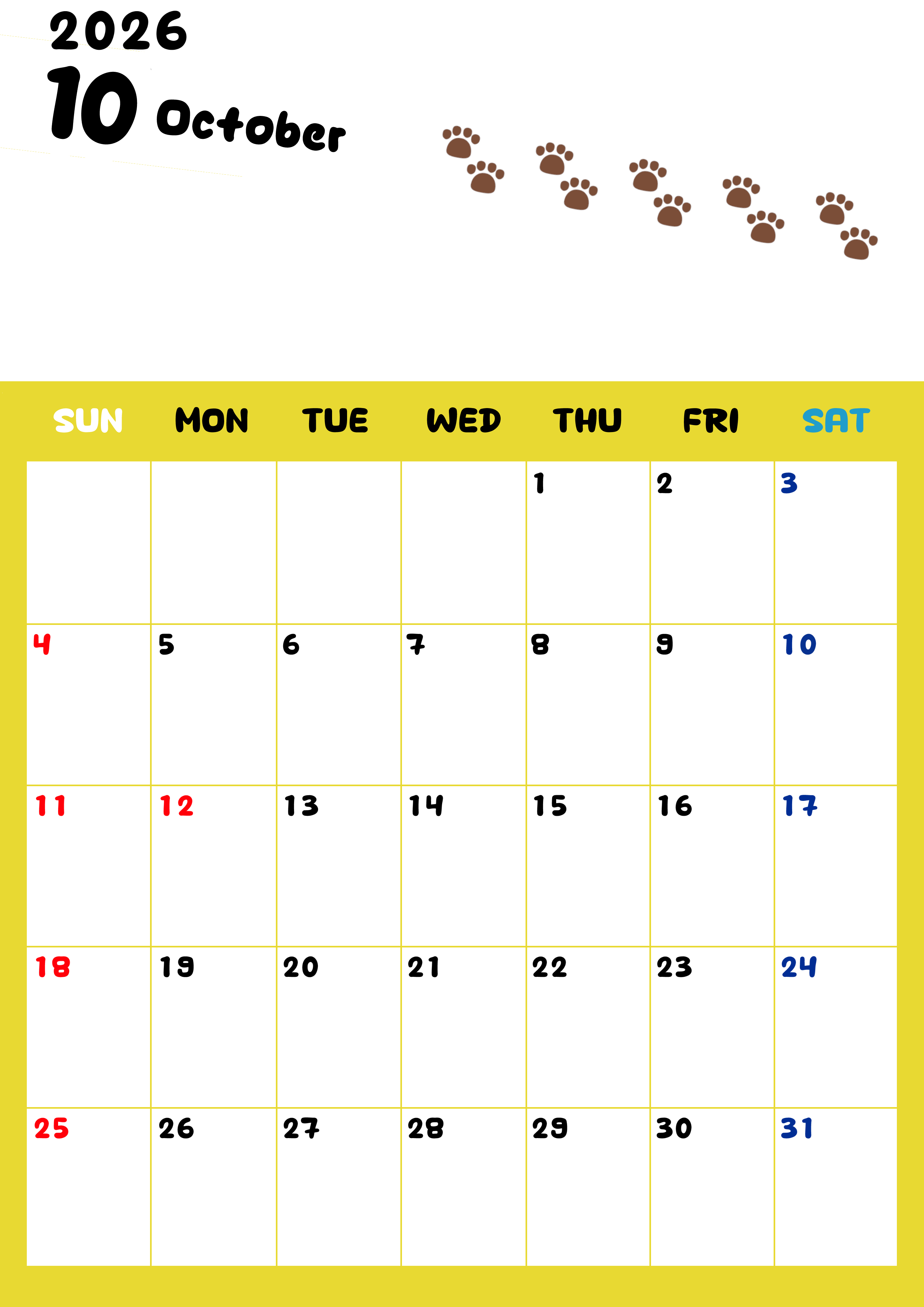 2026年・無料のカレンダーテンプレート 2026年10月カレンダーは縦型日曜始まりで無料!ねこのベージュぷにぷに肉球イラストがほっこりかわいい!(2026-01241010) 素材状デザイン王 2025年4月9日 2026年10月カレンダーは縦型日曜始まり始まりで無料です。ねこのベージュぷにぷに肉球イラストがほっこりかわいいので無料ダウンロードしてカラー印刷しませんか?イエローとベージュの組み合わせがおしゃれかわいいデザインです。(2026-01241010) かわいい 10月 猫 縦型のカレンダー 日曜始まり カレンダーデザイン-0124