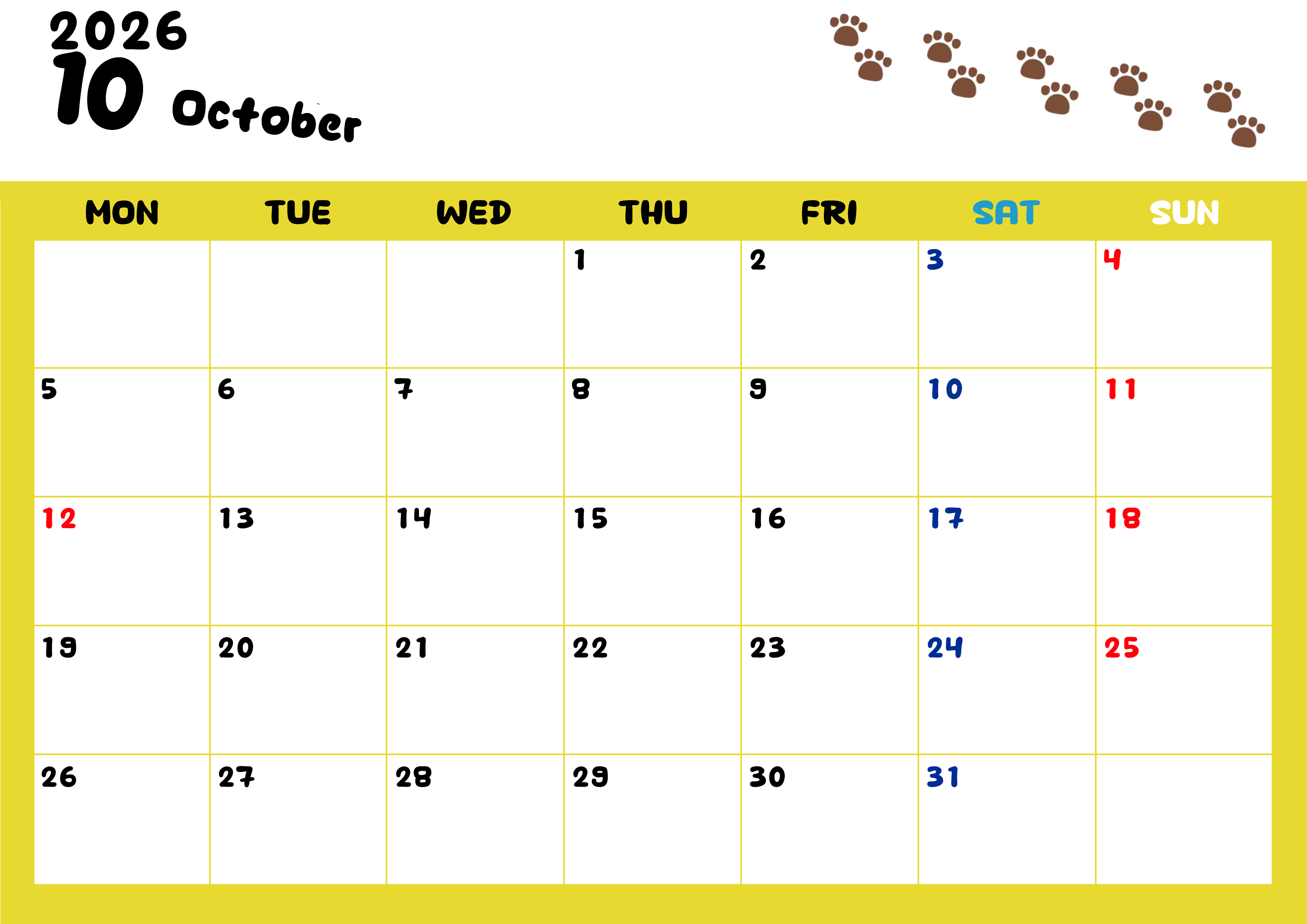 2026年・無料のカレンダーテンプレート 2026年10月カレンダーは横型月曜始まりで無料!ねこのベージュぷにぷに肉球イラストがほっこりかわいい!(2026-01241001) 素材状デザイン王 2025年4月9日 2026年10月カレンダーは横型月曜始まり始まりで無料です。ねこのベージュぷにぷに肉球イラストがほっこりかわいいので無料ダウンロードしてカラー印刷しませんか?イエローとベージュの組み合わせがおしゃれかわいいデザインです。(2026-01241001) かわいい 10月 猫 横型のカレンダー 月曜始まり カレンダーデザイン-0124