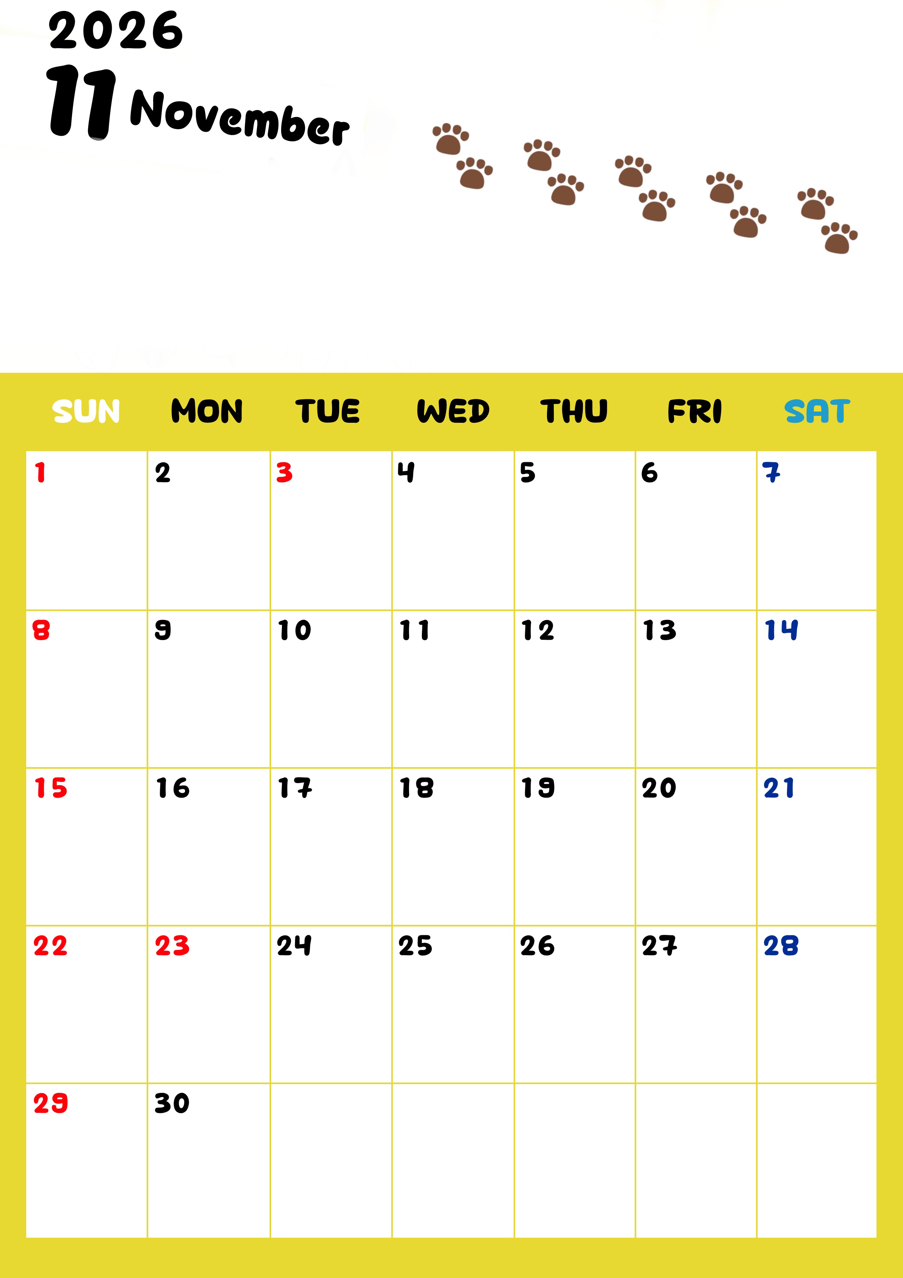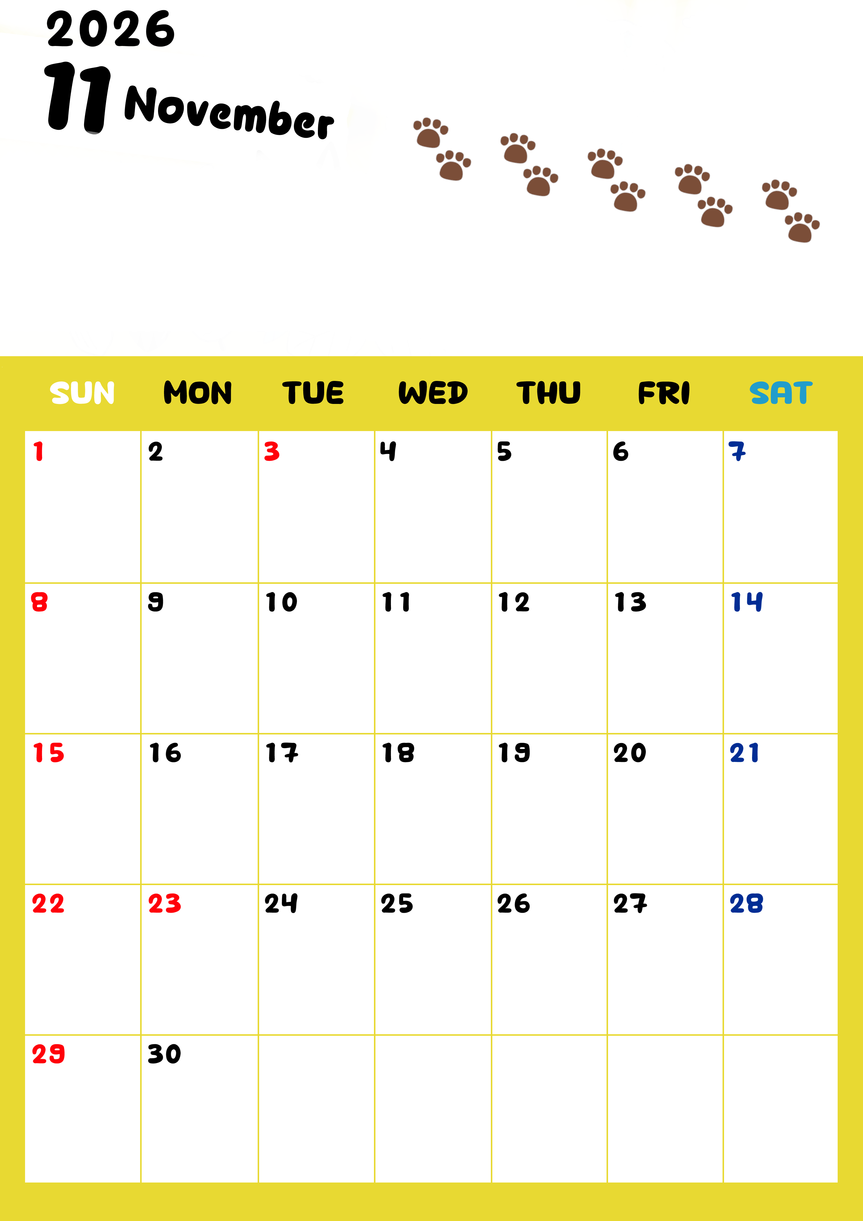 2026年11月カレンダーは縦型日曜始まり始まりで無料です。ねこのベージュぷにぷに肉球イラストがほっこりかわいいので無料ダウンロードしてカラー印刷しませんか?イエローとベージュの組み合わせがおしゃれかわいいデザインです。(2026-01241110)