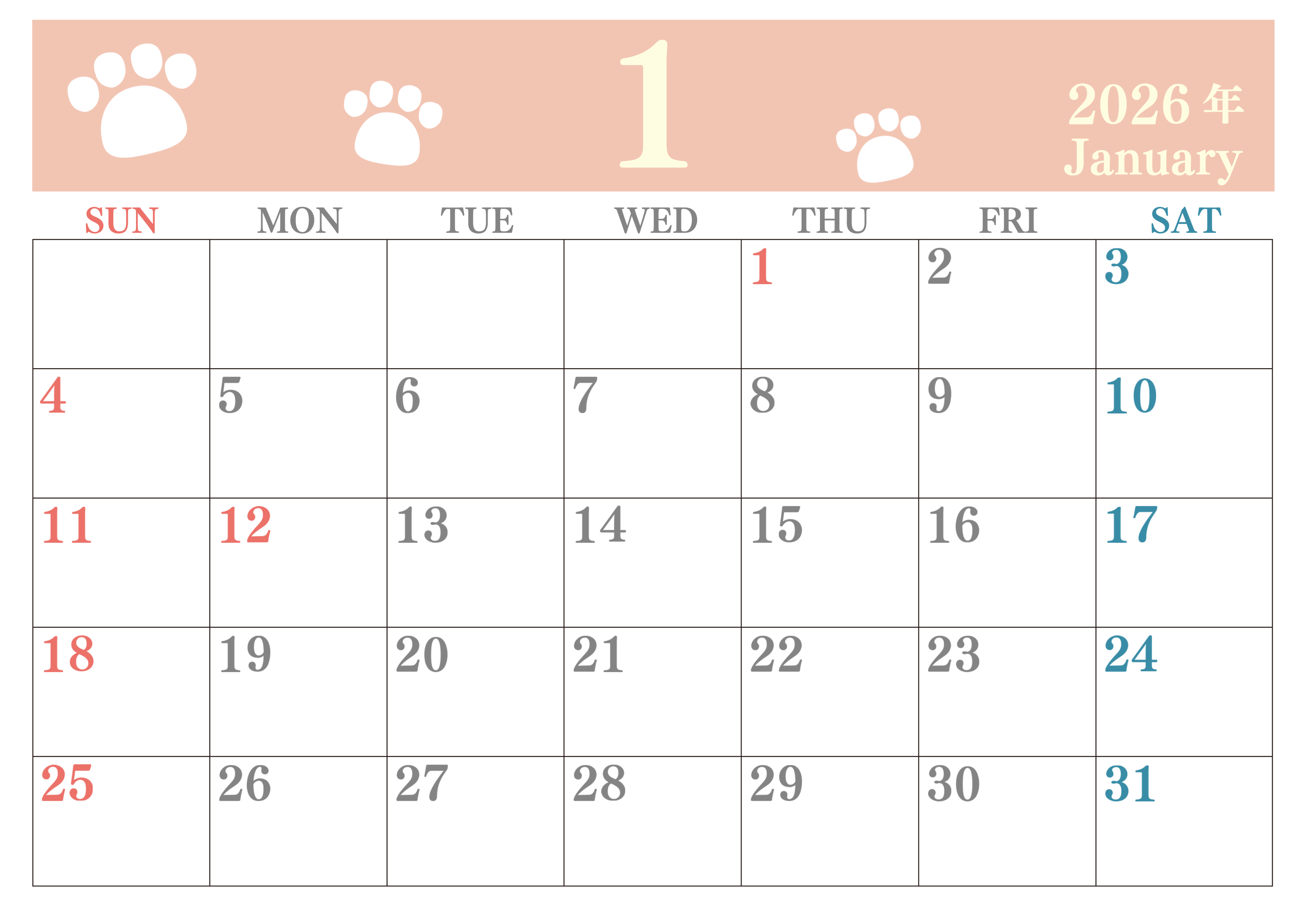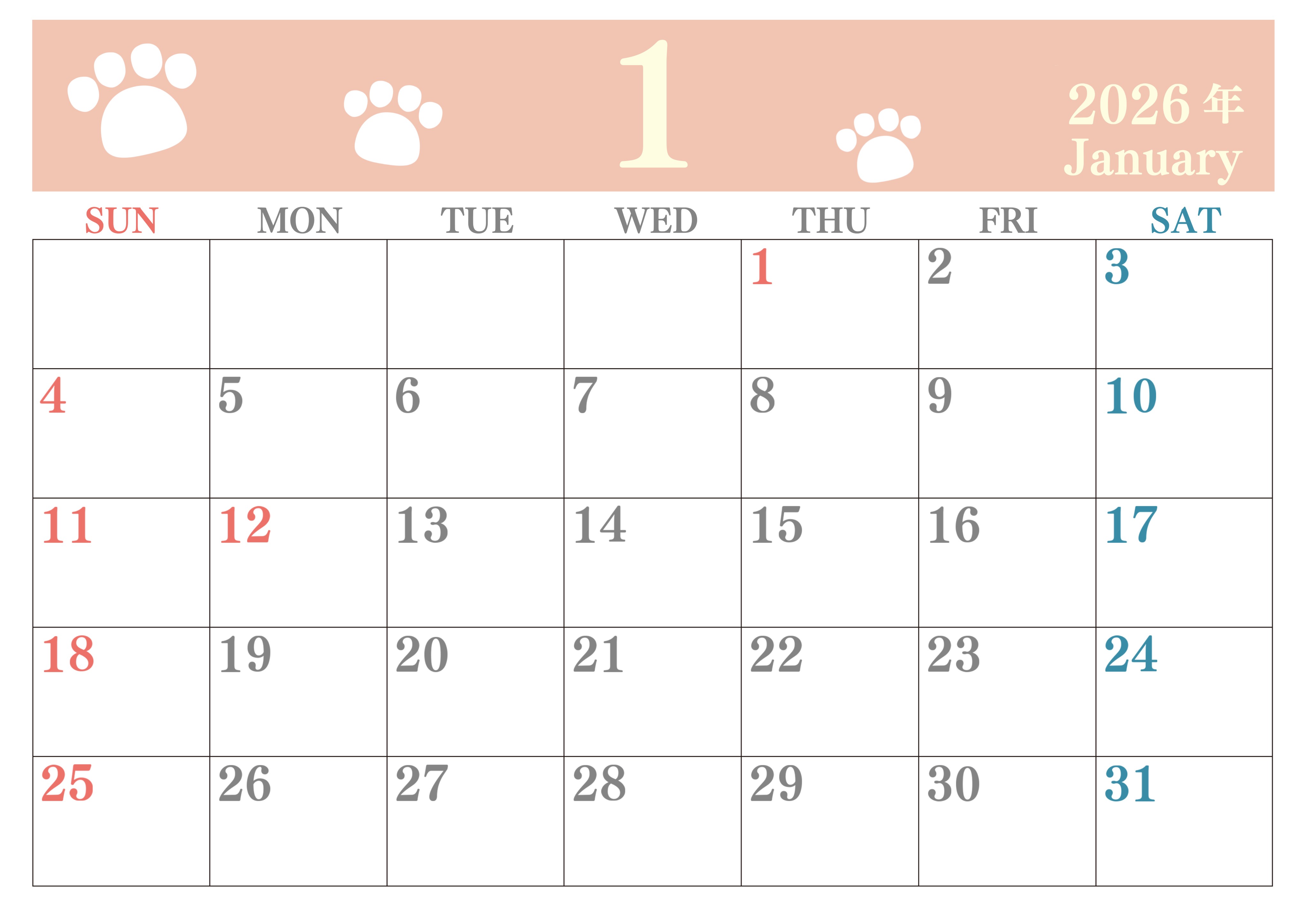 2026年・無料のカレンダーテンプレート 2026年1月カレンダーは横型日曜始まりで猫の肉球がゆるかわいいレイアウト!無料かつ自由に予定を書き込めます!(2026-01250100) 素材状デザイン王 2025年4月9日 2026年1月カレンダーは横型日曜始まりで猫の肉球がゆるかわいいレイアウトです。無料かつ自由に予定を書き込めます。ダウンロードしてすぐに印刷利用しませんか?(2026-01250100) かわいい 1月 猫 横型のカレンダー 日曜始まり カレンダーデザイン-0125
