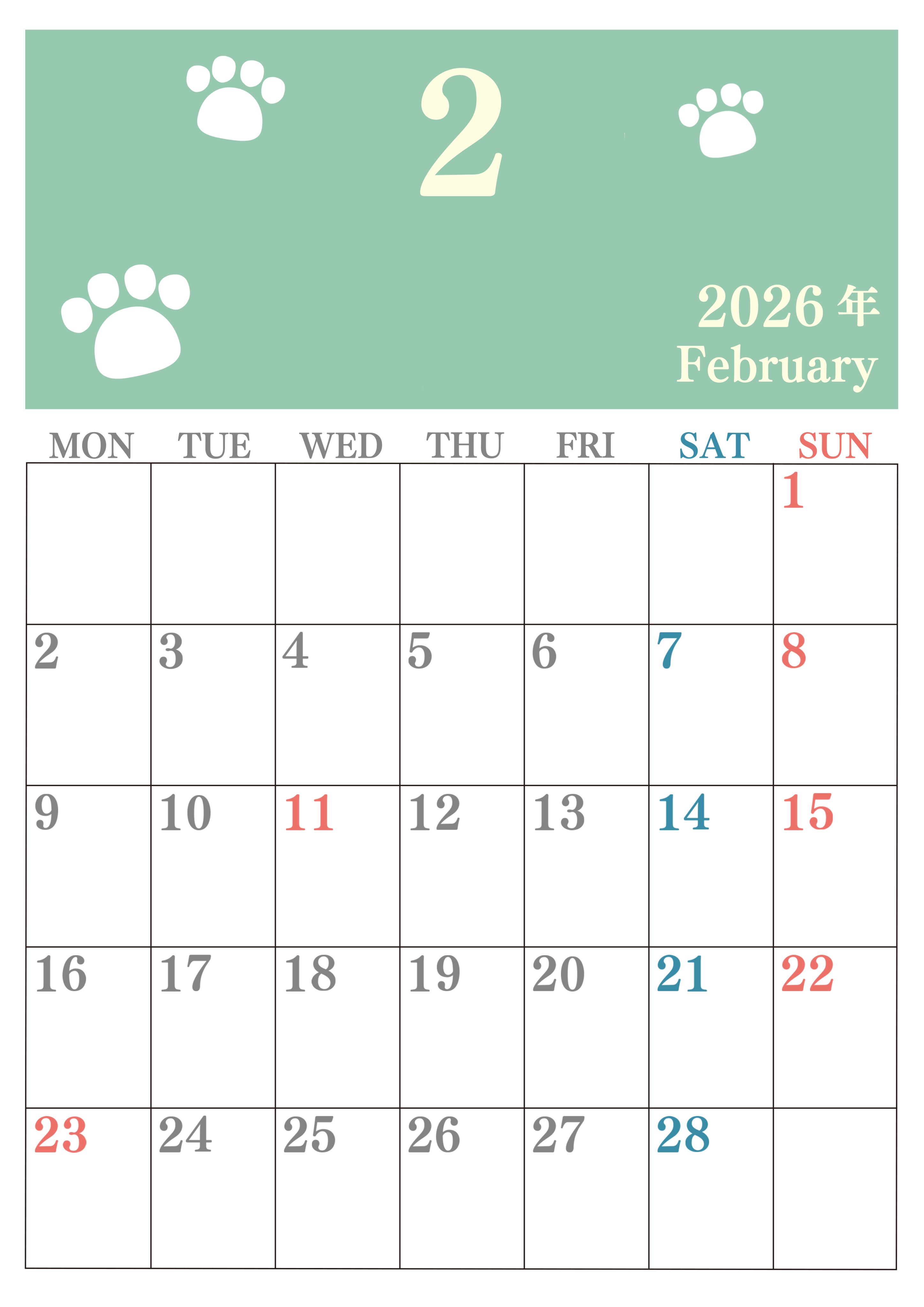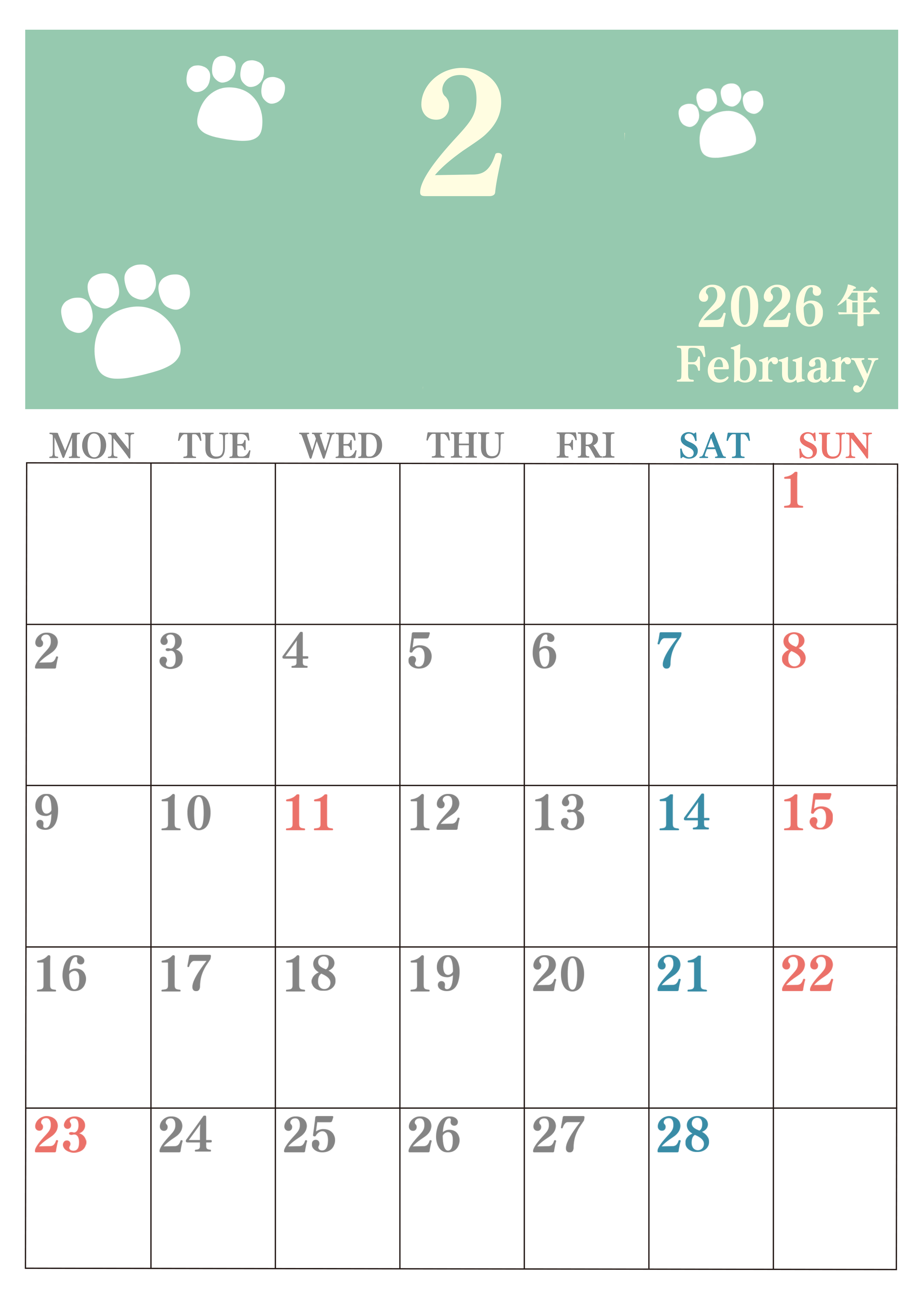 2026年2月カレンダーは縦型月曜始まりで猫の肉球がゆるかわいいレイアウトです。無料かつ自由に予定を書き込めます。ダウンロードしてすぐに印刷利用しませんか?(2026-01250211)