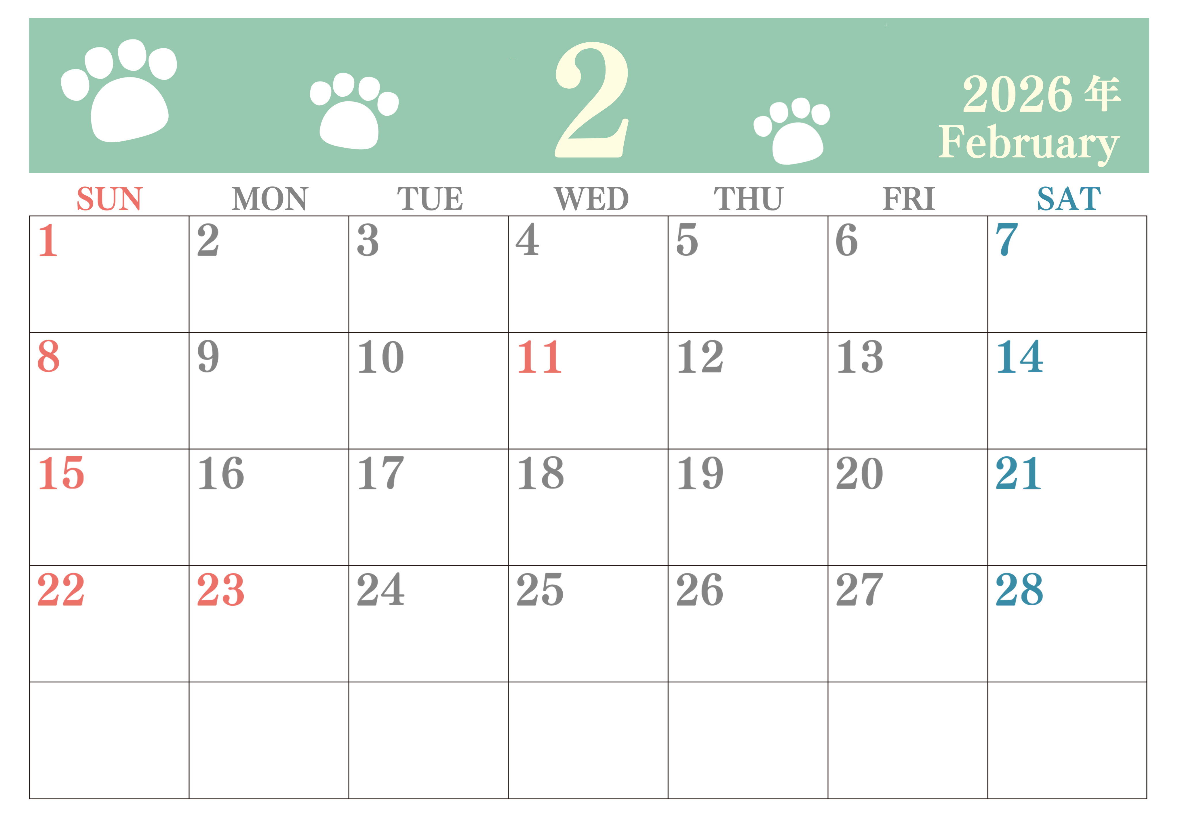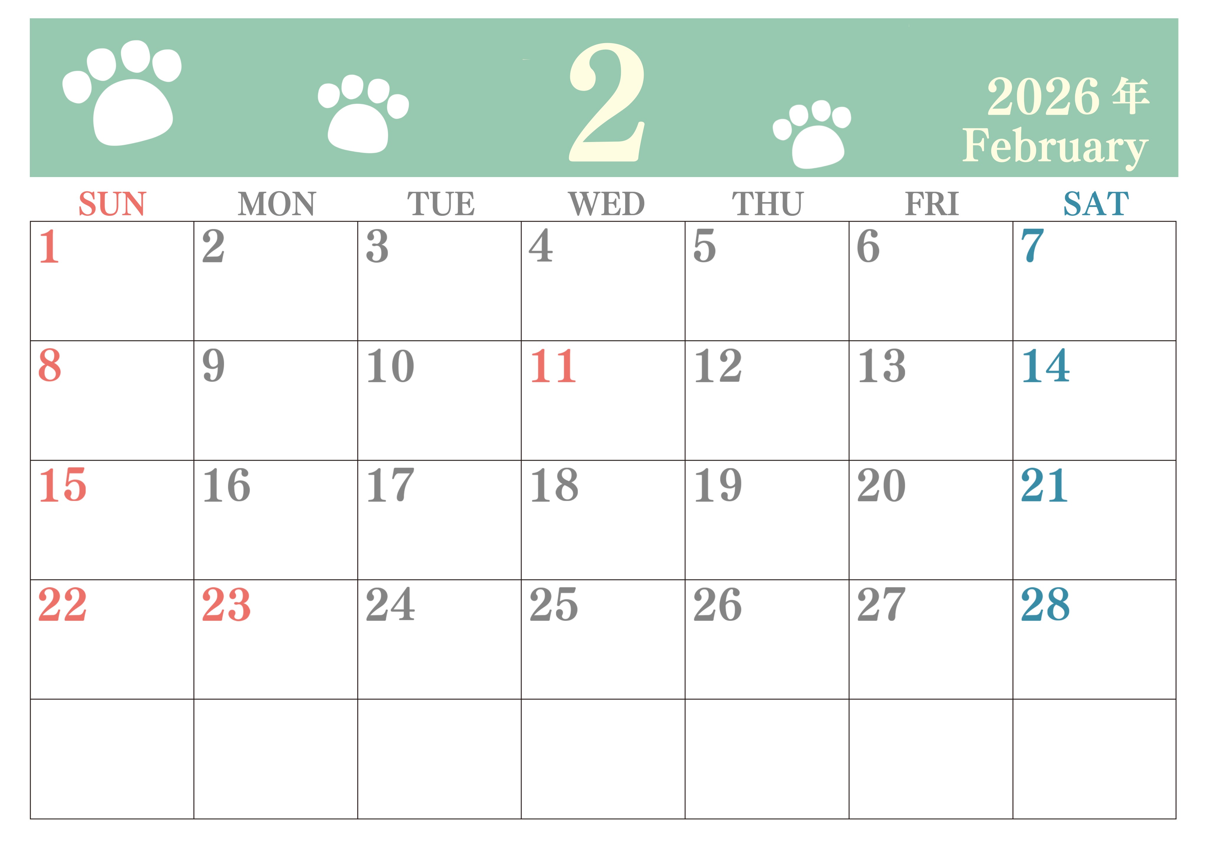 2026年・無料のカレンダーテンプレート 2026年2月カレンダーは横型日曜始まりで猫の肉球がゆるかわいいレイアウト!無料かつ自由に予定を書き込めます!(2026-01250200) 素材状デザイン王 2025年4月9日 2026年2月カレンダーは横型日曜始まりで猫の肉球がゆるかわいいレイアウトです。無料かつ自由に予定を書き込めます。ダウンロードしてすぐに印刷利用しませんか?(2026-01250200) かわいい 2月 猫 横型のカレンダー 日曜始まり カレンダーデザイン-0125