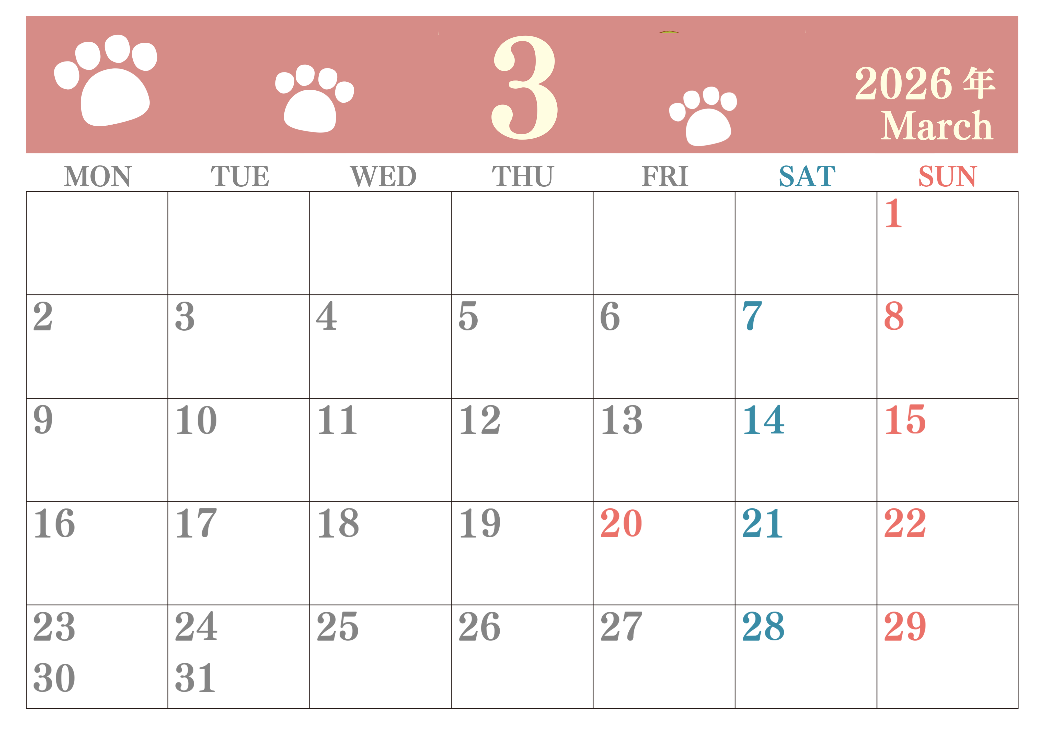 2026年3月カレンダーは横型月曜始まりで猫の肉球がゆるかわいいレイアウト!無料かつ自由に予定を書き込めます!(2026-01250301)