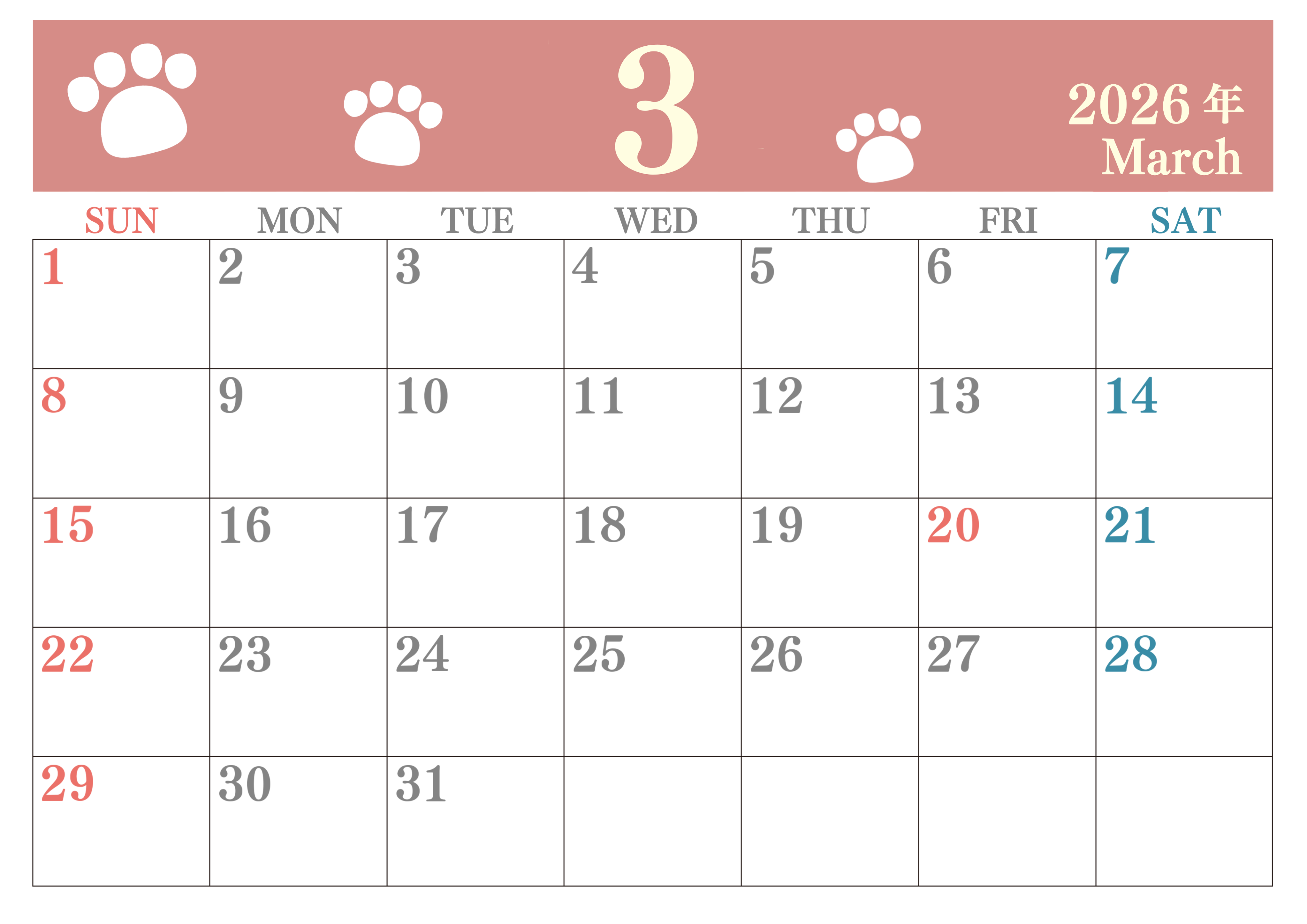 2026年・無料のカレンダーテンプレート 2026年3月カレンダーは横型日曜始まりで猫の肉球がゆるかわいいレイアウト!無料かつ自由に予定を書き込めます!(2026-01250300) 素材状デザイン王 2025年4月9日 2026年3月カレンダーは横型日曜始まりで猫の肉球がゆるかわいいレイアウトです。無料かつ自由に予定を書き込めます。ダウンロードしてすぐに印刷利用しませんか?(2026-01250300) かわいい 3月 猫 横型のカレンダー 日曜始まり カレンダーデザイン-0125