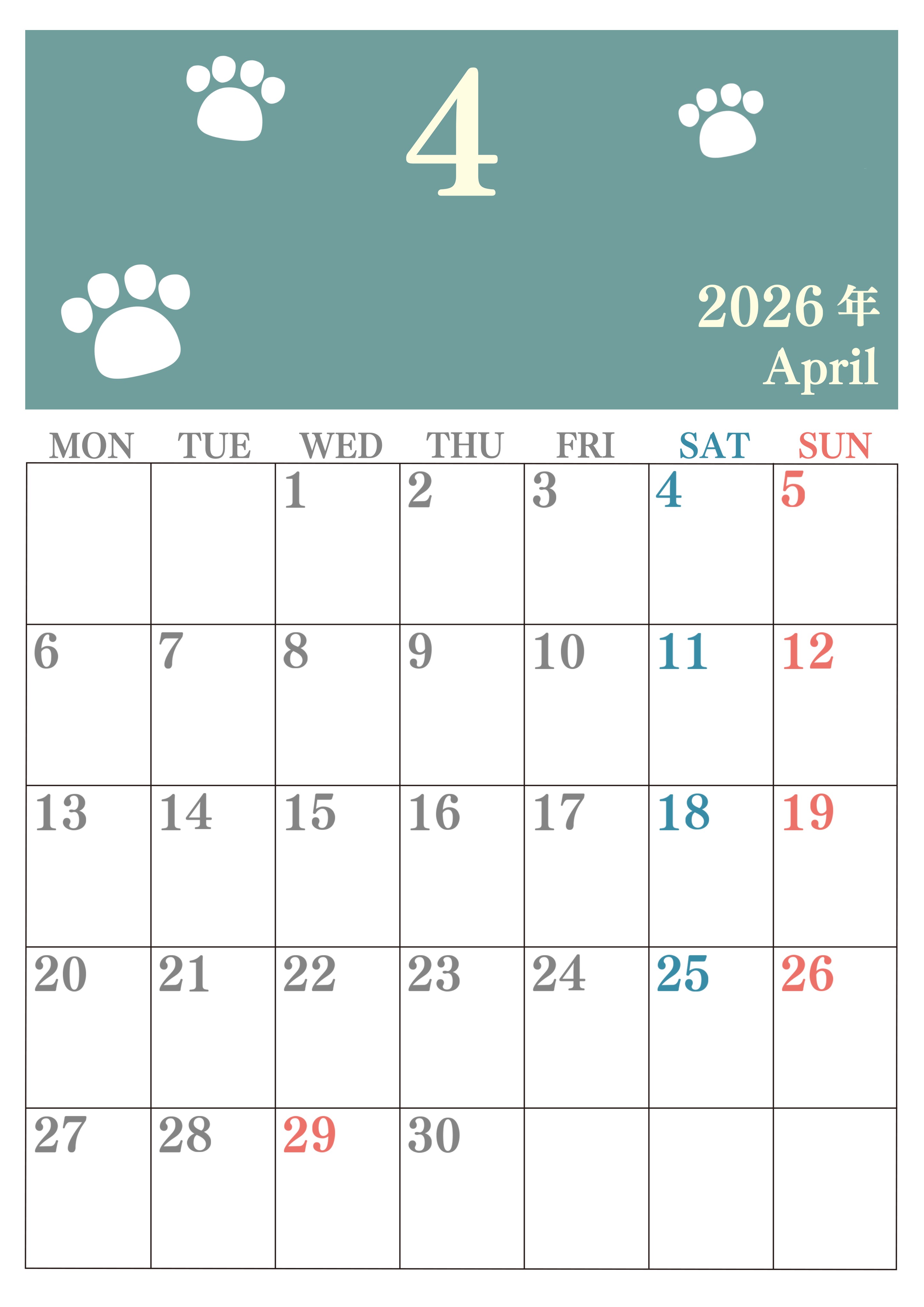 2026年・無料のカレンダーテンプレート 2026年4月カレンダーは縦型月曜始まりで猫の肉球がゆるかわいいレイアウト!無料かつ自由に予定を書き込めます!(2026-01250411) 素材状デザイン王 2025年4月9日 2026年4月カレンダーは縦型月曜始まりで猫の肉球がゆるかわいいレイアウトです。無料かつ自由に予定を書き込めます。ダウンロードしてすぐに印刷利用しませんか?(2026-01250411) かわいい 4月 猫 縦型のカレンダー 月曜始まり カレンダーデザイン-0125
