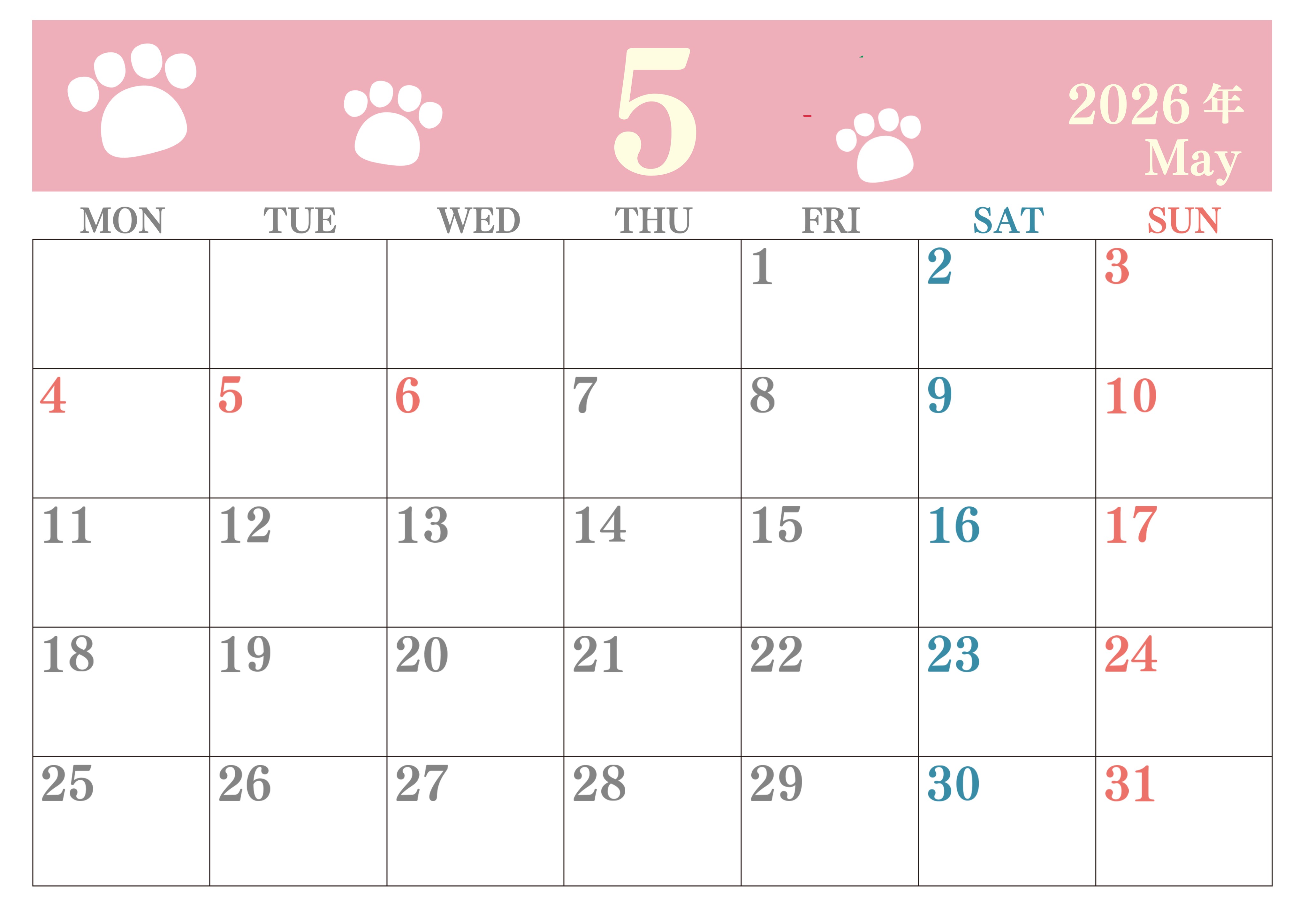2026年・無料のカレンダーテンプレート 2026年5月カレンダーは横型月曜始まりで猫の肉球がゆるかわいいレイアウト!無料かつ自由に予定を書き込めます!(2026-01250501) 素材状デザイン王 2025年4月9日 2026年5月カレンダーは横型月曜始まりで猫の肉球がゆるかわいいレイアウトです。無料かつ自由に予定を書き込めます。ダウンロードしてすぐに印刷利用しませんか?(2026-01250501) かわいい 5月 猫 横型のカレンダー 月曜始まり カレンダーデザイン-0125