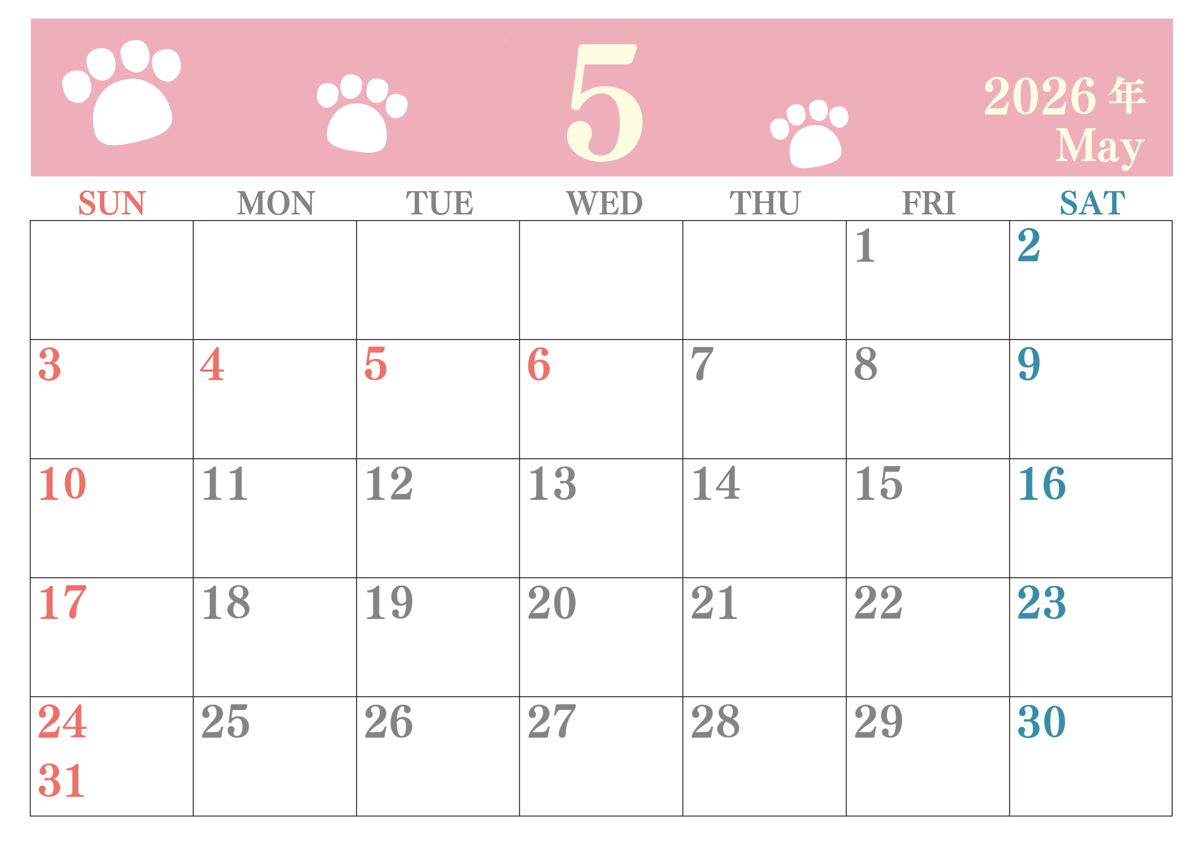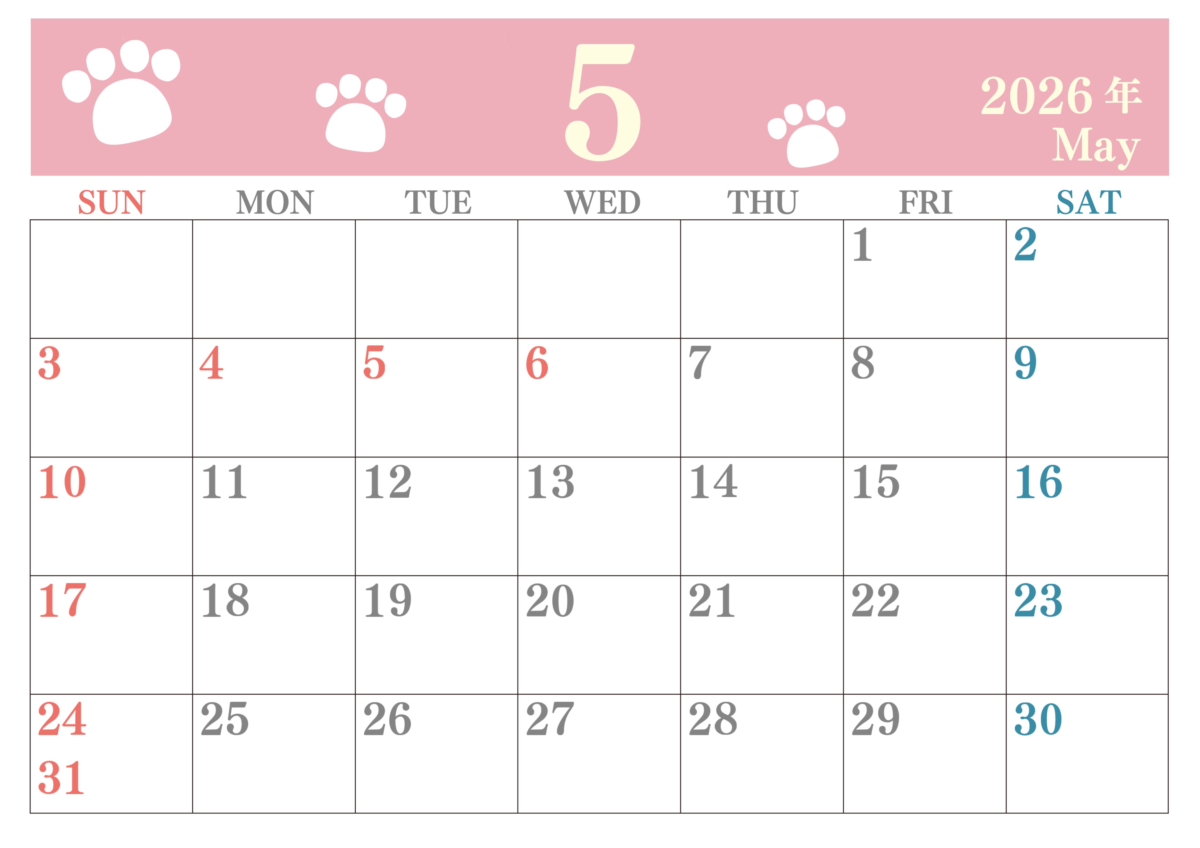 2026年5月カレンダーは横型日曜始まりで猫の肉球がゆるかわいいレイアウト!無料かつ自由に予定を書き込めます!(2026-01250500)
