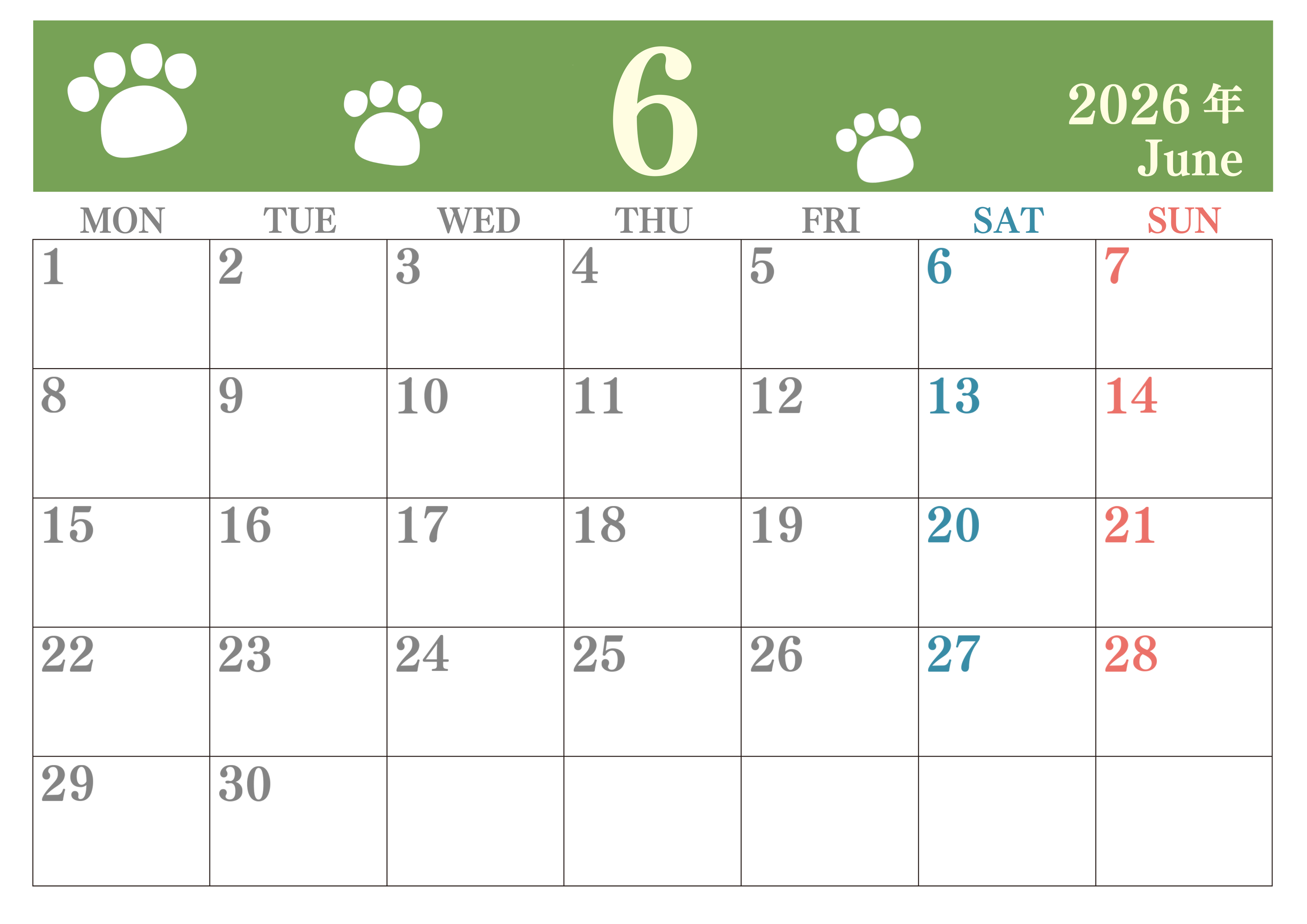 2026年・無料のカレンダーテンプレート 2026年6月カレンダーは横型月曜始まりで猫の肉球がゆるかわいいレイアウト!無料かつ自由に予定を書き込めます!(2026-01250601) 素材状デザイン王 2025年4月9日 2026年6月カレンダーは横型月曜始まりで猫の肉球がゆるかわいいレイアウトです。無料かつ自由に予定を書き込めます。ダウンロードしてすぐに印刷利用しませんか?(2026-01250601) かわいい 6月 猫 横型のカレンダー 月曜始まり カレンダーデザイン-0125