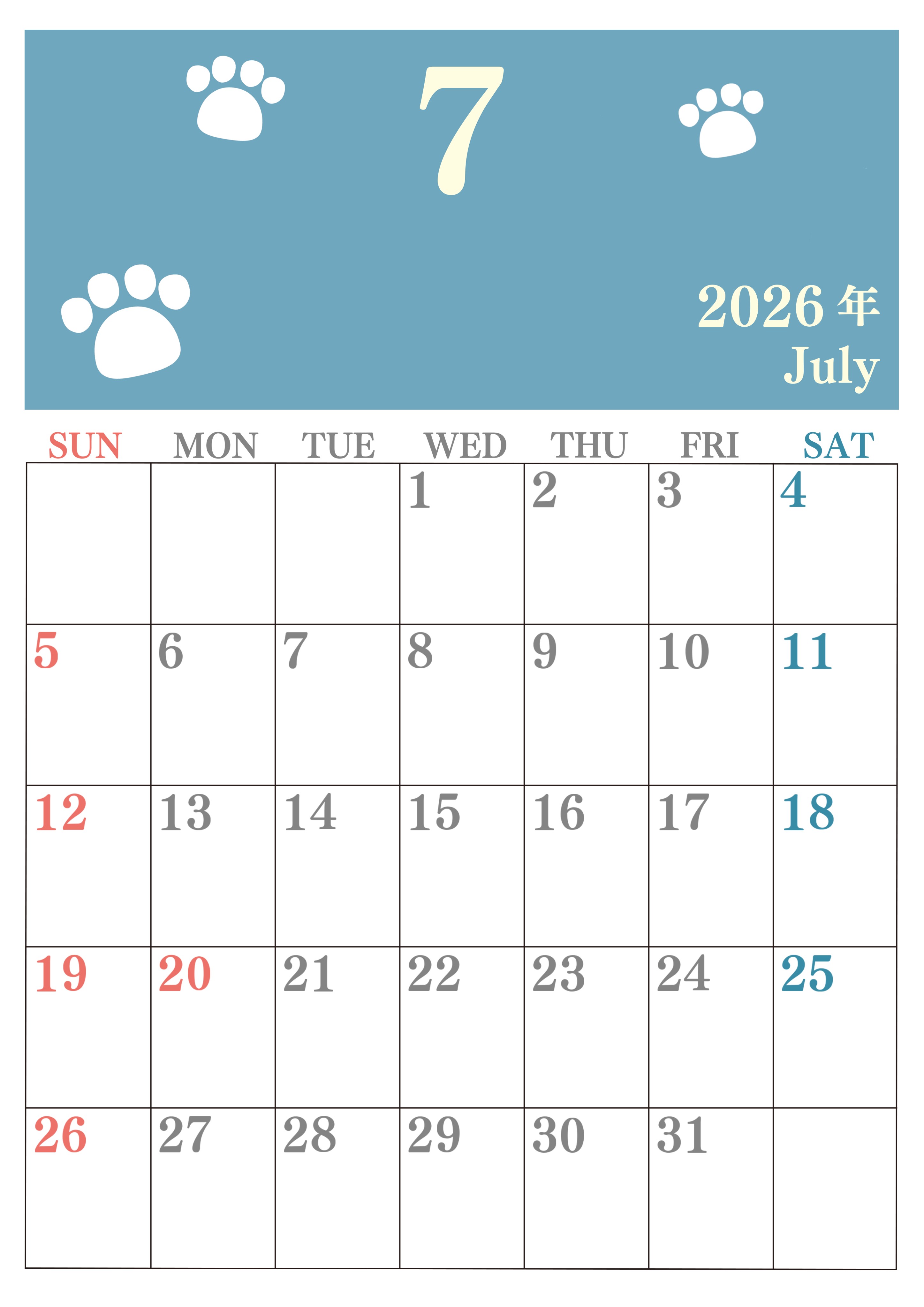 2026年7月カレンダーは縦型日曜始まりで猫の肉球がゆるかわいいレイアウトです。無料かつ自由に予定を書き込めます。ダウンロードしてすぐに印刷利用しませんか?(2026-01250710)