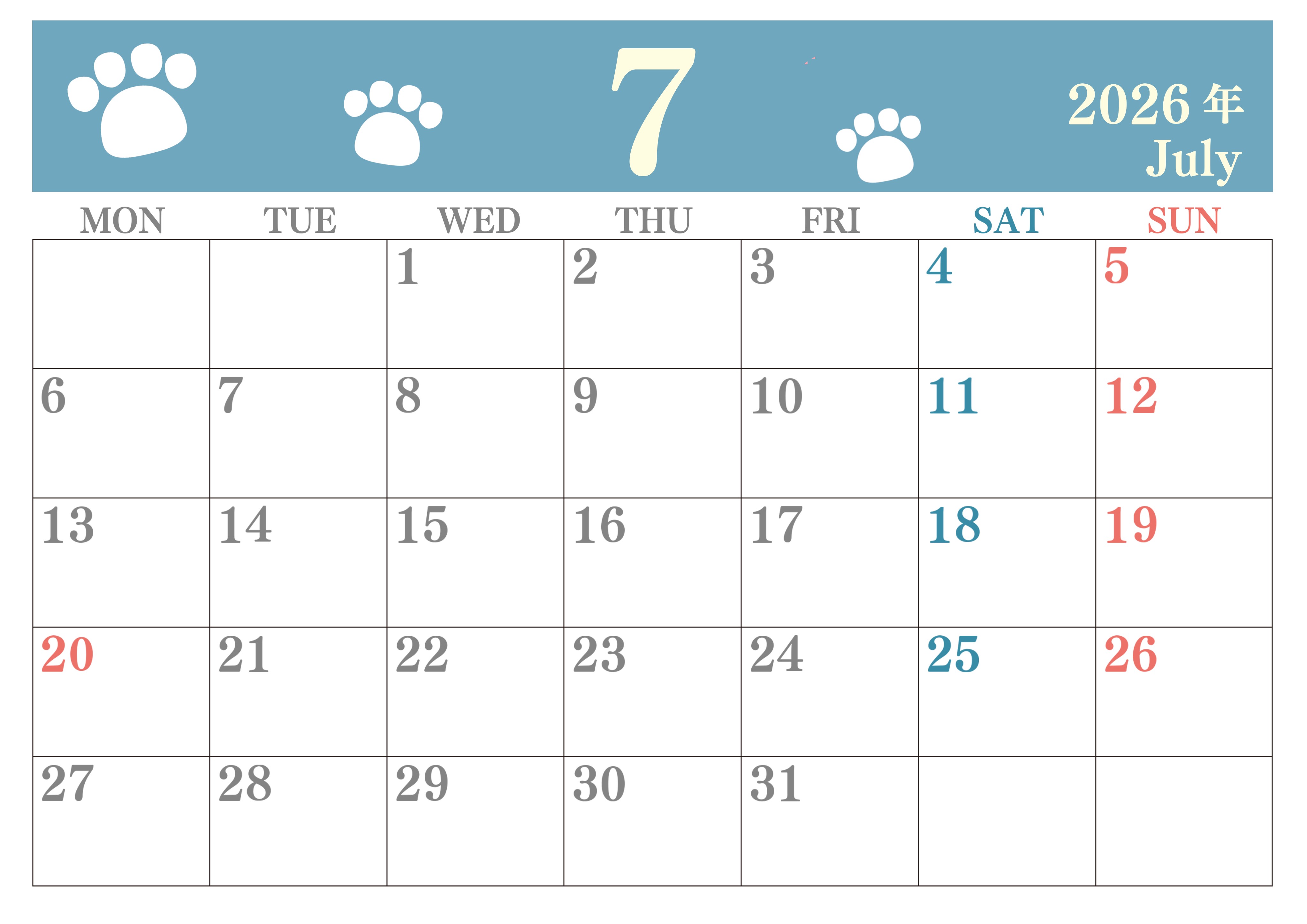 2026年・無料のカレンダーテンプレート 2026年7月カレンダーは横型月曜始まり で猫の肉球がゆるかわいいレイアウト!無料かつ自由に予定を書き込めます!(2026-01250701) 素材状デザイン王 2025年4月9日 2026年7月カレンダーは横型月曜始まりで猫の肉球がゆるかわいいレイアウトです。無料かつ自由に予定を書き込めます。ダウンロードしてすぐに印刷利用しませんか?(2026-01250701) かわいい 7月 猫 横型のカレンダー 月曜始まり カレンダーデザイン-0125