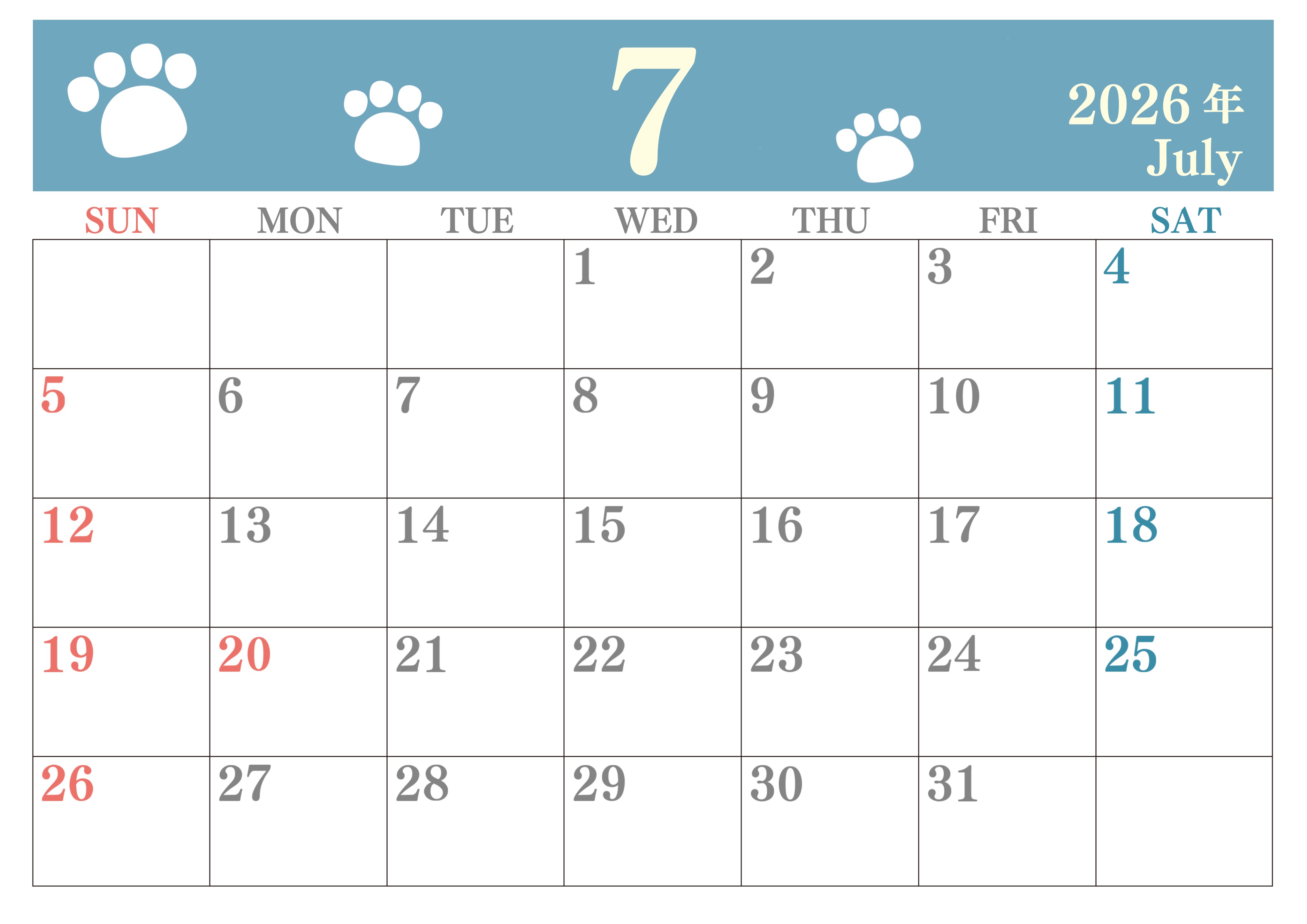 2026年・無料のカレンダーテンプレート 2026年7月カレンダーは横型日曜始まりで猫の肉球がゆるかわいいレイアウト!無料かつ自由に予定を書き込めます!(2026-01250700) 素材状デザイン王 2025年4月9日 2026年7月カレンダーは横型日曜始まりで猫の肉球がゆるかわいいレイアウトです。無料かつ自由に予定を書き込めます。ダウンロードしてすぐに印刷利用しませんか?(2026-01250700) かわいい 7月 猫 横型のカレンダー 日曜始まり カレンダーデザイン-0125